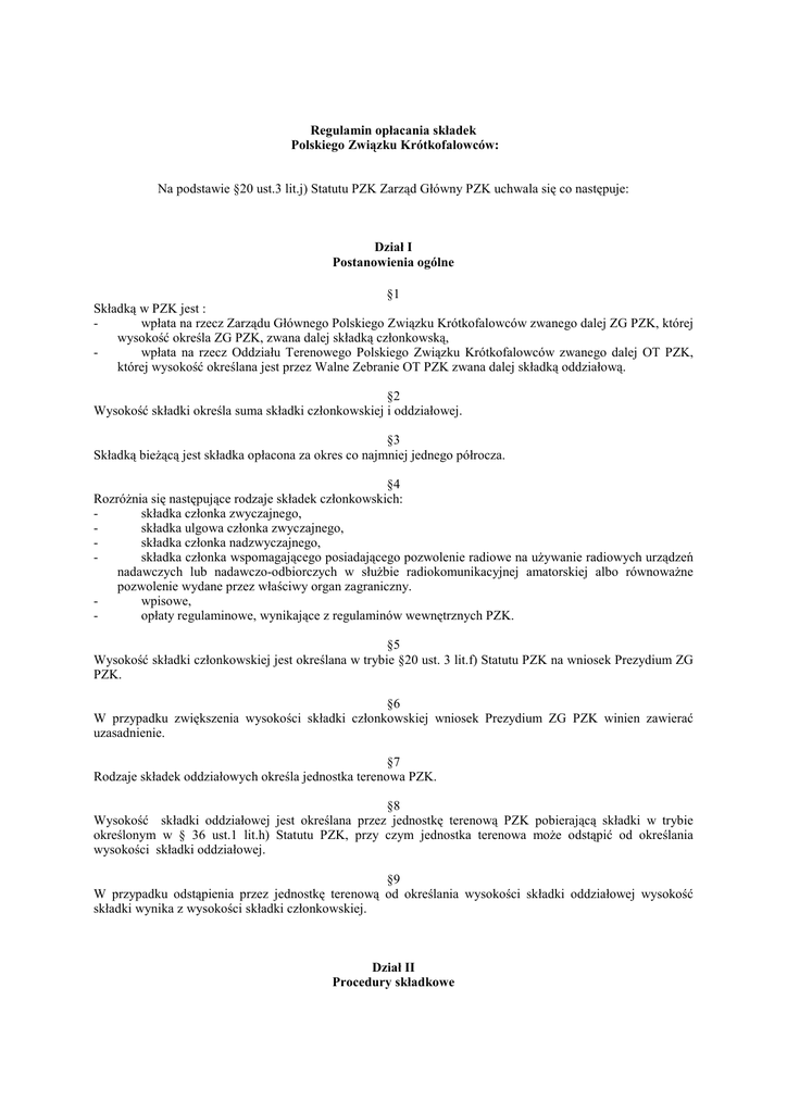 Regulamin opłacania składek Polskiego Związku Krótkofalowców: Na podstawie §20 ust.3 lit.j) Statutu PZK Zarząd Główny PZK uchwala się co następuje: Dział I Postanowienia ogólne §1 Składką w PZK jest : wpłata na rzecz Zarządu Głównego Polskiego Związku Krótkofalowców zwanego dalej ZG PZK, której wysokość określa ZG PZK, zwana dalej składką członkowską, wpłata na rzecz Oddziału Terenowego Polskiego Związku Krótkofalowców zwanego dalej OT PZK, której wysokość określana jest przez Walne Zebranie OT PZK zwana dalej składką oddziałową. §2 Wysokość składki określa suma składki członkowskiej i oddziałowej. §3 Składką bieŜącą jest składka opłacona za okres co najmniej jednego półrocza. §4 RozróŜnia się następujące rodzaje składek członkowskich: składka członka zwyczajnego, składka ulgowa członka zwyczajnego, składka członka nadzwyczajnego, składka członka wspomagającego posiadającego pozwolenie radiowe na uŜywanie radiowych urządzeń nadawczych lub nadawczo-odbiorczych w słuŜbie radiokomunikacyjnej amatorskiej albo równowaŜne pozwolenie wydane przez właściwy organ zagraniczny. wpisowe, opłaty regulaminowe, wynikające z regulaminów wewnętrznych PZK. §5 Wysokość składki członkowskiej jest określana w trybie §20 ust. 3 lit.f) Statutu PZK na wniosek Prezydium ZG PZK. §6 W przypadku zwiększenia wysokości składki członkowskiej wniosek Prezydium ZG PZK winien zawierać uzasadnienie. §7 Rodzaje składek oddziałowych określa jednostka terenowa PZK. §8 Wysokość składki oddziałowej jest określana przez jednostkę terenową PZK pobierającą składki w trybie określonym w § 36 ust.1 lit.h) Statutu PZK, przy czym jednostka terenowa moŜe odstąpić od określania wysokości składki oddziałowej. §9 W przypadku odstąpienia przez jednostkę terenową od określania wysokości składki oddziałowej wysokość składki wynika z wysokości składki członkowskiej. Dział II Procedury składkowe I. Opłata składki przez członka PZK §10 Wpłaty składki mogą być dokonywane wyłącznie do kasy lub na rachunek bankowy OT PZK, do którego członek naleŜy. §11 Wpłatę składki dokonaną do kasy lub na rachunek bankowy OT PZK, do którego członek nie naleŜy, a takŜe do kasy lub na rachunek ZG PZK pozostawia się do wyjaśnienia, zaś składkę traktuje się jako nieopłaconą. §12 Dokumentem potwierdzającym uiszczenie składki jest dowód wpłaty na rachunek bankowy lub dowód wpłaty gotówki - KP do kasy OT PZK, zawierające w tytule wpłaty co najmniej : imię i nazwisko osoby,której składka dotyczy, znak wywoławczy, osoby której składka dotyczy, tytuł opłacanej składki i jej rodzaj (np. składka oddziałowa i członkowska, ulgowa, itp.), wskazanie okresu za jaki składka została uiszczona (np. rok ..., I półrocze roku ..., II rata składki za rok....), §13 W przypadku braku wskazania przez wpłacającego danych określonych w § 12 umoŜliwiających identyfikację osoby, której składka dotyczy wpłatę pozostawia się do wyjaśnienia, zaś składkę traktuje się jako nieopłaconą. II. Ewidencja składek członkowskich §14 Oddziały Terenowe PZK zobowiązane są prowadzić ścisłą ewidencję przyjmowanych składek. §15 Ewidencja składek członkowskich prowadzona przez OT PZK jest wyłączną podstawą do określenia praw i obowiązków członka PZK w sprawach składkowych. §16 Na podstawie prowadzonej ewidencji składek OT PZK sporządzają wykazy członków, którzy uiścili składkę członkowską, ze wskazaniem rodzaju składki członkowskiej oraz okresów, za które została uiszczona. §17 Wzór wykazów stanowi załącznik nr 1 do niniejszego regulaminu. III. Terminy §18 Członkowie PZK są obowiązani uiszczać składkę w terminach określonych przez OT PZK do których naleŜą, a gdy terminy te nie są określone nie później niŜ 7 dni przed terminem przekazania składki członkowskiej przez jednostkę terenową do ZG PZK. §19 Nowy członek PZK dokonuje wpłaty składek najpóźniej w ciągu 7 dni od daty złoŜenia deklaracji. §20 Oddziały Terenowe PZK zobowiązane są do przekazania pobranej od członków składki członkowskiej na rachunek bankowy ZG PZK w terminie : do 21 stycznia za cały rok lub I półrocze tego roku, do 21 lipca za II półrocze tego roku, jednakŜe nie później niŜ w ciągu 30 dni od daty pobrania. §21 W szczególnie uzasadnionych przypadkach Prezydium ZG PZK na wniosek jednostki terenowej moŜe dokonać wydłuŜenia terminów określonych w §20, przy czym nie więcej niŜ o 30 dni, o czym powiadamia Zarząd Główny PZK na najbliŜszym posiedzeniu. IV Przekazanie składek §22 Przekazanie składki przez OT PZK polega na dokonaniu wpłaty lub przelewu na rachunek bankowy ZG PZK kwoty odpowiadającej wysokości pobranych składek członkowskich oraz przesłaniu do Sekretariatu ZG PZK wykazów określonych w § 15 wraz z kopią dowodu wpłaty lub kopią przelewu na rachunek bankowy ZG PZK §23 Wpłata lub przelew na rachunek bankowy ZG PZK winna być dokonywana jednorazowo w kwocie zgodnej z wykazem określonym w §15. §24 W przypadku stwierdzenia rozbieŜności pomiędzy wysokością przekazanej kwoty, a wykazem określonym w §15, a takŜe w przypadku umieszczenia na wykazie nowego członka bez przekazania wpisowego Prezydium ZG PZK w terminie 14 dni od przekazania składki wzywa OT PZK do złoŜenia wyjaśnień i dokonania korekty. §25 Do dnia złoŜenia wyjaśnień i dokonania korekty, składki członkowskie przekazane przez OT PZK nie są uwzględniane w ewidencji składkowej prowadzonej przez Sekretariat ZG PZK. §26 Wykazy, o których mowa w §15 za zgodą Skarbnika PZK mogą zostać przesyłane drogą elektroniczną. §27 Sekretariat ZG PZK w terminie 14 dni od przekazania składki OT PZK, w przypadku wezwania do złoŜenia wyjaśnień lub korekty w terminie 14 dni od wykonania tych czynności przez OT PZK zobowiąz
