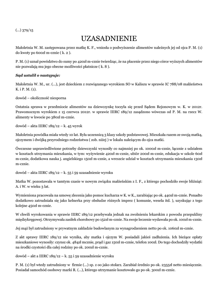 (...) 379/15 UZASADNIENIE Małoletnia W. M. zastępowana przez matkę K. F., wniosła o podwyższenie alimentów należnych jej od ojca P. M. (1) do kwoty po 600zł m-cznie ( k. 2 ). P. M. (1) uznał powództwo do sumy po 420zł m-cznie twierdząc, że na płacenie przez niego córce wyższych alimentów nie pozwalają mu jego obecne możliwości płatnicze ( k. 8 ). Sąd ustalił o następuje: Małoletnia W. M., ur. (...), jest dzieckiem z rozwiązanego wyrokiem SO w Kaliszu w sprawie IC 788/08 małżeństwa K. i P. M. (1). dowód – okoliczność niesporna Ostatnia sprawa w przedmiocie alimentów na dziewczynkę toczyła się przed Sądem Rejonowym w. K. w 2012r. Prawomocnym wyrokiem z 15 czerwca 2012r. w sprawie IIIRC 189/12 zasądzono wówczas od P. M. na rzecz W. alimenty w kwocie po 380zł m-cznie. dowód – akta IIIRC 189/12 – k. 45 wyrok Małoletnia powódka miała wtedy 10 lat. Była uczennicą 3 klasy szkoły podstawowej. Mieszkała razem ze swoją matką, ojczymem i dwójką przyrodniego rodzeństwa ( zob. niżej ) w lokalu należącym do ojca matki. Ówczesne usprawiedliwione potrzeby dziewczynki wynosiły co najmniej po ok. 1000zł m-cznie, łącznie z udziałem w kosztach utrzymania mieszkania, w tym: wyżywienie 420zł m-cznie, ubiór 200zł m-cznie, edukacja w szkole 60zł m-cznie, dodatkowa nauka j. angielskiego 150zł m-cznie, a wreszcie udział w kosztach utrzymania mieszkania 130zł m-cznie. dowód – akta IIIRC 189/12 – k. 55 i 59 uzasadnienie wyroku Matka W. pozostawała w tamtym czasie w nowym związku małżeńskim z I. F., z którego pochodziło swoje bliźniąt: A. i W. w wieku 3 lat. Wymieniona pracowała na umowę zlecenia jako pomoc kucharza w K. w K., zarabiając po ok. 440zł m-cznie. Ponadto dodatkowo zatrudniała się jako kelnerka przy obsłudze różnych imprez ( komunie, wesela itd. ), uzyskując z tego kolejne 450zł m-cznie. W chwili wyrokowania w sprawie IIIRC 189/12 przebywała jednak na zwolnieniu lekarskim z powodu przepukliny międzykręgowej. Otrzymywała zasiłek chorobowy po 152zł m-cznie. Na swoje leczenie wydawała po ok. 100zł m-cznie. Jej mąż był zatrudniony w prywatnym zakładzie budowlanym za wynagrodzeniem netto po ok. 1060zł m-cznie. Z akt sprawy IIIRC 189/12 nie wynika, aby matka i ojczym W. posiadali jakieś zadłużenia. Ich bieżące opłaty mieszkaniowe wynosiły: czynsz ok. 484zł mcznie, prąd i gaz 150zł m-cznie, telefon 100zł. Do tego dochodziły wydatki na środki czystości dla całej rodziny po ok. 200zł m-cznie. dowód – akt a IIIRC 189/12 – k. 55 i 59 uzasadnienie wyroku P. M. (1) był wtedy zatrudniony w firmie (...) sp. z oo jako stolarz. Zarabiał średnio po ok. 2355zł netto miesięcznie. Posiadał samochód osobowy marki R. (...), którego utrzymanie kosztowało go po ok. 300zł m-cznie. Kwotą po 100zł m-cznie spłacał zadłużenie, które powstało w czasie gdy był bezrobotny. Był też obciążony obowiązkiem alimentacyjnym na rzecz syna w wysokości po 210zł m-cznie. Na swoje własne wyżywienie wydawał po ok. 400zł m-cznie, na odzież dalsze 200zł m-cznie. Chorował na żylaki. Przygotowywał się do ich operacyjnego usunięcia. Mieszkał razem z konkubiną E. B. oraz dwójką jej małoletnich dzieci ( W. lat 16 i M. lat 6 ) w swoim lokalu kwaterunkowym przy ul. (...) w K.. Na koszty utrzymania tego mieszkania składały się: czynsz 477zł m-cznie, prąd 75zł m-cznie, gaz ok. 60zł m-cznie, opał na sezon grzewczy ok. 200zł m-cznie. Konkubina pozwanego pracowała w C. K.. Pozwany twierdził, że nie znał wysokości jej dochodów. Wymieniona była wtedy z nim w ciąży ( ich dziecko miało urodzić się w lipcu 2012r. ). dowód – akta IIIRC 189/12 – k. 56-57 uzasadnienie wyroku Ferując wyrok w sprawie IIIRC 189/12 SR w Kaliszu stanął na stanowisku, że pozwany celowo ukrywał informacje istotne dla oceny jego ówczesnej sytuacji materialnej, zwłaszcza dot. dochodów swojej konkubiny, aby uchronić się przed podwyżką alimentów na rzecz W.. Równocześnie Sąd nie podzielił poglądu pozwanego w przedmiocie obowiązku ponoszenia przez niego całych kosztów utrzymania mieszkania. Sąd uznał bowiem, że jego konkubina powinna partycypować w nich, w zakresie dotyczącym siebie oraz jej dwojga dzieci. Sąd zwrócił też uwagę, że zgodnie z utrwalonym poglądem judykatury, przy ocenie możliwości płatniczych pozwanego w zakresie alimentów na W., nie należało brać pod uwagę jego zobowiązań kredytowych. Wreszcie Sąd ocenił, że ciąża konkubiny pozwanego i pojawienie się jego kolejnego dziecka, nie może skutkować pozbawieniem W. należnych jej od ojca świadczeń, tym bardziej, że poza płaceniem dotychczasowych alimentów nie uczestniczy on w jakikolwiek sposób w jej życiu i wychowywaniu, nie interesuje się nią, nie daje córce żadnych upominków, nie utrzymuje nawet z dziewczynką kontaktów. dowód – akta IIIRC 189/12 – k. 58 na górze, k. 60, k. 61 uzasadnienie wyroku Wywody Sądu Rejonowego jak wyżej spotkały się z pełną akceptacją Sądu Okręgowego w Kaliszu, który oddalił apelację pozwanego od wyroku z 15 czerwca 2012r. w sprawie IIIRC 189/12. dowód – akta IIIRC 189/12 – k. 86 wyrok SO Kalisz Aktualnie małoletnia powódka liczy sobie 13 lat. O września b.r. jest uczennicą I klasy gimnazjum. Mieszka nadal z matką i dwójką swojego przyrodniego rodzeństwa. Cała trójka tych dzieci jest wychowywana tylko przez matkę, gdyż ojciec A. i W. zmarł. Nie otrzymują oni po nim renty rodzinnej, bo nie miał dostatecznej liczby lat pracy. Matka W. w dalszym ciągu pracuje dorywczo jako kelnerka w lokalach w K.. W ostatnim miesiącu zarobiła w ten sposób 160zł. Ma problemy ze znalezieniem stałej pracy, albowiem oferty zatrudnienia opiewają na pracę także w godzinach wieczorowo-nocnych z uwagi na charakter lokali. Tymczasem ona nie ma z kim zostawić wtedy swoich trojga dzieci, nie może korzystać z pomocy swoich krewnych.