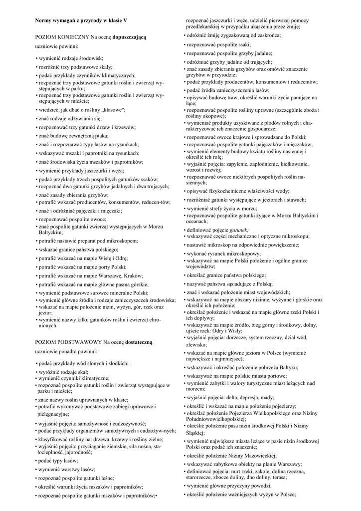 Normy wymagań z przyrody w klasie V POZIOM KONIECZNY Na ocenę dopuszczającą uczniowie powinni: • wymienić rodzaje środowisk; • rozróżnić trzy podstawowe skały; • podać przykłady czynników klimatycznych; • rozpoznać trzy podstawowe gatunki roślin i zwierząt występujących w parku; • rozpoznać trzy podstawowe gatunki roślin i zwierząt występujących w mieście; • wiedzieć, jak dbać o rośliny „klasowe"; • znać rodzaje odżywiania się; • rozpoznawać trzy gatunki drzew i krzewów; • znać budowę zewnętrzną ptaka; • znać i rozpoznawać typy lasów na rysunkach; • wskazywać mszaki i paprotniki na rysunkach; • znać środowiska życia mszaków i paprotników; • wymienić przykłady jaszczurki i węża; • podać przykłady trzech pospolitych gatunków ssaków; • rozpoznać dwa gatunki grzybów jadalnych i dwa trujących; • znać zasady zbierania grzybów; • potrafić wskazać producentów, konsumentów, reducen-tów; • znać i odróżniać pajęczaki i mięczaki; • rozpoznawać pospolite owoce; • znać pospolite gatunki zwierząt występujących w Morzu Bałtyckim; • potrafić nastawić preparat pod mikroskopem; • wskazać granice państwa polskiego; • potrafić wskazać na mapie Wisłę i Odrę; • potrafić wskazać na mapie porty Polski; rozpoznać jaszczurki i węże, udzielić pierwszej pomocy przedlekarskiej w przypadku ukąszenia przez żmiję; • odróżnić żmiję zygzakowatą od zaskrońca; • rozpoznawać pospolite ssaki; • rozpoznawać pospolite grzyby jadalne; • odróżniać grzyby jadalne od trujących; • znać zasady zbierania grzybów oraz omówić znaczenie grzybów w przyrodzie; • podać przykłady producentów, konsumentów i reducentów; • podać źródła zanieczyszczenia lasów; • opisywać budowę traw, określić warunki życia panujące na łące; • rozpoznawać pospolite rośliny uprawne (szczególnie zboża i rośliny okopowe); • wymieniać produkty uzyskiwane z płodów rolnych i charakteryzować ich znaczenie gospodarcze; • rozpoznawać owoce krajowe i sprowadzane do Polski; • rozpoznawać pospolite gatunki pajęczaków i mięczaków; • wymienić elementy budowy kwiatu rośliny nasiennej i określić ich rolę; • wyjaśnić pojęcia: zapylenie, zapłodnienie, kiełkowanie, wzrost i rozwój; • rozpoznawać owoce niektórych pospolitych roślin nasiennych; • opisywać fizykochemiczne właściwości wody; • rozróżniać gatunki występujące w jeziorach i stawach; • wymienić strefy życia w morzu; • rozpoznawać pospolite gatunki żyjące w Morzu Bałtyckim i oceanach; • definiować pojęcie gatunek; • wskazywać części mechaniczne i optyczne mikroskopu; • nastawić mikroskop na odpowiednie powiększenie; • wykonać rysunek mikroskopowy; • wskazywać na mapie Polski położenie i ogólne granice województw; • potrafić wskazać na mapie Warszawę, Kraków; • określać granice państwa polskiego; • potrafić wskazać na mapie główne pasma górskie; • nazywać państwa sąsiadujące z Polską; • wymienić podstawowe surowce mineralne Polski; • wymienić główne źródła i rodzaje zanieczyszczeń środowiska; • wskazać na mapie położenie nizin, wyżyn, gór, rzek oraz jezior; • wymienić nazwy kilku gatunków roślin i zwierząt chronionych. • znać i wskazać położenie miast wojewódzkich; • wskazywać na mapie obszary nizinne, wyżynne i górskie oraz określić ich położenie; • określać położenie i wskazać na mapie główne rzeki Polski i ich dopływy; • wskazywać na mapie źródło, bieg górny i środkowy, dolny, ujście rzek: Odry i Wisły; • wyjaśnić pojęcia: dorzecze, system rzeczny, dział wód, zlewisko; • wskazać na mapie główne jeziora w Polsce (wymienić największe i najmniejsze); POZIOM PODSTWAWOWY Na ocenę dostateczną uczniowie ponadto powinni: • podać przykłady wód słonych i słodkich; • wyróżnić rodzaje skał; • wymienić czynniki klimatyczne; • rozpoznać pospolite gatunki roślin i zwierząt występujące w parku i mieście; • znać nazwy roślin uprawianych w klasie; • potrafić wykonywać podstawowe zabiegi uprawowe i pielęgnacyjne; • wyjaśnić pojęcia: samoźywność i cudzoźywność; • podać przykłady organizmów samożywnych i cudzożyw-nych; • klasyfikować rośliny na: drzewa, krzewy i rośliny zielne; • wyjaśnić pojęcia: przyciąganie ziemskie, siła nośna, stałocieplność, jajorodność; • podać typy lasów; • wskazywać i określać położenie pobrzeża Bałtyku; • wskazywać na mapie polskie miasta portowe; • wymienić zabytki i walory turystyczne miast leżących nad morzem; • wyjaśnić pojęcia: delta, depresja, mady; • określić i wskazać na mapie położenie pojezierzy; • określać położenie Pojezierza Wielkopolskiego oraz Niziny Południowowielkopolskiej; • określić położenie pasa nizin środkowej Polski i Niziny Śląskiej; • wymienić największe miasta leżące w pasie nizin środkowej Polski oraz podać ich znaczenie; • określić położenie Niziny Mazowieckiej; • rozpoznać pospolite gatunki leśne; • wskazywać zabytkowe obiekty na planie Warszawy; • definiować pojęcia: nurt rzeki, zakole, dolina rzeczna, starorzecze, zbocze doliny, dno doliny, terasa; • określić warunki życia mszaków i paprotników; • wymienić główne przyczyny powodzi; • rozpoznać pospolite gatunki mszaków i paprotników;• • określić położenie ważniejszych wyżyn w Polsce; • wymienić warstwy lasów; • określić położenie Wyżyny Krakowsko-Częstochowskiej i Wyżyny Lubelskiej; • wskazać położenie najważniejszych miast Wyżyny Lubelskiej; • wymienić ważniejsze zabytki Krakowa; • wyróżniać rodzaje gór; • wymienić osobliwości Gór Świętokrzyskich; • wskazać na mapie Sudety, Karkonosze oraz określić ich położenie; • rozróżnić pasma górskie w