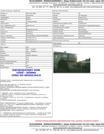 PŁUCIENNIK NIERUCHOMOŚCI | Aleja Politechniki 22/24 Łódź, lokal 201 pośrednictwo | obsługa transakcji | doradztwo | kredyty | opinie | analizy | administrowani _______________ www.pluciennik-nieruchomosci.pl _______________ tel. 42 681 67 77, 500 60 40 14, e-mail: [email protected] Informacje ogólne Nieruchomość Oferta nr DSI-DS-5847 Standard 5 Rodzaj sprzedaż Garaż w budynku Lokalizacja Łódź Okna nowe PCV Dzielnica Górna Instalacje wymienione Ulica Tomaszowska Balkon duży Ilość pokoi 6 Powierzchnia działki [m2] 15459.00 Pow. całkowita [m2] 300.00 m² Zagosp. działki częściowo zagospodarowana Ilość kondygnacji 2 Ukształtowanie działki płaska Cena 950000.00 PLN Kształt działki prostokąt Cena/m2 3166.67 Rodzaj domu wolnostojący Status aktualna Pokrycie dachu blachodachówka Imię i nazwisko PŁUCIENNIK NIERUCHOMOŚCI Powierzchnia użytkowa [m2] 200,00 Telefon komórkowy 42 681 67 77 Stan budynku do zamieszkania Telefon 500 60 40 14 E-mail [email protected] Pomieszczenia Ilość pokoi Opis 6 Zdjęcia Plac zabaw nie Gaz tak - miejski Woda tak - miejska Dojazd asfalt Ogrzewanie własne gazowe Alarm nie Winda nie Drzwi antywłamaniowe nie Ilość kondygnacji 2 Prąd tak Kanalizacja szambo DWURODZINNY DOM ŁÓDŹ - GÓRNA CENA DO NEGOCJACJI Zadbany dom z zabudowaniami magazynowo-warsztatowoprodukcyjnymi. Dom jest dwurodzinny - 2 odrębne wejścia STAN TECHNICZNY: dobry RODZAJ MATERIAŁU BUDOWLANEGO (MURY/STROPY/DACH): cegła, dach blacha ZEWNĘTRZNE WYKOŃCZENIE BUDYNKU: tynk akrylowy - PIWNICE: garaż, kotłownia, pom. gospodarcze - PARTER: biuro z aneksem kuchennym i łazienką, kuchnia, 2 pokoje, łazienka - I PIĘTRO: salon ok. 45 m kw. z kominkiem, kuchnia, 2 pokoje, łazienka - STRYCH/PODDASZE: nieużytkowe INNE ZABUDOWANIA: 2 budynki magazynowo - warsztatowe o łącznej pow. ok. 150 m kw. ZABEZPIECZENIA/SYSTEMY ALARMOWE: brama metalowa, alarm OPIS/ ZAGOSPODAROWANIE DZIAŁKI: zadbana, kotka brukowa OGRODZENIE/BRAMA: brama metalowa, ogrodzenie metalowe SĄSIEDZTWO: domy całoroczne == POŚREDNIK ODPOWIEDZIALNY ZAWODOWO – LICENCJA NR 5008 == Uwaga!!! Oferta może być w danym momencie nieaktualna. Prosimy o telefon do biura. Klientom chcemy poświęcać odpowiednią ilość czasu, prosimy o umawianie spotkań. PŁUCIENNIK NIERUCHOMOŚCI | Aleja Politechniki 22/24 Łódź, lokal 201 pośrednictwo | obsługa transakcji | doradztwo | kredyty | opinie | analizy | administrowani _______________ www.pluciennik-nieruchomosci.pl _______________ tel. 42 681 67 77, 500 60 40 14, [email protected]