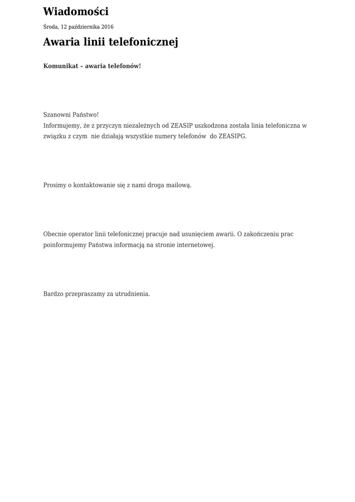 Wiadomości Środa, 12 października 2016 Awaria linii telefonicznej Komunikat – awaria telefonów! Szanowni Państwo! Informujemy, że z przyczyn niezależnych od ZEASIP uszkodzona została linia telefoniczna w związku z czym nie działają wszystkie numery telefonów do ZEASIPG. Prosimy o kontaktowanie się z nami droga mailową. Obecnie operator linii telefonicznej pracuje nad usunięciem awarii. O zakończeniu prac poinformujemy Państwa informacją na stronie internetowej. Bardzo przepraszamy za utrudnienia.