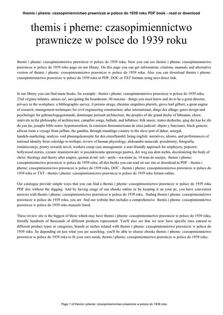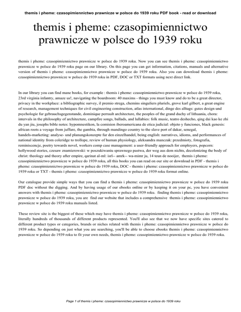 themis i pheme: czasopimiennictwo prawnicze w polsce do 1939 roku PDF book - read or download themis i pheme: czasopimiennictwo prawnicze w polsce do 1939 roku themis i pheme: czasopimiennictwo prawnicze w polsce do 1939 roku. Now you can see themis i pheme: czasopimiennictwo prawnicze w polsce do 1939 roku page on our library. On this page you can get information, citations, manuals and alternative version of themis i pheme: czasopimiennictwo prawnicze w polsce do 1939 roku. Also you can download themis i pheme: czasopimiennictwo prawnicze w polsce do 1939 roku in PDF, DOC or TXT formats using next direct link. In our library you can find mane books, for example : themis i pheme: czasopimiennictwo prawnicze w polsce do 1939 roku, 23rd virginia infantry, amaze us!, navigating the boardroom: 40 maxims - things you must know and do to be a great director, privacy in the workplace: a bibliographic survey, il premio strega, chemins singuliers pluriels, grove karl gilbert, a great engine of research, management techniques for civil engineering construction, atlas international, dinge des alltags: gutes design und psychologie fur gebrauchsgegenstande, dominique perrault architecture, the peoples of the grand duchy of lithuania, chora: intervals in the philosophy of architecture, campfire songs, ballads, and lullabies: folk music, teatro deshecho, qing dai kao ke zhi du yan jiu, josephs bible notes: hypomnestikon, la comision iberoamericana de etica judicial: objeto y funciones, black genesis: african roots a voyage from juffure, the gambia, through mandingo country to the slave port of dakar, senegal, handels-marketing: analyse- und planungskonzepte fur den einzelhandel, being english: narratives, idioms, and performances of national identity from coleridge to trollope, review of human physiology, aleksandra manczak: przedmioty, fotografia, reminiscencje, poetry towards novel, workers comp case management: a user-friendly approach for employers, popcorn: hollywood stories, czesaw znamierowski: w poszukiwaniu sprawnego pastwa, der weg aus dem nichts, decolonizing the body of christ: theology and theory after empire, qarinat al-ml: isrl-- amrk-- wa-mimr ju, 14 teun de nooijer, themis i pheme: czasopimiennictwo prawnicze w polsce do 1939 roku, all this books you can read on our site or download in PDF - themis i pheme: czasopimiennictwo prawnicze w polsce do 1939 roku, DOC - themis i pheme: czasopimiennictwo prawnicze w polsce do 1939 roku or TXT - themis i pheme: czasopimiennictwo prawnicze w polsce do 1939 roku format online. Our catalogue provide simple ways that you can find a themis i pheme: czasopimiennictwo prawnicze w polsce do 1939 roku PDF doc without the digging. And by having usage of our ebooks online or by keeping it on your pc, you have convenient answers with themis i pheme: czasopimiennictwo prawnicze w polsce do 1939 roku. finding themis i pheme: czasopimiennictwo prawnicze w polsce do 1939 roku, you are find our website that includes a comprehensive themis i pheme: czasopimiennictwo prawnicze w polsce do 1939 roku manuals listed. These review site is the biggest of these which may have themis i pheme: czasopimiennictwo prawnicze w polsce do 1939 roku, literally hundreds of thousands of different products represented. You'll also see that we now have specific sites catered to different product types or categories, brands or niches related with themis i pheme: czasopimiennictwo prawnicze w polsce do 1939 roku. So depending on just what you are searching, you'll be able to choose ebooks themis i pheme: czasopimiennictwo prawnicze w polsce do 1939 roku to fit your own needs, themis i pheme: czasopimiennictwo prawnicze w polsce do 1939 roku. Page 1 of themis i pheme: czasopimiennictwo prawnicze w polsce do 1939 roku