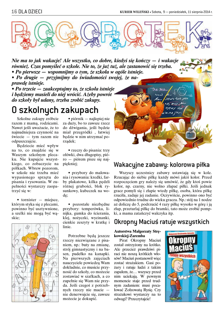 16 DLA DZIECI KURIER WILEŃSKI • Sobota, 9 — poniedziałek, 11 sierpnia 2014 r. Nie ma to jak wakacje! Ale wszystko, co dobre, kiedyś się kończy — i wakacje również. Czas pomyśleć o szkole. Nie to, że już tuż, ale zastanowić się trzeba. • Po pierwsze — wspomnijmy o tym, że szkoła w ogóle istnieje. • Po drugie — przyjmijmy do świadomości swojej, że naprawdę istnieje. • Po trzecie — zaakceptujmy to, że szkoła istnieje i będziemy musieli do niej wrócić. Ażeby powrót do szkoły był udany, trzeba zrobić zakupy. O szkolnych zakupach Szkolne zakupy zróbcie razem z mamą, rodzicami. Nawet jeśli uważacie, że to najnudniejsza czynność na świecie — tym razem nie odpuszczajcie. Będziecie mieć wpływ na to, co znajdzie się w Waszym szkolnym plecaku. Nie kupujcie wszystkiego, co zobaczycie na półkach. Wbrew pozorom, w szkole nie trzeba mieć wypasionego sprzętu do pisania i rysowania. W zupełności wystarczy zaopatrzyć się w: • tornister — miejsce, którym styka się z plecami, powinno być usztywnione, a szelki nie mogą być wąskie; • piórnik — najlepiej nie za duży, bo to zawsze rzecz do dźwigania, jeśli będzie miał przegródki , łatwiej będzie w nim utrzymać porządek; • rzeczy do pisania: trzy ołówki, dwa długopisy, pióro — piórem pisze się najpiękniej; • przybory do malowania i rysowania: kredki, farby plakatowe, kilka pędzli różnej grubości, blok rysunkowy, kubeczek na wodę; • pozostałe niezbędne przybory: temperówka, linijka, gumka do ścierania, klej, nożyczki, wycinanki, cienkie zeszyty w kratkę i linie. Potrzebne będą jeszcze rzeczy niezwiązane z pisaniem, np.: buty na zmianę, strój gimnastyczny i na basen, pudełko na kanapki. Na pierwszych zajęciach nauczyciele powiedzą Wam dokładnie, co musicie przynosić do szkoły, co możecie zostawiać w szafkach, a co zupełnie się Wam nie przyda. Jeśli czegoś z potrzebnych rzeczy nie macie — nie denerwujcie się, zawsze możecie je dokupić. Wakacyjne zabawy: kolorowa piłka Wszyscy uczestnicy zabawy ustawiają się w kole. Rzucając do siebie piłkę każdy mówi jakiś kolor. Przed rozpoczęciem gry należy się umówić, że gdy ktoś powie kolor, np. czarny, nie wolno złapać piłki. Jeśli jednak gracz pomyli się i złapie wtedy piłkę, osoba, która piłkę rzuciła, zadaje jej zadanie. Oczywiście, powinno ono być odpowiednio trudne do wieku gracza. Np.: stój na 1 nodze aż doliczę do 5, podrzucić 4 razy piłkę wysoko w górę i ją złap, przeturlaj piłkę do bramki, tato może zrobić pompki, a mama zatańczyć walczyka itp. Okropny Maciuś ratuje wszystkich Autorstwa Małgorzaty Strękowskiej-Zaremba Pirat Okropny Maciuś został ostrzyżony na krótko. Ale przecież prawdziwi piraci nie noszą krótkich włosów! Maciuś postanowił więc zostać strażakiem. Gasi pożary i ratuje ludzi z takim zapałem, że… wszyscy przed nim uciekają. W pewnym momencie staje przed trudnym zadaniem: musi pocałować Zołzowatą Rysię. Czy strażakowi wystarczy na to odwagi? Przeczytajcie! DLA DZIECI 17 KURIER WILEŃSKI • Sobota, 9 — poniedziałek, 11 sierpnia 2014 r. Wilczy apetyt wilków? Wilki lubią tereny nieodwiedzane przez ludzi. Najbezpieczniej czują się w górskich lasach — mają tam wiele kryjówek i sporo pożywienia. Zwierzęta te żyją w wilczych rodzinach, czyli watahach. Najważniejszy jest tu samiec, przywódca stada, zwany basiorem. Jest jeszcze wadera, czyli samica i wilcze dzieciaki z dwóch kolejnych miotów. Czy wilki są pod ochroną? Tak. Wilk to ściśle chroniony gatunek. Oznacza to, że absolutnie nie wolno na niego polować. Czym żywią się wilki? Wilk to myśliwy, żywi się przede wszystkim mięsem. Najchętniej zjada sarny, łosie, jelenie i dziki. Nie pogardzi zdechłymi zwierzętami, a także rybami. Wilk potrafi również nic nie jeść przez kilka dni lub przeżyć dzięki jagodom i grzybom. Zdarza się, że bardzo głodne wilki napadają na zwierzęta hodowane przez człowieka. Robią to tylko wtedy, gdy w pobliżu nie ma ludzi lub psa, a zwierzęta znajdują się blisko naturalnego środowiska wilków, czyli lasu. Jak duży jest wilk? Dorosły wilk (mierzony z ogonem) może mieć około 160 centymetrów długości. Waży około 50 kilogramów. Co wilk ma wspólnego z lwem? Nie tylko lwy mają grzywy, wilki także. To długie i gęste włosy, układające się w charakterystyczne pasmo od karku do barków. Wilcza grzywa staje dęba, gdy zwierzę jest np. zdenerwowane. Jaki kolor mają wilki? Zwierzęta te mogą mieć wiele kolorów: od czarnego, poprzez brąz i różne odcienie szarości, aż do białego. Jaki apetyt ma wilk? Wilki naprawdę dużo jedzą — nawet 10 kilogramów mięsa dziennie. I wcale nie przeżuwają starannie swych posiłków, połykają duże porcje. Powiedzenie „mieć wilczy apetyt” jest więc prawdziwe. Jak porozumiewają się wilki? Wilki szczekają, skomlą, radośnie piszczą — kiedy się bawią, gdy są złe — warczą. I, oczywiście, wyją. Labirynt Kangurek, który poszukuje mamy, potrzebuje Waszej pomocy. Zadanie jest proste, ale, niestety, sam kangurek nie da sobie rady. Nu pogodi!: przygody wilka i zająca „Ну, погоди!” — „Nu, pogodi!” — od tych właśnie słów Wilka, tłumaczonych jako „Ja ci pokażę”, a dosłownie znaczących „No, poczekaj!” — wzięła nazwę radziecka, potem rosyjska, bez wątpienia, najpopularniejsza kreskówka. Opowiada o przygodach Wilka, który próbuje dopaść sympatycznego Zająca. Ganiając się, przeżywają mnóstwo zabawnych przygód, z których Zając zawsze wychodzi cało. Wilk/Волк — postać zła, nałogowy palacz papierosów, papieros to jego znak rozpoznawczy. Nienawidzi Zająca od momentu, jak ten, podlewając kwiaty na swoim balkonie, przez przypadek zgasił mu pa- pierosa. W każdym z odcinków bajki próbuje złapać Zająca z zamiarem zjedzenia go, jednakże w 
