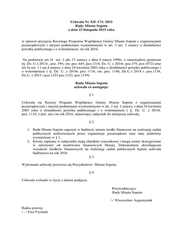 Uchwała Nr XII /171/ 2015 Rady Miasta Sopotu z dnia 23 listopada 2015 roku w sprawie przyjęcia Rocznego Programu Współpracy Gminy Miasta Sopotu z organizacjami pozarządowymi i innymi podmiotami wymienionymi w art. 3 ust. 3 ustawy o działalności pożytku publicznego i o wolontariacie, na rok 2016. Na podstawie art.18 ust. 2 pkt 15 ustawy z dnia 8 marca 1990r. o samorządzie gminnym (tj. Dz. U z 2013r., poz. 594, zm. poz. 645, poz.1318, Dz. U. z 2014r. poz.379, poz.1072) oraz art.5a ust. 1 i ust.4 ustawy z dnia 24 kwietnia 2003 roku o działalności pożytku publicznego i o wolontariacie ( tj. Dz. U. z 2014r. poz. 1118, zm. poz. 1146, Dz.U.z 2014 r. poz.1138, Dz.U. z 2015 r.poz.1255 poz.1333, poz.1339) Rada Miasta Sopotu uchwala co następuje: §1 Uchwala się Roczny Program Współpracy Gminy Miasta Sopotu z organizacjami pozarządowymi i innymi podmiotami wymienionymi w art. 3 ust. 3 ustawy z dnia 24 kwietnia 2003 roku o działalności pożytku publicznego i o wolontariacie ( tj. Dz. U. z 2014r. poz. 1118, z póź. zm.) na rok 2016, stanowiący załącznik do niniejszej uchwały. §2 1. Rada Miasta Sopotu zapewni w budżecie miasta środki finansowe na realizację zadań publicznych realizowanych przez organizacje pozarządowe oraz inne podmioty wymienione w § 1. 2. Kwoty zapisane w załączniku mają charakter szacunkowy i mogą zostać skorygowane w zależności od możliwości finansowych Miasta. Dokumentem określającym wysokość środków finansowych na realizację zadań publicznych będzie uchwała budżetowa na rok 2016. §3 Wykonanie uchwały powierza się Prezydentowi Miasta Sopotu. §4 Uchwała wchodzi w życie z dniem podjęcia. Przewodniczący Rady Miasta Sopotu /-/ Wieczesław Augustyniak Radca prawny / - / Ewa Frymark ROCZNY PROGRAM WSPÓŁPRACY GMINY MIASTA SOPOTU Z ORGANIZACJAMI POZARZĄDOWYMI ORAZ PODMIOTAMI WYMIENIONYMI W ART. 3 UST. 3 USTAWY O DZIAŁALNOŚCI POŻYTKU PUBLICZNEGO I O WOLONTARIACIE, NA ROK 2016. Rozdział 1 Postanowienia ogólne §1 Program określa: cel główny i cele szczegółowe programu; zasady współpracy z organizacjami pozarządowymi; zakres przedmiotowy programu; formy współpracy z organizacjami pozarządowymi; priorytetowe zadania publiczne realizowane we współpracy z organizacjami pozarządowymi; 6. okres realizacji programu; 7. sposób realizacji programu; 8. wysokość środków przeznaczanych na realizację programu; 9. informację o sposobie tworzenia programu oraz o przebiegu konsultacji; 10. tryb powoływania i zasady działania komisji konkursowych do opiniowania ofert w otwartych konkursach ofert. 1. 2. 3. 4. 5. §2 Ilekroć w programie jest mowa o: 1. ustawie – należy przez to rozumieć ustawę z dnia 24 kwietnia 2003 r. o działalności pożytku publicznego i o wolontariacie; 2. organizacjach pozarządowych – należy przez to rozumieć organizacje pozarządowe i podmioty, o których mowa w art.3 ust.3 ustawy; 3. programie – należy przez to rozumieć program współpracy Gminy Miasta Sopotu z organizacjami pozarządowymi na rok 2016; 4. konkursie ofert – należy przez to rozumieć otwarty konkurs ofert na realizację zadań publicznych, o którym mowa w art.11 ustawy; 5. dotacji – należy przez to rozumieć dotację w rozumieniu art.127 ust.1 pkt 1 lit. e oraz art.221 ustawy z dnia 27 sierpnia 2009 r. o finansach publicznych; 6. zadaniach publicznych – należy przez to rozumieć zadania publiczne określone w przepisach art.4 ustawy; 7. rozporządzeniu – należy przez to rozumieć rozporządzenie wydane na podstawie art.19 ustawy; 8. trybie pozakonkursowym – należy przez to rozumieć tryb zlecania realizacji zadań publicznych organizacjom pozarządowym poza konkursem ofert na podstawie art.19a ustawy 9. Prezydencie – należy przez to rozumieć Prezydenta Miasta Sopotu; 10. stronie internetowej miasta – należy przez to rozumieć adres internetowy www.sopot.pl Rozdział 2 Cel główny i cele szczegółowe programu. §3 Celem głównym programu jest wzmocnienie współpracy Gminy Miasta Sopotu z organizacjami pozarządowymi poprzez rozwój zakresu i form współpracy finansowej i pozafinansowej, w tym wdrożenie narzędzi poprawiających jakość współpracy, wypracowanych zgodnie z wynikami badania Lokalnym Indeksem Jakości Współpracy, w ramach inicjatywy „Top Model Współpracy w województwie pomorskim”. §4 Celami szczegółowymi programu są: 1. Poprawa jakości przygotowywanych ofert realizacji zadań publicznych poprzez wdrożenie karty formalnej i merytorycznej oceny wniosków w procedurze otwartych konkursów ofert. 2. Poprawa jakości w komunikowaniu się organizacji pozarządowych, mieszkańców i samorządu poprzez funkcjonowanie nowej podstrony na stronie internetowej miasta Sopotu poświęconej współpracy z organizacjami pozarządowymi oraz konsultacjom aktów prawa miejscowego z organizacjami pozarządowymi. 3. Wzmacnianie mechanizmów współpracy samorządu i organizacji pozarządowych poprzez: wdrożenie ujednoliconych zasad przeprowadzania konsultacji aktów prawa miejscowego z organizacjami pozarządowymi w ustanowionych siedmiu obszarach konsultacyjnych (z wykorzystaniem formularza konsultacyjnego i upublicznianiem rezultatów konsultacji); możliwość umieszczania informacji przez organizacje w aktualnościach podstrony organizacji pozarządowych na stronie internetowej Miasta Sopotu (zgodnie z Regulaminem umieszczania informacji); wdrożenie zasad przyznawania Honorowego Patronatu Prezydenta Miasta Sopotu standaryzację usług Sopockiego Centrum Organizacji Pozarządowych, spójnie z wymaganiami certyfikacyjnymi Sieci SPLOT i Pomorskiej Sieci Centrów Organizacji Pozarządowych; organizację spotkań międzysektorowych (organizacji pozarządowych i instytucji publicznych), wzmacniających praktyczne wdrażanie zasad współpracy określonych w § 5. 4. Umacnianie oraz zwiększanie wpływu sektora obywatelskiego na kreowanie polityki społecznej poprzez wdrożenie