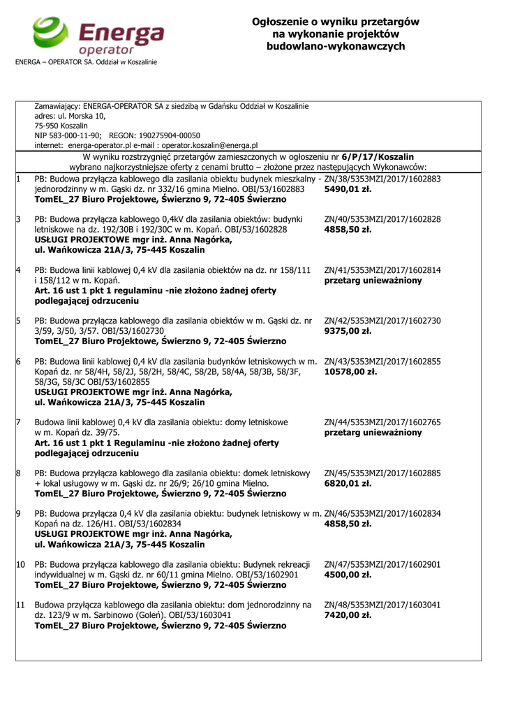 Ogłoszenie o wyniku - ENERGA