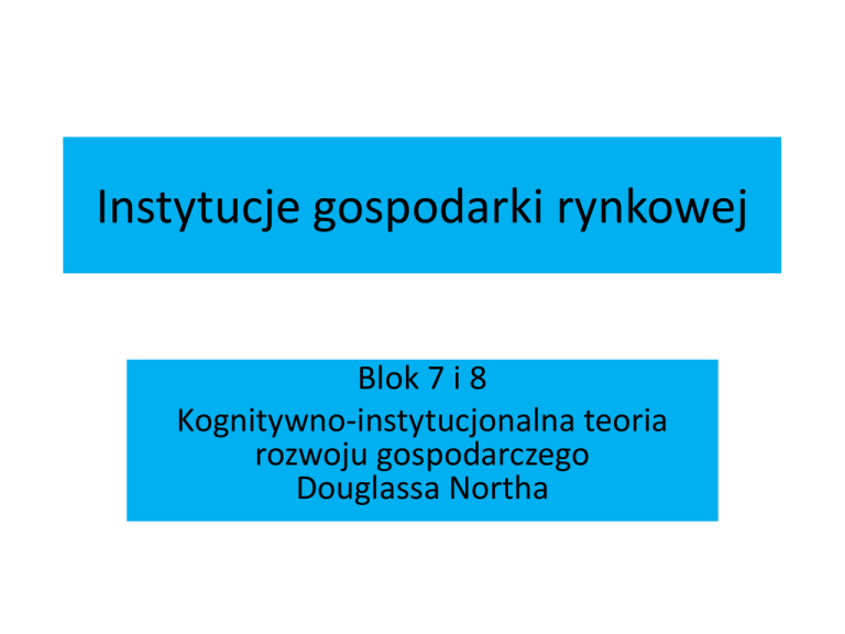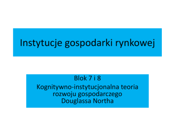 Instytucje gospodarki rynkowej Blok 7 i 8 Kognitywno-instytucjonalna teoria rozwoju gospodarczego Douglassa Northa D. Northa etapy rozumowania o czynnikach warunkujących rozwój 1. Odejście od tradycyjnego ujęcia skoncentrowanego na pracy i kapitale. 2. Eksponowanie roli instytucji. 3. Koncentracja na procesach kształtowania mentalności i ideologiach. 4. Teoria poznania i uczenia się koncepcja rozwoju umysłu jako źródła zróżnicowania rozwoju gospodarczego. Wpływ kultury na jednostkę KULTURA INSTYTUCJE JEDNOSTKA Holizm vs. Indywidualizm Instytucje a koncepcja racjonalności Ujęcie dychotomiczne Racjonalny człowiek maks. użyteczność Człowiek zdeterminowany zwyczajami, rutyną, normami czyli instytucjami Spojrzenie na instytucje jako element kształtowania racjonalności… Godzi koncepcje neoklasyczną z instytucjonalną, indywidualizm z holizmem Koncepcja racjonalności ograniczonej lub (inaczej) adaptacyjnej Elementy podejmowania decyzji (w świecie permanentnej niepewności) Racjonalne myślenie Koszty zbierania informacji i zaw. umów DECYZJA Ograniczone możliwości umysłu Korzyści z zachowań opartych na zwyczaju, rutynie, normach Koncepcja racjonalności ograniczonej lub (inaczej) adaptacyjnej 1. Działamy w warunkach entropii. 2. Niedostateczny dostęp do informacji lub zbyt wysokie koszty ich zdobycia 3. Staramy się być racjonalni. 4. Umysł ludzki jest ustrojowo ograniczony (może objąć tylko wąski krąg rzeczywistości społecznej). Instytucje są społecznymi instrumentami służącymi do pobudzania i wzmacniania racjonalności jednostki [V. Smith] Ludzkie zdolności poznawcze nie opierają się wyłącznie na samym rozumowaniu, ale są kształtowane przez społeczne interakcje z innymi [Hodgson, 2004] Model racjonalności dualnej [Redmond, 2004] DWA SPOSOBY RACJONALNEGO MYŚLENIA i DZIAŁANIA OPARTE NA: 1. PLANOWANIU (nierutynowa) Kalkulacja Cel – Środki 2. NAKAZACH Odwołanie się do zwyczajów norm, obyczajów, prawa i tradycji Wybór między wartościami Jednostki płynnie przechodzą między 1 i 2 w zależności od wymagań swoich i środowiska Indywidualizm instytucjonalny • INDYWIDUALIZM INSTYTUCJONALNY – oznacza uznanie ogromnego wpływu instytucji na wybory jednostek, ale podkreśla jednocześnie, że jednostka może dokonywać wyborów wbrew instytucjom. Jest to droga do zmiany społecznej. • Jest kontynuacją indywidualizmu, gdyż ostatecznie to jednostka jest czynnikiem sprawczym (rozwiązywanie problemów ma zawsze miejsce w ludzkim mózgu). Jakie są czynniki rozwoju gospodarczego? TRADYCYJNE INSTYTUCJONALNE Innowacje techniczne (???) Złożony proces ewolucji społecznej, którego istotą są: Proces uczenia się i rozwoju ludzkiego umysłu (Inwestowanie w zdobywanie wiedzy) Usprawnienie koordynacji i współpracy ludzi Kluczowy: system bodźców ekonomicznych oparty na wolnościowych i własnościowych prawach jednostek Efektywność alokacyjna a efektywność adaptacyjna • EFEKTYWNOŚĆ ALOKACYJNA – (koncepcja statyczna) zakładająca stałe podłoże instytucjonalne. Kluczem do ciągłości pomyślnego wzrostu jest elastyczna matryca instytucjonalna, która dostosowuje się do zmian technologicznych, demograficznych, jak i do szoków w systemie społecznym. [North, 1993] Efektywność alokacyjna a efektywność adaptacyjna • EFEKTYWNOŚĆ ADAPTACYJNA – (związana z regułami kształtującymi sposób rozwoju gospodarki w czasie) gotowość społeczeństwa do: zdobywania wiedzy i uczenia się, innowacji, podejmowania ryzyka i twórczej działalności, jak i rozwiązywania problemów i usuwania zatorów, które społeczeństwo napotyka w toku rozwoju. [North, 1980] • Ujawnia się w długiej perspektywie jako zdolność do gromadzenia wiedzy, tworzenia form współpracy i postaw kreatywności sprzyjających wzrostowi dobrobytu. Równowaga instytucjonalna • Występuje wówczas, gdy przy określonej sile przetargowej graczy, działających w określonym systemie reguł wymiany, nikt nie widzi korzyści w poświęcaniu zasobów na zasadniczą zmianę warunków społ. wymiany. • Bodźce do zmiany instytucji: - Wystąpienie nowych wyobrażeń dot. nowych okazji i możliwości wynikających z egzogenicznych zmian. - Zmiany cen relatywnych. … plus: Rachunek kosztów i korzyści zmiany reguł. Czynniki rozstrzygające o kierunku przystosowań instytucjonalnych • Jaki rodzaj działań faworyzuje matryca instytucjonalna (jaka jest struktura i udział bodźców motywacyjnych)? REDYSTRYBUCYJNE Jak skutecznie przejmować bogactwo od innych? PRODUKCYJNE Jak zwiększyć umiejętności i wiedzę? Instytucje efektywne i nieefektywne w gospodarce Dlaczego efektywne instytucje (pobudzające zmiany technologiczne, akumulację, mobilność kapitału, doskonalenie kapitału ludzkiego oraz ułatwiające kooperację są …. …. w historii ludzkości zjawiskiem wyjątkowym? Wiedza jednostki a skumulowana wiedza świata Wiedza jednostki „0” Wiedza świata ∞ Wiedza jednostki a entropia rzeczywistości społecznej, politycznej, gospodarczej… ?? ? ? ?.... Mentalność jednostki i proces poznania jako źródło instytucji i instytucjonalnej zmiany • … podstawy ustrojów społecznych są budowane na przekonaniach ludzi, którym tylko w części można przypisać rygor logicznego myślenia … • U podstaw ludzkich wyborów nie leży tylko racjonalność, ale modele mentalne (beliefs, mental models). Człowiek a rzeczywistość • Nikt nie zna „rzeczywistości” systemu polit.ekonom. Ludzie tworzą własne wyobrażenia tej „rzeczywistości”, czyli zarówno pozytywny model systemu (jak jest), jak i normatywny (jak być powinno). • Racjonalność nie jest uniwersalną cechą ludzkiego myślenia i działania, oderwaną od instytucjonalnego otoczenia, ale jest wynikiem nieustannego zmagania się ludzi z niepewnością środowiska przyrodniczego i społecznego. Ewolucja człowieka a cywilizacja 2,5 mln 2 mln 200 tys. 10 ty