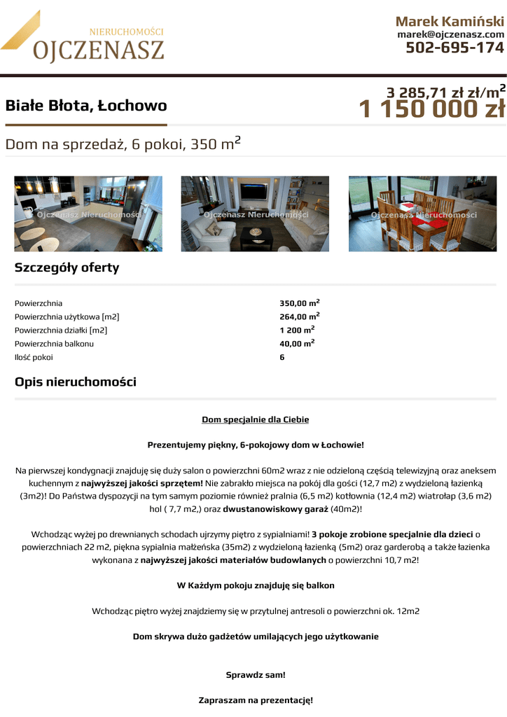 Marek Kamiński [email protected] 502-695-174 3 285,71 zł zł/m2 1 150 000 zł Białe Błota, Łochowo Dom na sprzedaż, 6 pokoi, 350 m2 Szczegóły oferty Powierzchnia 350,00 m2 Powierzchnia użytkowa [m2] 264,00 m2 Powierzchnia działki [m2] 1 200 m2 Powierzchnia balkonu 40,00 m2 Ilość pokoi 6 Opis nieruchomości Dom specjalnie dla Ciebie Prezentujemy piękny, 6-pokojowy dom w Łochowie! Na pierwszej kondygnacji znajduję się duży salon o powierzchni 60m2 wraz z nie odzieloną częścią telewizyjną oraz aneksem kuchennym z najwyższej jakości sprzętem! Nie zabrakło miejsca na pokój dla gości (12,7 m2) z wydzieloną łazienką (3m2)! Do Państwa dyspozycji na tym samym poziomie również pralnia (6,5 m2) kotłownia (12,4 m2) wiatrołap (3,6 m2) hol ( 7,7 m2,) oraz dwustanowiskowy garaż (40m2)! Wchodząc wyżej po drewnianych schodach ujrzymy piętro z sypialniami! 3 pokoje zrobione specjalnie dla dzieci o powierzchniach 22 m2, piękna sypialnia małżeńska (35m2) z wydzieloną łazienką (5m2) oraz garderobą a także łazienka wykonana z najwyższej jakości materiałów budowlanych o powierzchni 10,7 m2! W Każdym pokoju znajduję się balkon Wchodząc piętro wyżej znajdziemy się w przytulnej antresoli o powierzchni ok. 12m2 Dom skrywa dużo gadżetów umilających jego użytkowanie Sprawdz sam! Zapraszam na prezentację! Nieruchomość Rodzaj domu wolnostojący Technologia budowlana silikat Standard Ilość pięter w budynku 3 Wymiary działki 46/22 m Garaż na dwa samochody Stan prawny Własność Okna nowe drewniane Instalacje nowe Balkon jest Ilość balkonów 4 Ilość tarasów 1 Zagosp. działki częściowo zagospodarowana Ukształtowanie działki płaska Kształt działki prostokąt Pokrycie dachu dachówka Pozwolenie na użytkowanie tak Stan budynku do zamieszkania Ogrodzenie działki drewniane Rok budowy 2010 Gaz jest Dojazd droga utwardzona Otoczenie las Ogrzewanie własne gazowe Alarm tak Odległość do komunikacji publicznej [m] 200 m Odległość do sklepu 500 m Odległość do szkoły 800 m Tarasy taras duzy Prąd jest