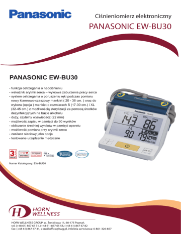 Ciśnieniomierz elektroniczny PANASONIC EW-BU30 PANASONIC EW-BU30 - funkcja ostrzegania o nadciśnieniu - wskaźnik arytmii serca – wykrywa zaburzenia pracy serca - system ostrzegania o poruszeniu ręki podczas pomiaru nowy klamrowo-czaszowy mankiet ( 20 - 36 cm. ) oraz do wyboru (opcja ) mankiet o rozmiarach S (17-30 cm.) i XL (32-45 cm.) z możliwością sterylizacji za pomocą środków dezynfekcyjnych na bazie alkoholu - duży, czytelny wyświetlacz (22 mm) - możliwość zapisu w pamięci do 90 wyników - obliczanie średniej wyników w pamięci aparatu - możliwość pomiaru przy arytmii serca - zasilacz sieciowy jako opcja - testowane urządzenie medyczne Numer Katalogowy: EW-BU30 HORN WELLNESS GROUP. ul. Żonkilowa 11, 60-175 Poznań. tel. (+48 61) 867 67 31, (+48 61) 867 65 58, (+48 61) 867 67 82 fax: (+48 61) 867 67 31, e-mail:[email protected], infolinia serwisowa: 0-801-326-857