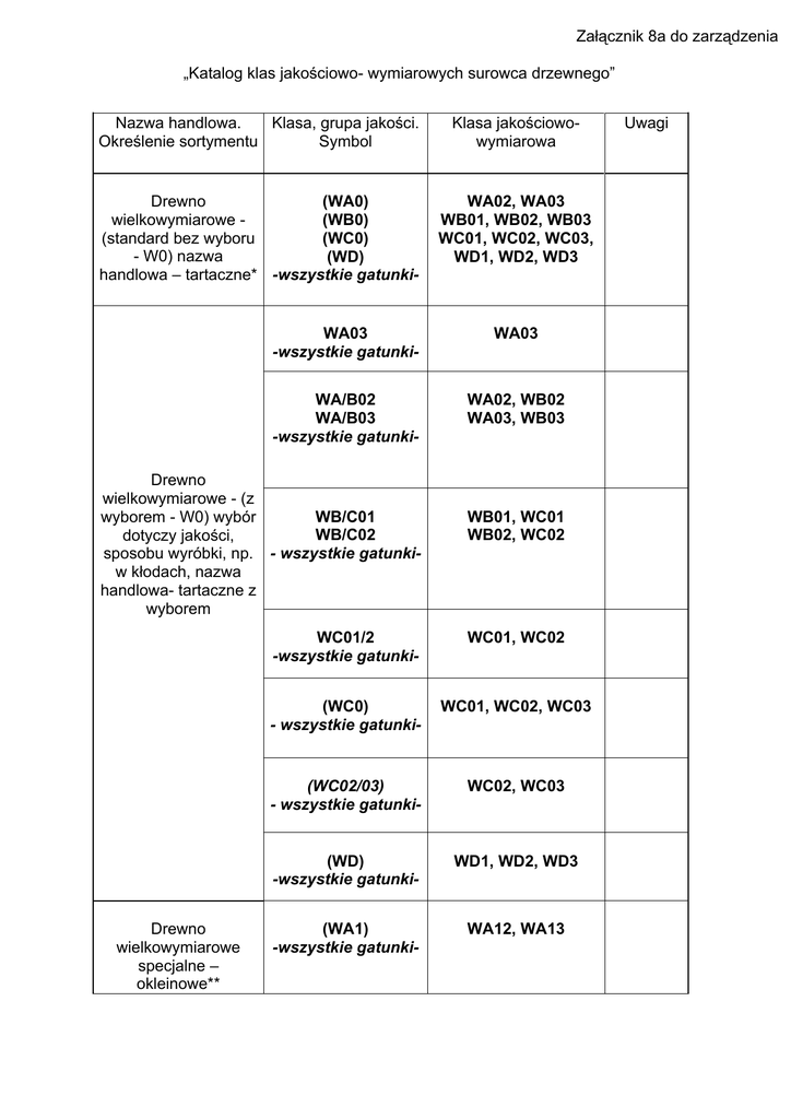 Załącznik 8a do zarządzenia „Katalog klas jakościowo- wymiarowych surowca drzewnego” Nazwa handlowa. Klasa, grupa jakości. Określenie sortymentu Symbol Klasa jakościowowymiarowa Drewno (WA0) wielkowymiarowe (WB0) (standard bez wyboru (WC0) - W0) nazwa (WD) handlowa – tartaczne* -wszystkie gatunki- WA02, WA03 WB01, WB02, WB03 WC01, WC02, WC03, WD1, WD2, WD3 WA03 -wszystkie gatunki- WA03 WA/B02 WA/B03 -wszystkie gatunki- WA02, WB02 WA03, WB03 Drewno wielkowymiarowe - (z WB/C01 wyborem - W0) wybór WB/C02 dotyczy jakości, sposobu wyróbki, np. - wszystkie gatunkiw kłodach, nazwa handlowa- tartaczne z wyborem Drewno wielkowymiarowe specjalne – okleinowe** WB01, WC01 WB02, WC02 WC01/2 -wszystkie gatunki- WC01, WC02 (WC0) - wszystkie gatunki- WC01, WC02, WC03 (WC02/03) - wszystkie gatunki- WC02, WC03 (WD) -wszystkie gatunki- WD1, WD2, WD3 (WA1) -wszystkie gatunki- WA12, WA13 Uwagi Drewno wielkowymiarowe specjalne - sklejkowe (WB1) -wszystkie gatunki- WB11, WB12, WB13 Drewno specjalne - na słupy (WC1) -wszystkie gatunki- WC11, WC12, WC13 Drewno stosowe użytkowe, do przemysłowego zastosowania. S2A -wszystkie gatunki- Drewno stosowe użytkowe, do przemysłowego zastosowania. Przemysł energetyczny. S2ac iglaste liściaste Drewno stosowe użytkowe do mechanicznego przerobu. Do średnicy 12 cm w górnym końcu bez kory. S2Bc -wszystkie gatunki- Drewno stosowe użytkowe do mechanicznego przerobu. Od średnicy 12 cm w górnym końcu bez kory. S2A S2AC S2B K S2B D S2B K S2Bg - wszystkie gatunki- Drewno kopalniakowe S10 standardowe do - wszystkie gatunkimechanicznego przerobu Drewno specjalne na S11 słupy - wszystkie gatunki- S2B D S10 S11 Żerdzie przemysłowe. Drewno średniowymiarowe przemysłowe S3a iglaste/liściaste Żerdzie do innego zastosowania (gospodarcze) S3b iglaste/liściaste Drobnica tyczkowa przemysłowa. Drobnica opałowa M1 iglaste/liściaste M2 iglaste/liściaste Drobnica tyczkowa do mechanicznego przerobu (programy ogrodowe) M1P0 Iglaste/liściaste Surowiec na zrębki leśne przemysłowe. S3A + M1 Iglaste/liściaste S3A, M1 Zrębki leśne przemysłowe. zp zp Zrębki leśne opałowe zo zo Karpina przemysłowa. kp kp Karpina opałowa ko ko Programy ogrodowe, średnica w gk bez kory 57cm * dopuszcza się za zgodą obu stron minimalny udział innych gatunków ** wystawienie na PL-D lub e-drewno (submisja) wg decyzji n-czego