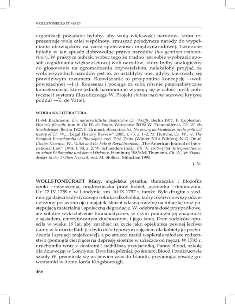 WOLLSTONECRAFT MARY organizacji pożądane byłoby, aby wolą większości narodów, która reprezentuje wolę całej wspólnoty, zmuszać pojedyncze narody do wypełniania obowiązków na rzecz społeczności międzynarodowej. Tworzone byłoby w ten sposób dobrowolne prawo narodów (ius gentium voluntarium). W praktyce jednak, wobec tego że trudno jest sobie wyobrazić sposób uzgadniania większościowej woli narodów, który byłby analogiczny do głosowania na zgromadzeniu obywatelskim, należałoby przyjąć, że wolą wszystkich narodów jest to, co ustaliłyby one, gdyby kierowały się prawdziwym rozumem. Rozwiązanie to przypomina koncepcję →woli powszechnej →J.-J. Rousseau i pociąga za sobą równie paternalistyczne konsekwencje, które jednak harmonijnie wpisują się w całość myśli politycznej i systemu filozoficznego W. Projekt civitas maxima surowej krytyce poddał →E. de Vattel. WYBRANA LITERATURA H.-M. Bachmann, Die naturrechtliche Staatslehre Ch. Wolffs, Berlin 1977; F. Copleston, Historia filozofii, tom 6: Od W. do Kanta, Warszawa 2008; W. Frauendienst, Ch. W. als Staatsdenker, Berlin 1927; F. Grunert, Absolutism(s): Necessary ambivalences in the political theory of Ch. W., „Legal History Review” 2005, t. 73, z. 1–2; M. Hettche, Ch. W., w: The Stanford Encyclopedia of Philosophy, red. E.N. Zalta (Winter 2014 Edition); N.G. Onuf, Civitas Maxima: W., Vattel and the Fate of Republicanism, „The American Journal of International Law” 1994, t. 88, z. 2; W. Schneiders (red.), Ch. W. 1679–1754. Interpretationen zu seiner Philosophie und deren Wirkung, Hamburg 1983; M. Thomann, Ch. W., w: Staatsdenker in der Frühen Neuzeit, red. M. Stolleis, München 1995. J. M. WOLLSTONECRAFT Mary, angielska pisarka, tłumaczka i filozofka epoki →oświecenia, orędowniczka praw kobiet, pionierka →feminizmu. Ur. 27 IV 1759 r. w Londynie, zm. 10 IX 1797 r. tamże. Była drugim z siedmiorga dzieci sadystycznego rolnika-alkoholika, który roztrwoniwszy odziedziczony po swoim ojcu majątek, skazał własną rodzinę na tułaczkę oraz postępującą materialną i społeczną degradację. W. odebrała dość przypadkowe, ale solidne wykształcenie humanistyczne, w czym pomogła jej znajomość z sąsiadem, emerytowanym duchownym, i jego żoną. Dom rodziców opuściła w wieku 19 lat, aby zarabiać na życie jako opiekunka pewnej leciwej damy w kurorcie Bath (co było dość typowym zajęciem dla kobiety jej pochodzenia i sytuacji majątkowej), a po śmierci matki wspierała młodsze rodzeństwo (pomogła cierpiącej na depresję siostrze w ucieczce od męża). W 1783 r. uruchomiła wraz z siostrami i najbliższą przyjaciółką, Fanny Blood, szkołę dla dziewcząt w Londynie. Dwa lata później, po śmierci Blood i bankructwie szkoły W. przeniosła się na pewien czas do Irlandii, przyjmując posadę guwernantki w domu lorda Kingsborough. 466 WOLLSTONECRAFT MARY Powróciwszy w 1787 r. do Londynu, podjęła pracę recenzentki i tłumaczki w wydawanym przez liberalnego publicystę Josepha Johnsona periodyku „Analytical Review”. Obracając się w środowisku radykalnych intelektualistów, artystów i nonkonformistów, poznała m.in. →T. Paine’a i →W. Godwina. To właśnie w tym czasie ostatecznie ukształtował się jej intelekt i światopogląd społeczno-polityczny, wtedy też rozwinęła bujną działalność literacką. W odpowiedzi na Rozważania o rewolucji we Francji →E. Burke’a W. opublikowała traktat Wołanie o prawa człowieka (1790). Książka ta przyniosła jej zasłużony rozgłos, ugruntowany kolejnym dziełem, Wołanie o prawa kobiety (1792). Drugie wydanie tego dzieła zadedykowała →Ch. Talleyrandowi, którego poznała, gdy bawił w Londynie z misją dyplomatyczną (do napisania traktatu skłonił ją pamflet Talleyranda dowodzący zbędności kształcenia kobiet). Po nieudanym romansie z żonatym malarzem W. wyjechała pod koniec 1792 r. do ogarniętej rewolucją Francji, gdzie poznała amerykańskiego kupca i pisarza Gilberta Imlaya. Owocem ich niesformalizowanego i bardzo nieszczęśliwego dla W. związku była urodzona w 1794 r. córka Fanny. Obojętność i niewierność kochanka doprowadziły W. do dwukrotnej próby samobójczej w 1795 r. Po ostatecznym rozstaniu z Imlayem związała się z Godwinem. Kochankowie pobrali się w 1797 r. z powodu ciąży pisarki. Wkrótce potem na świat przyszła ich córka Mary, późniejsza autorka słynnej powieści grozy Frankenstein. Niestety, W. zmarła w połogu. Za sprawą opublikowanych przez Godwina (wyjątkowo szczerych) wspomnień o jej życiu zyskała pośmiertną opinię skandalistki obyczajowej, która przyćmiła jej osiągnięcia intelektualne i sprawiła, że przez dwa stulecia nie zostały one rozpoznane i należycie docenione. WAŻNIEJSZE PRACE Thoughts on the Education of Daughters: With Reflections on Female Conduct, in the More Important Duties of Life, London 1787; Mary, A Fiction, London 1788; A Vindication of the Rights of Men, in a Letter to the Right Honourable Edmund Burke, London 1790; A Vindication of the Rights of Woman, with Strictures on Political and Moral Subjects, London 1792; An Historical and Moral View of the Origin and Progress of the French Revolution; and the Effect it has produced in Europe, London 1794. Współczesne wydanie dzieł zebranych: The Works of M. W., red. J. Todd i M. Butler, 7 t., London 1989. Wydanie polskie: Wołanie o prawa kobiety. Wołanie o prawa człowieka, Warszawa 2011. Feministyczną myśl W. bardzo długo rozumiano w sposób uproszczony i zawężony, dostrzegając w niej głównie kwestie związane z edukacją kobiet. Wczesne pisma W. w istocie koncentrują się na pedagogice. Zawierają one oświeceniową pochwałę rozumu i wyraźnie wyartykułowane przekonanie, że podstawowym celem kształcenia jest wpojenie dzieciom obojga płci inte467 WOLLSTONECRAFT MARY lektualnej autonomii i dążenia do →cnoty, a także przygotowanie i