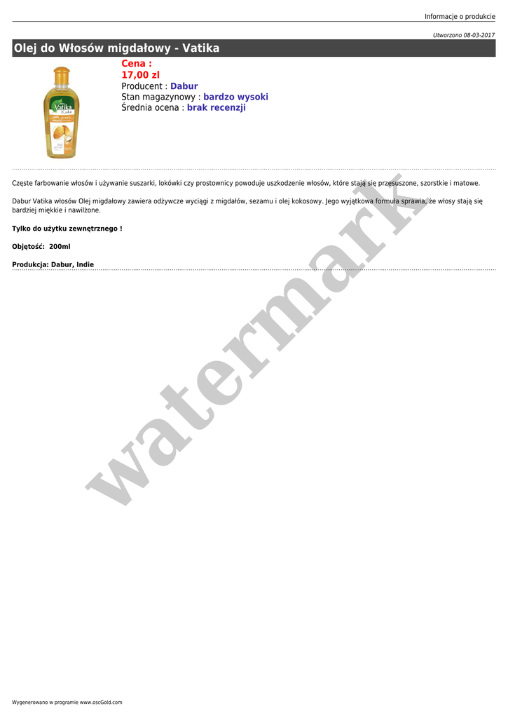 Informacje o produkcie Utworzono 08-03-2017 Olej do Włosów migdałowy - Vatika Cena : 17,00 zl Producent : Dabur Stan magazynowy : bardzo wysoki Średnia ocena : brak recenzji Częste farbowanie włosów i używanie suszarki, lokówki czy prostownicy powoduje uszkodzenie włosów, które stają się przesuszone, szorstkie i matowe. Tylko do użytku zewnętrznego ! Objętość: 200ml w at Produkcja: Dabur, Indie er m ar k Dabur Vatika włosów Olej migdałowy zawiera odżywcze wyciągi z migdałów, sezamu i olej kokosowy. Jego wyjątkowa formuła sprawia, że włosy stają się bardziej miękkie i nawilżone. Wygenerowano w programie www.oscGold.com