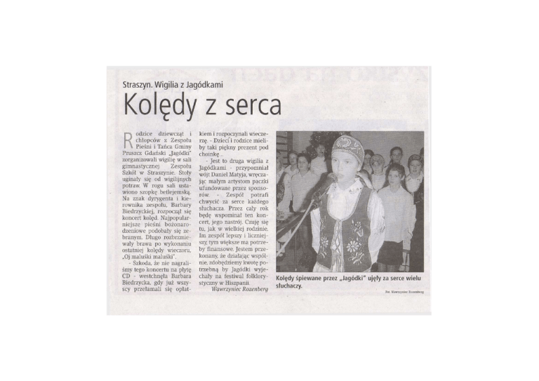 Straszyn. Wigilia z Jagódkami Kolędy z serca odzice dziewcząt i chłopców z Zespołu Pieśni i Tańca Gminy Pruszcz Gdański „Jagódki" zorganizowali wigilię w sali gimnastycznej Zespołu Szkół w Straszynie. Stoły uginały się od wigilijnych potraw. W rogu sali ustawiono szopkę, betlejemską. Na znak dyrygenta i kierownika zespołu, Barbary Biedrzyckiej, rozpoczął się koncert kolęd. Najpopularniejsze pieśni bożonarodzeniowe podobały się zebranym. Długo rozbrzmiewały brawa po wykonaniu ostatniej kolędy wieczoru, „Oj maluśki maluśki". - Szkoda, że nie nagraliśmy tego koncertu na płytę CD - westchnęła Barbara Biedrzycka, gdy już wszyscy przełamali się opłat- R kiem i rozpoczynali wieczerzę. - Dzieci i rodzice mieliby taki piękny prezent pod choinkę... - Jest to druga wigilia z Jagódkami - przypomniał wójt Daniel Matyja, wręczając małym artystom paczki ufundowane przez sponsorów. - Zespół potrafi chwycić za serce każdego słuchacza. Przez cały rok będę wspominał ten koncert, jego nastrój. Czuję się tu, jak w wielkiej rodzinie. Im zespól lepszy i liczniejszy tym większe ma potrzeby finansowe. Jestem przekonany, że działając wspólnie, zdobędziemy kwotę potrzebną by Jagódki wyjechały na festiwal folklory- Kolędy śpiewane przez „Jagódki" ujęty za serce wielu styczny w Hiszpanii. słuchaczy. Wawrzyniec Rozenberg Fot. Wawrzyniec Rozenberg