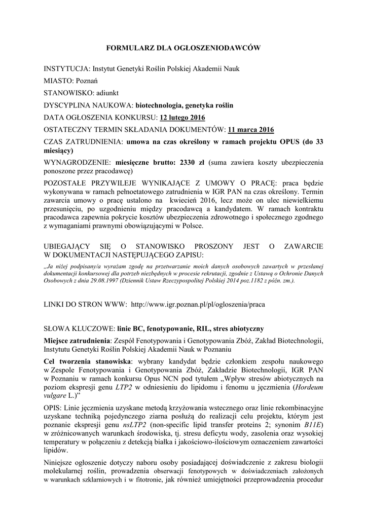 FORMULARZ DLA OGŁOSZENIODAWCÓW INSTYTUCJA: Instytut Genetyki Roślin Polskiej Akademii Nauk MIASTO: Poznań STANOWISKO: adiunkt DYSCYPLINA NAUKOWA: biotechnologia, genetyka roślin DATA OGŁOSZENIA KONKURSU: 12 lutego 2016 OSTATECZNY TERMIN SKŁADANIA DOKUMENTÓW: 11 marca 2016 CZAS ZATRUDNIENIA: umowa na czas określony w ramach projektu OPUS (do 33 miesiący) WYNAGRODZENIE: miesięczne brutto: 2330 zł (suma zawiera koszty ubezpieczenia ponoszone przez pracodawcę) POZOSTAŁE PRZYWILEJE WYNIKAJĄCE Z UMOWY O PRACĘ: praca będzie wykonywana w ramach pełnoetatowego zatrudnienia w IGR PAN na czas określony. Termin zawarcia umowy o pracę ustalono na kwiecień 2016, lecz może on ulec niewielkiemu przesunięciu, po uzgodnieniu między pracodawcą a kandydatem. W ramach kontraktu pracodawca zapewnia pokrycie kosztów ubezpieczenia zdrowotnego i społecznego zgodnego z wymaganiami prawnymi obowiązującymi w Polsce. UBIEGAJĄCY SIĘ O STANOWISKO PROSZONY W DOKUMENTACJI NASTĘPUJĄCEGO ZAPISU: JEST O ZAWARCIE „Ja niżej podpisany/a wyrażam zgodę na przetwarzanie moich danych osobowych zawartych w przesłanej dokumentacji konkursowej dla potrzeb niezbędnych w procesie rekrutacji, zgodnie z Ustawą o Ochronie Danych Osobowych z dnia 29.08.1997 (Dziennik Ustaw Rzeczypospolitej Polskiej 2014 poz.1182 z późn. zm.). LINKI DO STRON WWW: http://www.igr.poznan.pl/pl/ogloszenia/praca SŁOWA KLUCZOWE: linie BC, fenotypowanie, RIL, stres abiotyczny Miejsce zatrudnienia: Zespół Fenotypowania i Genotypowania Zbóż, Zakład Biotechnologii, Instytutu Genetyki Roślin Polskiej Akademii Nauk w Poznaniu Cel tworzenia stanowiska: wybrany kandydat będzie członkiem zespołu naukowego w Zespole Fenotypowania i Genotypowania Zbóż, Zakładzie Biotechnologii, IGR PAN w Poznaniu w ramach konkursu Opus NCN pod tytułem „Wpływ stresów abiotycznych na poziom ekspresji genu LTP2 w odniesieniu do lipidomu i fenomu u jęczmienia (Hordeum vulgare L.)” OPIS: Linie jęczmienia uzyskane metodą krzyżowania wstecznego oraz linie rekombinacyjne uzyskane techniką pojedynczego ziarna posłużą do realizacji celu projektu, którym jest poznanie ekspresji genu nsLTP2 (non-specific lipid transfer proteins 2; synonim B11E) w zróżnicowanych warunkach środowiska, tj. stresu deficytu wody, zasolenia oraz wysokiej temperatury w połączeniu z detekcją białka i jakościowo-ilościowym oznaczeniem zawartości lipidów. Niniejsze ogłoszenie dotyczy naboru osoby posiadającej doświadczenie z zakresu biologii molekularnej roślin, prowadzenia obserwacji fenotypowych w doświadczeniach założonych w warunkach szklarniowych i w fitotronie, jak również umiejętności przeprowadzenia procedur związanych z poddaniem badanego materiału roślinnego stresom abiotycznym. Istotnym kryterium jest również umiejętność pracy laboratoryjnej związanej z przygotowaniem pobranych odpowiednio prób do analiz molekularnych, orientacja w zakresie biologii roślin oraz umiejętność prowadzenia pomiarów biometrycznych i obserwacji zmian fenotypowych. Wybrana osoba ma obowiązek uczestniczenia w planowaniu eksperymentów, opracowaniu wyników oraz jest zobowiązana do publikowania artykułów naukowych. Charakterystyka stanowiska: pracownik naukowy Pracownik będzie ściśle współpracował ze specjalistami zatrudnionymi w ramach projektu OPUS. Wymagane umiejętności: • znajomość technik izolacji kwasów nukleinowych i funkcjonalnej charakterystyki genów, • umiejętność fenotypowania roślin, • bardzo dobra znajomość języka angielskiego. Zakres obowiązków: prowadzenie badań na wysokim poziomie naukowym, publikowanie wyników w renomowanych czasopismach naukowych Wykaz dokumentów wymaganych od kandydata: 1. List motywacyjny. 2. CV kandydata. 3. Odpis dyplomu(ów). 4. Autoreferat opisujący przebieg dotychczasowej pracy naukowej i dokumentujący spełnienie wymagań odnoszących się do ogłoszonego stanowiska. 5. Lista oryginalnych publikacji, od najstarszych do najnowszych, wraz z podaniem liczby cytowań (wg Web of Knowledge/Web of Science) i wartościami Impact Factor czasopism w roku publikacji. Nazwisko kandydata powinno być podane pogrubioną czcionką i podkreślone, jeśli kandydat był autorem korespondencyjnym. 6. Indeks Hirscha, łączna liczba cytowań (wg Web of Knowledge/Web of Science). 7. Wykaz krajowych i międzynarodowych projektów ze wskazaniem udziału (kierownik/ wykonawca), określeniem wysokości uzyskanych funduszy oraz wymiernych wyników w formie publikacji, patentów lub wdrożeń. 8. Lista długo- i krótkoterminowych staży oraz kursów zagranicznych. 9. Inne ważne z punktu widzenia kandydata elementy kariery naukowej. Dokumenty w formie elektronicznej należy wysyłać na adres: [email protected] ORAZ [email protected] w tytule maila wpisując NCN_OPUS_adiunkt_1. W przypadku pytań dotyczących konkursu prosimy o kontakt: dr hab. Anetta Kuczyńska: [email protected], tel. (61) 6550224 Etapy konkursu: • • zgłaszanie kandydatur – do 11 marca 2016 godz. 15:00; wyłonienie najlepszych kandydatów przez Komisję konkursową, której kierownikiem jest kierownik Projektu; • • rozmowa kwalifikacyjna i ocena wybranych kandydatów przez Komisję Rady Naukowej IGR PAN ds. Rozwoju Kadry Naukowej; decyzja Dyrektora IGR PAN. Termin rozstrzygnięcia konkursu: nie później niż 1 miesiąc po zamknięciu naboru.
