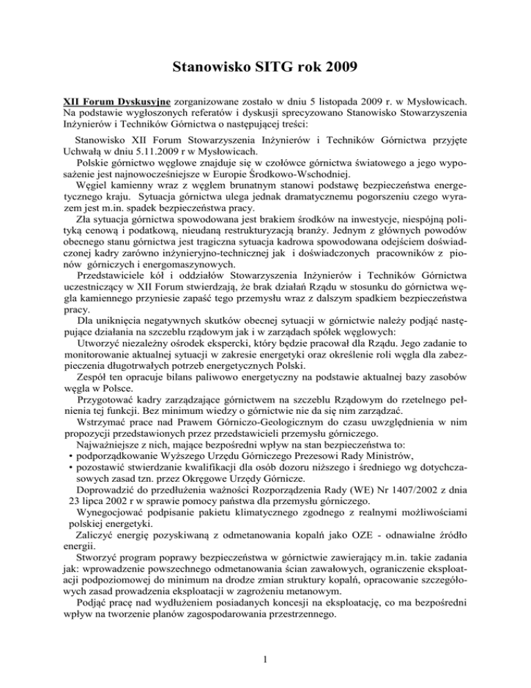 Stanowisko SITG rok 2009 XII Forum Dyskusyjne zorganizowane zostało w dniu 5 listopada 2009 r. w Mysłowicach. Na podstawie wygłoszonych referatów i dyskusji sprecyzowano Stanowisko Stowarzyszenia Inżynierów i Techników Górnictwa o następującej treści: Stanowisko XII Forum Stowarzyszenia Inżynierów i Techników Górnictwa przyjęte Uchwałą w dniu 5.11.2009 r w Mysłowicach. Polskie górnictwo węglowe znajduje się w czołówce górnictwa światowego a jego wyposażenie jest najnowocześniejsze w Europie Środkowo-Wschodniej. Węgiel kamienny wraz z węglem brunatnym stanowi podstawę bezpieczeństwa energetycznego kraju. Sytuacja górnictwa ulega jednak dramatycznemu pogorszeniu czego wyrazem jest m.in. spadek bezpieczeństwa pracy. Zła sytuacja górnictwa spowodowana jest brakiem środków na inwestycje, niespójną polityką cenową i podatkową, nieudaną restrukturyzacją branży. Jednym z głównych powodów obecnego stanu górnictwa jest tragiczna sytuacja kadrowa spowodowana odejściem doświadczonej kadry zarówno inżynieryjno-technicznej jak i doświadczonych pracowników z pionów górniczych i energomaszynowych. Przedstawiciele kół i oddziałów Stowarzyszenia Inżynierów i Techników Górnictwa uczestniczący w XII Forum stwierdzają, że brak działań Rządu w stosunku do górnictwa węgla kamiennego przyniesie zapaść tego przemysłu wraz z dalszym spadkiem bezpieczeństwa pracy. Dla uniknięcia negatywnych skutków obecnej sytuacji w górnictwie należy podjąć następujące działania na szczeblu rządowym jak i w zarządach spółek węglowych: Utworzyć niezależny ośrodek ekspercki, który będzie pracował dla Rządu. Jego zadanie to monitorowanie aktualnej sytuacji w zakresie energetyki oraz określenie roli węgla dla zabezpieczenia długotrwałych potrzeb energetycznych Polski. Zespół ten opracuje bilans paliwowo energetyczny na podstawie aktualnej bazy zasobów węgla w Polsce. Przygotować kadry zarządzające górnictwem na szczeblu Rządowym do rzetelnego pełnienia tej funkcji. Bez minimum wiedzy o górnictwie nie da się nim zarządzać. Wstrzymać prace nad Prawem Górniczo-Geologicznym do czasu uwzględnienia w nim propozycji przedstawionych przez przedstawicieli przemysłu górniczego. Najważniejsze z nich, mające bezpośredni wpływ na stan bezpieczeństwa to: • podporządkowanie Wyższego Urzędu Górniczego Prezesowi Rady Ministrów, • pozostawić stwierdzanie kwalifikacji dla osób dozoru niższego i średniego wg dotychczasowych zasad tzn. przez Okręgowe Urzędy Górnicze. Doprowadzić do przedłużenia ważności Rozporządzenia Rady (WE) Nr 1407/2002 z dnia 23 lipca 2002 r w sprawie pomocy państwa dla przemysłu górniczego. Wynegocjować podpisanie pakietu klimatycznego zgodnego z realnymi możliwościami polskiej energetyki. Zaliczyć energię pozyskiwaną z odmetanowania kopalń jako OZE - odnawialne źródło energii. Stworzyć program poprawy bezpieczeństwa w górnictwie zawierający m.in. takie zadania jak: wprowadzenie powszechnego odmetanowania ścian zawałowych, ograniczenie eksploatacji podpoziomowej do minimum na drodze zmian struktury kopalń, opracowanie szczegółowych zasad prowadzenia eksploatacji w zagrożeniu metanowym. Podjąć pracę nad wydłużeniem posiadanych koncesji na eksploatację, co ma bezpośredni wpływ na tworzenie planów zagospodarowania przestrzennego. 1 Przeprowadzić kontrolę szkoleń załóg górniczych. L.dz.996/09 Katowice, dnia 25 listopada 2009 r. Szanowny Pan Donald Tusk Prezes Rady Ministrów Wielce Szanowny Panie Premierze Stowarzyszenie Inżynierów i Techników Górnictwa skupiające ponad 13.800 członków od szeregu lat z niepokojem obserwuje politykę państwa wobec górnictwa węgla kamiennego. W odczuciu naszych członków polityka ta jest błędna i musi prowadzić, naszym zdaniem do zagrożenia bezpieczeństwa paliwowo-energetycznego naszego kraju. Wyrazem naszej troski o stan górnictwa są liczne wystąpienia do Władz Państwowych, do Prezydentów RP, szereg artykułów w czasopismach branżowych i opinie prezentowane w środkach masowego przekazu. Niestety nie znajdowały one szerszego oddźwięku u adresatów. Informujemy, że w dniu 5 listopada 2009 r. odbyło się kolejne XII Forum Dyskusyjne naszego Stowarzyszenia. Forum połączone było z XVIII Kongresem Seniorów i XVIII Sejmikiem Młodej Kadry Górniczej. Forum poprzedzone było zorganizowaną w tym samym dniu i miejscu konferencją „Górnictwo Wczoraj i Dziś”. W obradach brało udział kilkudziesięciu przedstawicieli reprezentujących wszystkie zagłębia górnicze w Polsce. Podstawą do dyskusji nad sytuacją górnictwa były dwa dokumenty: 1. List do Członków Stowarzyszenia rozesłany do Oddziałów i Kół Zakładowych w dniu 29 września br. 2. Artykuł b. Prezesa SITG, b. Wiceministra Górnictwa i b. Prezesa Wyższego Urzędu Górniczego mgr inż. Jerzego Malary opublikowany w Czasopiśmie Technicznym (nr 140, lipiec-wrzesień 2009 r.) wydrukowany w nakładzie 3500 egz. i rozesłany nie tylko do Członków Stowarzyszenia. Oba materiały przesyłamy w załączeniu. Uczestnicy Forum w pełni zaakceptowali stwierdzenia zawarte w liście do Członków Stowarzyszenia. Tu dodamy, że list ten został wysłany także do Wicepremierów Rządu do ewentualnego wykorzystania. Konkluzją Forum są następujące stwierdzenia: sytuacja górnictwa węgla kamiennego uległa dramatycznemu pogorszeniu, dotyczy to nie tylko spadku wydobycia ale także co najważniejsze spadku bezpieczeństwa pracy czego wynikiem są katastrofy górnicze, zła sytuacja górnictwa spowodowana jest nieudaną restrukturyzacją branży, niespójną polityką cenową i podatkową, brakiem środków finansowych na inwestycje (zwane wg nomenklatury UE inwestycjami początkowymi umożliwiające utrzymanie wydobycia i dostęp do zasobów), tragiczna sytuacja kadrowa spowodowana przymusowym odejściem doświadczonej kadry zarówn