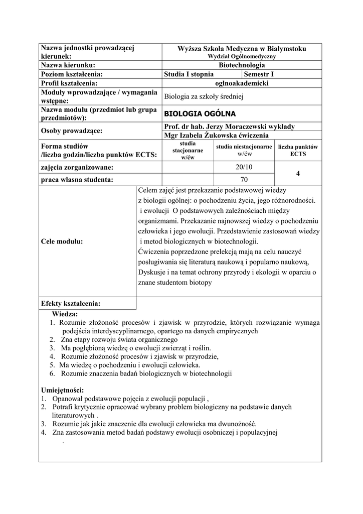 Nazwa jednostki prowadzącej Wyższa Szkoła Medyczna w Białymstoku Wydział Ogólnomedyczny kierunek: Nazwa kierunku: Biotechnologia Poziom kształcenia: Studia I stopnia Semestr I Profil kształcenia: oglnoakademicki Moduły wprowadzające / wymagania Biologia za szkoły średniej wstępne: Nazwa modułu (przedmiot lub grupa BIOLOGIA OGÓLNA przedmiotów): Prof. dr hab. Jerzy Moraczewski wykłady Osoby prowadzące: Mgr Izabela Żukowska ćwiczenia studia studia niestacjonarne liczba punktów Forma studiów stacjonarne ECTS w/ćw /liczba godzin/liczba punktów ECTS: w/ćw zajęcia zorganizowane: praca własna studenta: Cele modułu: 20/10 4 70 Celem zajęć jest przekazanie podstawowej wiedzy z biologii ogólnej: o pochodzeniu życia, jego różnorodności. i ewolucji O podstawowych zależnościach między organizmami. Przekazanie najnowszej wiedzy o pochodzeniu człowieka i jego ewolucji. Przedstawienie zastosowań wiedzy i metod biologicznych w biotechnologii. Ćwiczenia poprzedzone prelekcją mają na celu nauczyć posługiwania się literaturą naukową i popularno naukową, Dyskusje i na temat ochrony przyrody i ekologii w oparciu o znane studentom biotopy Efekty kształcenia: Wiedza: 1. Rozumie złożoność procesów i zjawisk w przyrodzie, których rozwiązanie wymaga podejścia interdyscyplinarnego, opartego na danych empirycznych 2. Zna etapy rozwoju świata organicznego 3. Ma pogłębioną wiedzę o ewolucji zwierząt i roślin. 4. Rozumie złożoność procesów i zjawisk w przyrodzie, 5. Ma wiedzę o pochodzeniu i ewolucji człowieka. 6. Rozumie znaczenia badań biologicznych w biotechnologii Umiejętności: 1. Opanował podstawowe pojęcia z ewolucji populacji , 2. Potrafi krytycznie opracować wybrany problem biologiczny na podstawie danych literaturowych . 3. Rozumie jak jakie znaczenie dla ewolucji człowieka ma dwunożność. 4. Zna zastosowania metod badań podstawy ewolucji osobniczej i populacyjnej . Kompetencje społeczne: 1. Potrafi przekazać społeczeństwu wiedzę o najnowszych osiągnięciach nauk przyrodniczych wyjaśnić zasadność prowadzenia podstawowych badań naukowych 2. Odczuwa potrzebę stałego dokształcania się i aktualizowania wiedzy, korzystając ze źróde naukowych i popularnonaukowych, dotyczących specjalistycznych nauk biologicznych 3. Wykazuje inicjatywę i samodzielność w działaniach, potrafi myśleć i działać w sposób przedsiębiorczy Forma zajęć/metody dydaktyczne: wykłady, ćwiczenia Forma i warunki zaliczenia przedmiotu w odniesieniu do efektów kształcenia: Wiedza: egzamin pisemny, pytania otwarte Umiejętności: ocena udziału w dyskusji na ćwiczeniach Kompetencje: ocena na podstawie egzaminu i ćwiczeń Treści programowe: Wykłady: studia niestacjonarne 1. 2. 3. 4. 5. 6. 7. 8. 9. Co to jest biologia jak definiujemy życie. – 1h Molekularne podstawy życia – 1h Pochodzenie życia – 1h Różnorodność organizmów żywych i podstawy systematyki biologicznej, – 3h Różnorodność środowiski i zespołów organizmów w nich żyjących – 2h Ewolucja biologiczna – podstawy ewolucji molekularnej i populacyjnej – 4h Człowiek jego pochodzenie i ewolucja – 2h Podstawowe procesy fizjologiczne zwierząt – 3h Zapłodnienie i wczesny rozwój zarodkowy ssaków jako pole do manipulacji medycznych i hodowlanych – 2h 10. Komórki macierzyste – 1h Ćwiczenia: studia niestacjonarne 1. 2. 3. 4. Charakterystyka biotopów Podlasia i znaczenie ochrony przyrody – 3h Krzyżowki genetycznre, F1, F2 – 2h Omówienie podstawowych metod biologii eksperymentalnej – 2h Zwierzęta i rośliny transgeniczne: GMO dobre i złe strony – 3h Literatura podstawowa: 1. Salomin E., P. Berg L., R Martin D., W.Biologia VII wydanie Literatura uzupełniająca: