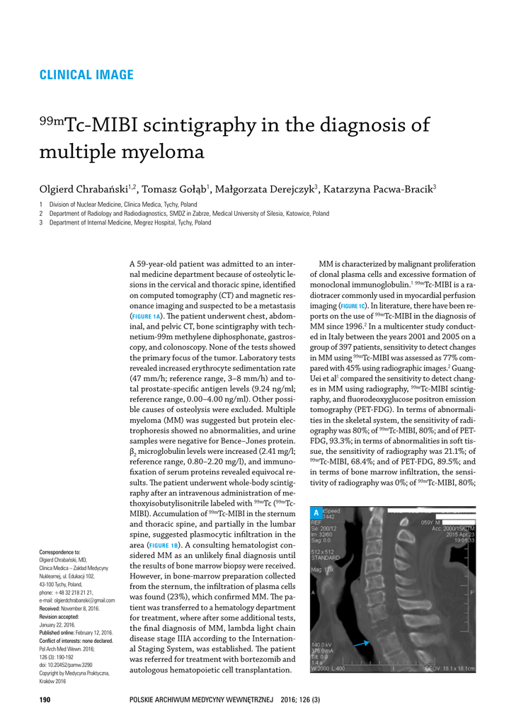 CLINICAL IMAGE Tc-MIBI scintigraphy in the diagnosis of multiple myeloma 99m Olgierd Chrabański1,2 , Tomasz Gołąb1, Małgorzata Derejczyk3 , Katarzyna Pacwa-Bracik3 1 Division of Nuclear Medicine, Clinica Medica, Tychy, Poland 2 Department of Radiology and Radiodiagnostics, SMDZ in Zabrze, Medical University of Silesia, Katowice, Poland 3 Department of Internal Medicine, Megrez Hospital, Tychy, Poland Correspondence to: Olgierd Chrabański, MD, Clinica Medica – Zakład Medycyny Nuklearnej, ul. Edukacji 102, 43-100 Tychy, Poland, phone: +48 32 218 21 21, e-mail: [email protected] Received: November 8, 2016. Revision accepted: January 22, 2016. Published online: February 12, 2016. Conflict of interests: none declared. Pol Arch Med Wewn. 2016; 126 (3): 190-192 doi: 10.20452/pamw.3290 Copyright by Medycyna Praktyczna, Kraków 2016 190 A 59-year-old patient was admitted to an internal medicine department because of osteolytic lesions in the cervical and thoracic spine, identified on computed tomography (CT) and magnetic resonance imaging and suspected to be a metastasis (FIGURE 1A ). The patient underwent chest, abdominal, and pelvic CT, bone scintigraphy with technetium-99m methylene diphosphonate, gastroscopy, and colonoscopy. None of the tests showed the primary focus of the tumor. Laboratory tests revealed increased erythrocyte sedimentation rate (47 mm/h; reference range, 3–8 mm/h) and total prostate-specific antigen levels (9.24 ng/ml; reference range, 0.00–4.00 ng/ml). Other possible causes of osteolysis were excluded. Multiple myeloma (MM) was suggested but protein electrophoresis showed no abnormalities, and urine samples were negative for Bence–Jones protein. β2 microglobulin levels were increased (2.41 mg/l; reference range, 0.80–2.20 mg/l), and immunofixation of serum proteins revealed equivocal results. The patient underwent whole-body scintigraphy after an intravenous administration of methoxyisobutylisonitrile labeled with 99mTc (99mTcMIBI). Accumulation of 99mTc-MIBI in the sternum and thoracic spine, and partially in the lumbar spine, suggested plasmocytic infiltration in the area (FIGURE 1B ). A consulting hematologist considered MM as an unlikely final diagnosis until the results of bone marrow biopsy were received. However, in bone-marrow preparation collected from the sternum, the infiltration of plasma cells was found (23%), which confirmed MM. The patient was transferred to a hematology department for treatment, where after some additional tests, the final diagnosis of MM, lambda light chain disease stage IIIA according to the International Staging System, was established. The patient was referred for treatment with bortezomib and autologous hematopoietic cell transplantation. MM is characterized by malignant proliferation of clonal plasma cells and excessive formation of monoclonal immunoglobulin.1 99mTc-MIBI is a radiotracer commonly used in myocardial perfusion imaging (FIGURE 1C). In literature, there have been reports on the use of 99mTc-MIBI in the diagnosis of MM since 1996.2 In a multicenter study conducted in Italy between the years 2001 and 2005 on a group of 397 patients, sensitivity to detect changes in MM using 99mTc-MIBI was assessed as 77% compared with 45% using radiographic images.2 GuangUei et al1 compared the sensitivity to detect changes in MM using radiography, 99mTc-MIBI scintigraphy, and fluorodeoxyglucose positron emission tomography (PET-FDG). In terms of abnormalities in the skeletal system, the sensitivity of radiography was 80%; of 99mTc-MIBI, 80%; and of PETFDG, 93.3%; in terms of abnormalities in soft tissue, the sensitivity of radiography was 21.1%; of 99mTc-MIBI, 68.4%; and of PET-FDG, 89.5%; and in terms of bone marrow infiltration, the sensitivity of radiography was 0%; of 99mTc-MIBI, 80%; A POLSKIE ARCHIWUM MEDYCYNY WEWNĘTRZNEJ 2016; 126 (3) B C and of PET-FDG, 100%. This indicates particular usefulness of 99mTc-MIBI in detecting abnormalities in bone marrow and soft tissues.1 According to recent studies, single-photon emission computed tomography/computed tomography imaging has a considerably increased sensitivity owing to attenuation correction. In FIGURE 1 A – A computed tomography scan (CT) showing osteolytic lesions in the cervical spine. The size of the biggest osteolytic lesion in the Th1 vertebra is 22 × 30 × 17 mm (arrow). Morphological imaging techniques, such as radiography, CT, and magnetic resonance imaging show osteolytic lesions but not their activity; thus, they are limited in terms of assessing active plasmocytic infiltration or treatment response. B – A whole-body 99mTc-MIBI scan showing a radiotracer accumulated in the sternum and thoracic spine, and partially in the lumbar spine, suggesting plasmocytic infiltration in the area. In our case, the 99mTc-MIBI scan provided information on the site of an active lesion, which helped identify the site for bone marrow biopsy. C – A whole-body 99mTc-MIBI scan showing a physiological radiotracer accumulated in the myocardium, liver, small intestine, salivary gland, and thyroid gland. The scan also shows the kidney during filtration and radioactive urine in the bladder. addition, an image from an inbuilt CT scanner increases its specificity by distinguishing abnormal uptake and allowing further characterization of the lesion.3 Future diagnostic imaging of MM may be new PET radiotracers: 11C-4’thiothymidine and 11C-methionine. They were compared to 18F-FDG and confirmed to be even more useful in the detection of active lesions, especially during early disease stages. Another advantage of 11C-labeled radiopharmaceuticals is much lower radiation exposure than that of 18F-labeled radiopharmaceuticals.4 99mTc-MIBI is rarely used in the diagnosis of MM despite evidence on its usefulness. The above advantages, including a relatively low cost and better accessibility compared with PET, should incline physicians to consider the use of 99mTc-MIBI scintigraphy as 