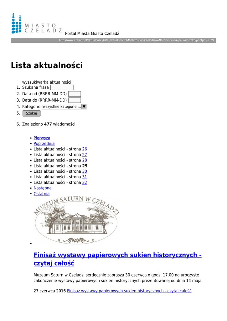 Portal Miasta Miasta Czeladź http://www.czeladz.pl/aktualnosci/lista_aktualnosci/X-Mistrzostwa-Czeladzi-w-Narciarstwie-Alpejskim-zako/printpdf/st:29 Lista aktualności wyszukiwarka aktualności 1. Szukana fraza 2. Data od (RRRR-MM-DD) 3. Data do (RRRR-MM-DD) 4. Kategorie wszystkie kategorie ... ▼ 5. Szukaj 6. Znaleziono 477 wiadomości. Pierwsza Poprzednia Lista aktualności - strona 26 Lista aktualności - strona 27 Lista aktualności - strona 28 Lista aktualności - strona 29 Lista aktualności - strona 30 Lista aktualności - strona 31 Lista aktualności - strona 32 Następna Ostatnia Finisaż wystawy papierowych sukien historycznych czytaj całość Muzeum Saturn w Czeladzi serdecznie zaprasza 30 czerwca o godz. 17.00 na uroczyste zakończenie wystawy papierowych sukien historycznych prezentowanej od dnia 14 maja. 27 czerwca 2016 Finisaż wystawy papierowych sukien historycznych - czytaj całość Zakończenie roku szkolnego - czytaj całość 24 czerwca 2016 roku w Gimnazjum Nr 2 w Czeladzi odbyło się miejskie zakończenie roku szkolnego 2015/2016. 27 czerwca 2016 Zakończenie roku szkolnego - czytaj całość Znamy nowego radnego - czytaj całość W niedzielę 26 czerwca br. odbyły się wybory uzupełniające do Rady Miejskiej w Czeladzi w okręgu nr 17. 27 czerwca 2016 Znamy nowego radnego - czytaj całość Burmistrz otrzymał absolutorium - czytaj całość 23 czerwca 2016 roku Rada Miejska w Czeladzi udzieliła burmistrzowi Zbigniewowi Szaleńcowi absolutorium za 2015 rok. 24 czerwca 2016 Burmistrz otrzymał absolutorium - czytaj całość Czeladź doceniona - czytaj całość W czwartek, 23 czerwca Burmistrz Zbigniew Szaleniec odebrał z rąk Henryka Mercika - Członka Zarządu Województwa Śląskiego, nagrodę dla najaktywniejszego w organizacji Industriady 2016 samorządu. 24 czerwca 2016 Czeladź doceniona - czytaj całość INFORMACJA O PRZEBIEGU KONSULTACJI SPOŁECZNYCH DOTYCZĄCYCH PROJEKTU UCHWAŁY WS. ZASAD WYZNACZANIA SKŁADU ORAZ ZASADY DZIAŁANIA KOMITETU REWITALIZACJI. - czytaj całość Osoby zainteresowane tematyką objętą zakresem konsultacji miały możliwość składać uwagi do ww. dokumentu w terminie od 04.05.2016 roku do 04.06.2016 roku: 24 czerwca 2016 INFORMACJA O PRZEBIEGU KONSULTACJI SPOŁECZNYCH DOTYCZĄCYCH PROJEKTU UCHWAŁY WS. ZASAD WYZNACZANIA SKŁADU ORAZ ZASADY DZIAŁANIA KOMITETU REWITALIZACJI. - czytaj całość Witajcie Wakacje! Festyn Rodzinny - czytaj całość Witajcie wakacje! Jak powitać tegoroczne wakacje? Proponujemy „Festyn Rodzinny”, który odbędzie się na odnowionym placu zabaw w parku przy ul. Mickiewicza. W programie, m.in. atrakcje i zabawy, ukochane przez dzieci dmuchańce. Start imprezy już w ten piątek 24.06.2016 o godz. 17.00. Zapraszamy mieszkańców naszego miasta! 23 czerwca 2016 Witajcie Wakacje! Festyn Rodzinny - czytaj całość Seniorzy Seniorom - czytaj całość Czeladzka grupa nieformalna „Seniorzy Seniorom”, działająca przy Klubie Seniora „Aktywna Jesień Życia” we współpracy z Zabrzańskim Stowarzyszeniem Kobiet i Ich Rodzin realizuje projekt pt: Życie zaczyna się na emeryturze. 22 czerwca 2016 Seniorzy Seniorom - czytaj całość Turniej w Bule - czytaj całość W czwartek 16 czerwca przed halą Miejskiego Ośrodka Sportu i Rekreacji w Czeladź rozegrano Turniej w Bule. 22 czerwca 2016 Turniej w Bule - czytaj całość Świętowaliśmy jubileusze współpracy - czytaj całość W tym roku przypada czterdziestolecie wymiany młodzieży między Czeladzią i Auby oraz dziesięciolecie nawiązania współpracy zagranicznej z Viesite. 21 czerwca 2016 Świętowaliśmy jubileusze współpracy - czytaj całość Pierwsza Poprzednia Lista aktualności - strona 26 Lista aktualności - strona 27 Lista aktualności - strona 28 Lista aktualności - strona 29 Lista aktualności - strona 30 Lista aktualności - strona 31 Lista aktualności - strona 32 Następna Ostatnia