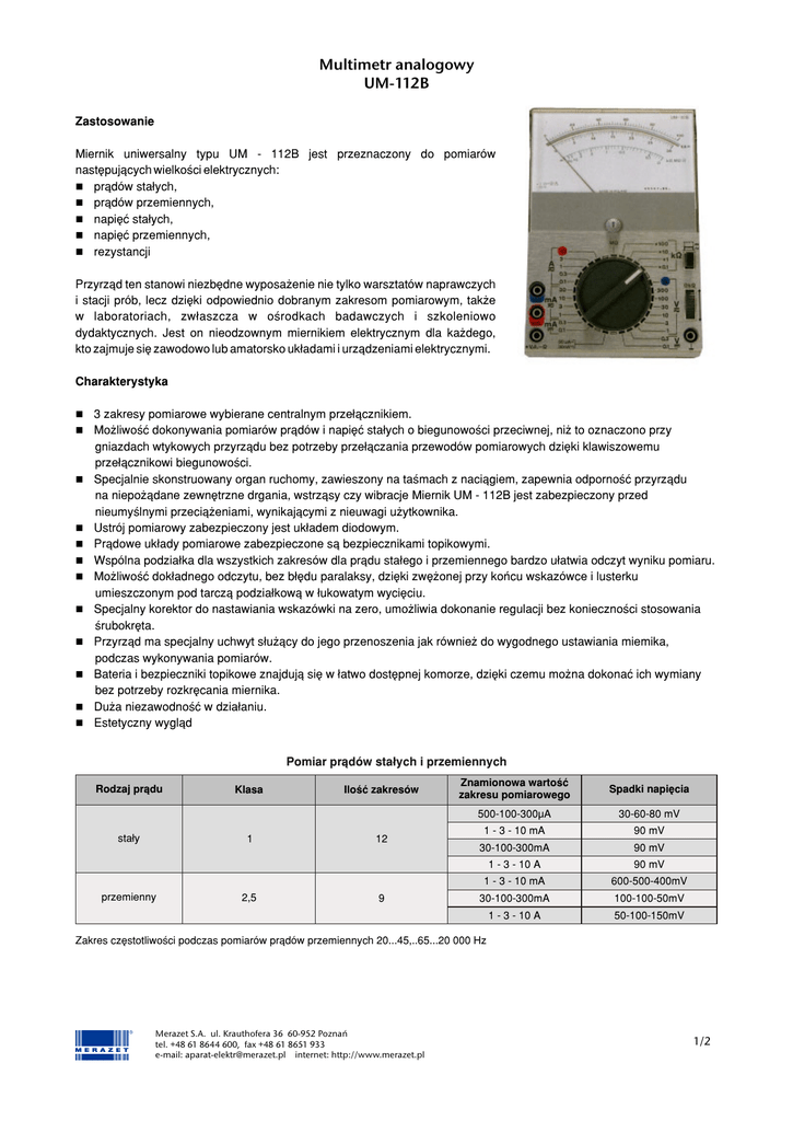 Multimetr analogowy UM-112B Zastosowanie Miernik uniwersalny typu UM - 112B jest przeznaczony do pomiarów następujących wielkości elektrycznych: n prądów stałych, n prądów przemiennych, n napięć stałych, n napięć przemiennych, n rezystancji Przyrząd ten stanowi niezbędne wyposażenie nie tylko warsztatów naprawczych i stacji prób, lecz dzięki odpowiednio dobranym zakresom pomiarowym, także w laboratoriach, zwłaszcza w ośrodkach badawczych i szkoleniowo dydaktycznych. Jest on nieodzownym miernikiem elektrycznym dla każdego, kto zajmuje się zawodowo lub amatorsko układami i urządzeniami elektrycznymi. Charakterystyka n 3 zakresy pomiarowe wybierane centralnym przełącznikiem. n Możliwość dokonywania pomiarów prądów i napięć stałych o biegunowości przeciwnej, niż to oznaczono przy n n n n n n n n n n gniazdach wtykowych przyrządu bez potrzeby przełączania przewodów pomiarowych dzięki klawiszowemu przełącznikowi biegunowości. Specjalnie skonstruowany organ ruchomy, zawieszony na taśmach z naciągiem, zapewnia odporność przyrządu na niepożądane zewnętrzne drgania, wstrząsy czy wibracje Miernik UM - 112B jest zabezpieczony przed nieumyślnymi przeciążeniami, wynikającymi z nieuwagi użytkownika. Ustrój pomiarowy zabezpieczony jest układem diodowym. Prądowe układy pomiarowe zabezpieczone są bezpiecznikami topikowymi. Wspólna podziałka dla wszystkich zakresów dla prądu stałego i przemiennego bardzo ułatwia odczyt wyniku pomiaru. Możliwość dokładnego odczytu, bez błędu paralaksy, dzięki zwężonej przy końcu wskazówce i lusterku umieszczonym pod tarczą podziałkową w łukowatym wycięciu. Specjalny korektor do nastawiania wskazówki na zero, umożliwia dokonanie regulacji bez konieczności stosowania śrubokręta. Przyrząd ma specjalny uchwyt służący do jego przenoszenia jak również do wygodnego ustawiania miemika, podczas wykonywania pomiarów. Bateria i bezpieczniki topikowe znajdują się w łatwo dostępnej komorze, dzięki czemu można dokonać ich wymiany bez potrzeby rozkręcania miernika. Duża niezawodność w działaniu. Estetyczny wygląd Pomiar prądów stałych i przemiennych Rodzaj prądu stały Klasa 1 przemienny 2,5 Ilość zakresów 12 9 Znamionowa wartość zakresu pomiarowego Spadki napięcia 500-100-300µA 30-60-80 mV 1 - 3 - 10 mA 90 mV 30-100-300mA 90 mV 1 - 3 - 10 A 90 mV 1 - 3 - 10 mA 600-500-400mV 30-100-300mA 100-100-50mV 1 - 3 - 10 A 50-100-150mV Zakres częstotliwości podczas pomiarów prądów przemiennych 20...45,..65...20 000 Hz Merazet S.A. ul. Krauthofera 36 60-952 Poznań tel. +48 61 8644 600, fax +48 61 8651 933 e-mail: [email protected] internet: http://www.merazet.pl 1/2 Multimetr UM-112B Pomiar napięć stałych Klasa Znamionowa wartość zakresu pomiarowego Ilość zakresów Rezystancja wewnętrzna 30-100-300 mV 1 1 - 3 - 10 V 10 20 kW/V 30-100-300 V 1000 V 1 MW Pomiar napięć przemiennych Klasa Ilość zakresów 2,5 Znamionowa wartość zakresu pomiarowego Rezystancja wewnętrzna Zakres częstotliwości 1V 100W 20...45...65...10 000 Hz 3V 1000W 10 V 7 30 V 1 kW/V 20...45...65...20 000 Hz 100-300 V 1000 V 20...45...65...2000 Hz Pomiar rezystancji Wartość rezystancji dla środka podz. Napięcie zasilania 0,01...0,4 kW 75 W 1,5 V 0,1...4 kW 750 W 1,5 V 0...200 kW 1 ...40 kW 7,5 kW 1,5 V 0...2 MW 10...400 kW 75 kW 10,5 V 0...20 MW 0,1...4 MW 7,5 kW 100,5 V Zakres wskazań Zakres pomiarowy 0...2 kW 0...20 kW Dane techniczne n Zasilanie układu omomierza - z baterii R-14 1,5 V i 6F22 9V Zakres 0...20 MW wymaga dodatkowego zewnętrznego źródła napięcia stałego 90 V. n Dokładność pomiaru rezystancji: n n n n n - w zakresie pomiarowym ±10% wartości wskazanej, - poza zakresem pomiarowym ±1,5% długości podziałki. Długość podziałki woltomierza i amperomierza - 100 mm Długość podziałki omomierza - 75 mm Napięcie probiercze izolacji - 3 kV Wymiary (dł. x szer. x wys.) - 186 x 134 x 67 mm Masa - ok. 0,9 kg Warunki eksploatacji o n Temperatura otoczenia: 0...23...40 C n Wilgotność względna powietrza: 25...40...60...80 % n Położenie pracy poziome Wyposażenie miernika n 2 przewody pomiarowe n Instrukcja obsługi n Karta gwarancyjna n 2 bezpieczniki topikowe n Opakowanie jednostkowe Merazet S.A. ul. Krauthofera 36 60-952 Poznań tel. +48 61 8644 600, fax +48 61 8651 933 e-mail: [email protected] internet: http://www.merazet.pl 2/2
