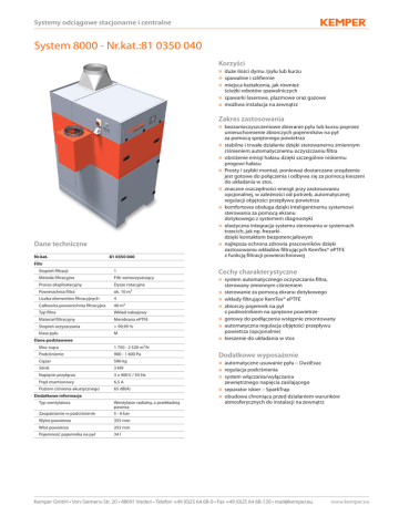Systemy odciągowe stacjonarne i centralne BG2x3_X1.tif System 8000 - Nr.kat.:81 0350 040 Korzyści » » » » » duże ilości dymu /pyłu lub kurzu spawalnie i szlifiernie miejsca kształcenia, jak również ścieżki robotów spawalniczych spawarki laserowe, plazmowe oraz gazowe możliwa instalacja na zewnątrz Zakres zastosowania » » » » » » » » Dane techniczne Nr.kat. 81 0350 040 bezzanieczyszczeniowe zbieranie pyłu lub kurzu poprzez unieruchomienie zbiorczych pojemników na pył za pomocą sprężonego powietrza stabilne i trwałe działanie dzięki sterowanemu zmiennym ciśnieniem automatycznemu oczyszczaniu filtra obniżenie emisji hałasu dzięki szczególnie niskiemu progowi hałasu Prosty i szybki montaż, ponieważ dostarczane urządzenie jest gotowe do połączenia i odbywa się za pomocą kieszeni do układania w stos. znaczne oszczędności energii przy zastosowaniu opcjonalnej, w zależności od potrzeb, automatycznej regulacji objętości przepływu powietrza komfortowa obsługa dzięki inteligentnemu systemowi sterowania za pomocą ekranu dotykowego z systemem diagnostyki elastyczna integracja systemu sterowania w systemach trzecich, jak np. frezarki dzięki kontaktom bezpotencjałowym najlepsza ochrona zdrowia pracowników dzięki zastosowaniu wkładów filtrujących KemTex® ePTFE z funkcją filtracji powierzchniowej Filtr Stopień filtracji 1 Cechy charakterystyczne Metoda filtracyjna Filtr samoczyszczący Proces eksploatacyjny Dysze rotacyjne » Powierzchnia filtra ok. 10 m² Liczba elementów filtracyjnych 4 Całkowita powierzchnia filtracyjna 40 m² Typ filtra Wkład nabojowy Materiał filtracyjny Membrana ePTFE Stopień oczyszczania > 99,99 % klasa pyłu M Dane podstawowe » » » » » » system automatycznego oczyszczania filtra, sterowany zmiennym ciśnieniem sterowanie za pomocą ekranu dotykowego wkłady filtrujące KemTex® ePTFE zbiorczy pojemnik na pył z podnośnikiem na sprężone powietrze gotowy do podłączenia wstępnie zmontowany automatyczna regulacja objętości przepływu powietrza (opcjonalnie) kieszenie do układania w stos Moc ssąca 1 750 - 2 520 m³/h Podciśnienie 900 - 1 600 Pa Dodatkowe wyposażenie Ciężar 590 kg Silnik 3 kW Napięcie przyłącza 3 x 400 V / 50 Hz Prąd znamionowy 6,5 A » » » Poziom ciśnienia akustycznego 65 dB(A) Dodatkowe informacje Typ wentylatora Wentylator radialny, z przekładnią pasową Zaopatrzenie w podciśnienie 5 - 6 bar Wylot powietrza 355 mm Wlot powietrza 355 mm Pojemność pojemnika na pył 34 l » » automatyczne usuwanie pyłu – DustEvac regulacja podciśnienia system włączania/wyłączania zewnętrznego napięcia zasilającego separator iskier – SparkTrap obudowa chroniąca przed działaniem warunków atmosferycznych do instalacji na zewnątrz Kemper GmbH • Von-Siemens-Str. 20 • 48691 Vreden • Telefon +49 (0)25 64 68-0 • Fax +49 (0)25 64 68-120 • [email protected] www.kemper.eu C K L I L I Systemy odciągowe stacjonarne i centralne TZ_VA_A2 TZ_SA_A2 C K C L L I I G G H D E H D E G H G D H E D E K TZ_DS_A2 TZ_IA_A2 B J B J A N A N B J J B A A N N F F O O F F Przedstawione modele przejściowe są opcjonalnie dostępne O O Wymiary A 962 mm B 1 402 mm C 1 413 mm D 2 110 mm E 2 410 mm F 355 mm G 1 146 mm H 1 716 mm I 706 mm J 225 mm K 355 mm L 1 170 mm N 260 mm O 896 mm Anschlusskasten wahlweise rechts oder links montierbar. Übergangsstück Anschlusskastenoptional. wahlweise rechts oder links montierbar. Übergangsstück optional. Anschlusskasten Anschlusskasten wahlweise wahlweise rechts rechts oderoder links links montierbar. montierba www.kemper.eu Übergangsstück Übergangsstück optional. optional. Kemper GmbH • Von-Siemens-Str. 20 • 48691 Vreden • Telefon +49 (0)25 64 68-0 • Fax +49 (0)25 64 68-120 • [email protected] Systemy odciągowe stacjonarne i centralne Wykres ciśnienie-objętość 2.500 2.000 1.500 1.000 500 0 0 500 1.000 1.500 2.000 2.500 3.000 3.500 charakterystyka wentylatora użytkowy wzrost ciśnienia zalecany zakres użycia Kemper GmbH • Von-Siemens-Str. 20 • 48691 Vreden • Telefon +49 (0)25 64 68-0 • Fax +49 (0)25 64 68-120 • [email protected] www.kemper.eu