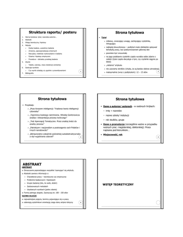 Struktura raportu/ posteru 1. Storna tytułowa: tytuł, nazwiska autorów… 2. Abstrakt 3. Wstęp teoretyczny, hipotezy 4. Strona tytułowa • Tytuł ciekawy, zwracający uwagę, zachęcający czytelnika, intrygujący najlepiej dwuczłonowy – podtytuł moŜe dokładnie opisywać tematykę pracy, być podsumowaniem głównej idei Metoda 5. Osoby badane, uczestnicy badania Zmienne, operacjonalizacja zmiennych Narzędzia, materiały wykorzystane w badaniu powinien być zrozumiały Pytania i hipotezy empiryczne Procedura – dokładny przebieg badania na jego podstawie czytelnik często wyrabia sobie zdanie o całości (tytuł często decyduje o tym, czy czytelnik sięgnie po tekst) „reklama” artykułu nie uŜywamy skrótów (chyba, Ŝe są bardzo dobrze utrwalone) maksymalnie (wraz z podtytułem): 12 – 15 słów Wyniki 6. Tabele, wykresy, miary tendencji centralnej Dyskusja wyników 7. Czy wyniki układają się zgodnie z przewidywaniami 1 Bibliografia Strona tytułowa Strona tytułowa • Przykłady: • Dane o autorze/ autorach - w osobnych linijkach: „Poza ilorazem inteligencji: Triadowa teoria inteligencji człowieka” „Tajemnica boskiego natchnienia. Witolda Gombrowicza analiza i interpretacja procesu twórczego” „Test Apercepcji Tematyczne. Przez analizę treści do analizy procesu” „Patriotyzm i nacjonalizm a postrzeganie cech Polaków i innych narodowości” „Behawioralne wskaźniki pośredniej autodestruktywności a styl wyjaśniania zdarzeń” 3 – imię + nazwisko – nazwa szkoły/ instytucji – rok studiów, grupa • Dane o promotorze (szczególnie waŜne w przypadku waŜnych prac: magisterskiej, doktorskiej): Praca napisana pod kierunkiem… • Miejscowość, rok 4 ABSTRAKT ABSTRAKT Streszczenie poprzedzające wszystkie ‘szanujące’ się artykuły. Abstrakt zawiera informacje o: Charakterze pracy – teoretyczna czy empiryczna Problemie badawczym i hipotezach Grupie badanej (kto, ile osób, dobór) Zastosowanych metodach Uzyskanych wynikach (jedno zdanie) WSTĘP TEORETYCZNY Forma jednego akapitu. Zazwyczaj ok. 100 - 150 słów SŁOWA KLUCZE najwaŜniejsze pojęcia, terminy pojawiające się w pracy ułatwiają czytelnikowi orientację czego dany artykuł dotyczy 2 5 Wstęp teoretyczny CO? Pytania • precedensy • Jaki jest cel Twoich badań? Jak moŜna sformułować problem teoretyczny uzasadniający podjęcie badań? Co chcesz wykazać, sprawdzić lub udowodnić? – co jest powtórzeniem cudzych idei, co własnym wkładem • kontekst • Jakie są teoretyczne implikacje planowanych badań, w jaki sposób badania te wiąŜą się z poprzednimi pracami w tej dziedzinie? – tradycja ... • problem adresata – dla kogo piszemy? jakim językiem powinniśmy się posługiwać? Co nasz odbiorca juŜ wie, a co musimy mu wyjaśnić? • Jakie aspekty poprzednio prowadzonych i opublikowanych badań wzbudzają wątpliwości lub „niedosyt” uzasadniający podjęcie własnych badań? 7 Struktura wstępu teoretycznego • autorytet – na czyjej (czyich) teoriach się opieramy? w jakim paradygmacie się poruszamy? 8 Struktura wstępu teoretycznego • Odniesienie do szerszego kontekstu teoretycznego • Postawienie problemu Dlaczego jest ciekawy i wart przeprowadzenia badania w jakiej dziedzinie moŜna wykorzystać wykryte prawidłowości 9 Definicje obu pojęć (część dotycząca zmiennej niezaleŜnej, osobna część dotycząca zmiennej zaleŜnej) Co juŜ wiadomo na ten temat - pokazanie badań dotyczących obu pojęć, przegląd teorii Odwołanie się do ogólniejszych zaleŜności Podrozdział integrujący – pokazujący, Ŝe moŜliwa jest zaleŜność obu zmiennych • Sformułowanie własnych przewidywań, hipotez (Hipotezy powinny wypływać z ostatniego podrozdziału) Struktura wstępu teoretycznego 10 Strona formalna wstępu • Tak więc wprowadzenie powinno pokazać, jakie były inspiracje i przesłanki teoretyczne dla postawienia hipotez badawczych (których sformułowanie kończy • Tekst wstępu teoretycznego powinien być podzielony na akapity wprowadzenie) • Akapit • Wprowadzenie jest prezentacją i podsumowaniem stanowi zamkniętą całość badania (pytanie badawcze) oraz jakie jest przypuszczalne ma swój początek, rozwinięcie i zakończenie wyjaśnienie tego zjawiska (podstawa teoretyczna, hipoteza rozwija jedną, centralną myśl ułatwia orientację w tekście rozwaŜań: jakie zjawisko psychologiczne jest przedmiotem badawcza) 11 12 Przykłady cytowań Strona formalna wstępu - NAJCZĘŚCIEJ UśYWANE ZWROTY - • Mile widziane wytłuszczenia najwaŜniejszych pojęć i terminów. • Najczęściej uŜywane zwroty: XXXX i YYYY (1986) wykazali, Ŝe… • czcionka 12 W badaniach XXX (1977, za: Trzebiński, 2001) • podwójny odstęp Jak twierdzą XXX i YYY (1988) …. • strony numerowane ZaleŜność tę potwierdzono w innych badaniach (XXX, YYY 2000) Według teorii Freuda (1998)… • Raport • Poster (czcionka co najmniej 14, podwójny odstęp – waŜne by było czytelne) 13 14 Jak zrobić poster? PRZYKŁADY CYTOWAŃ W • Poster tworzą naklejone na arkusz bristolu kartki maszynopisu (zwykle 8 – 12) badaniach Murphy i Zajonca (1993) • Widoczny z daleka, wzbudzający zainteresowanie tytuł Według Greenwalda i Banaji (1996; za: Greenwald, 1999) • Powinien być widoczny z daleka (zasada kciuka) • Czcionka – minimum 14, ale lepsza: 16, 18 Grupa badaczy (Locke, MacLeod i Walker, 1994) zastosowała... kolejnym powołaniu się na tych autorów: (Locke i inni, 1994) • Tytuły sekcji (podrozdziałów) – pogrubioną czcionką, najlepiej o większym niŜ tekst rozmiarze • Poster to „streszczenie” raportu – najwaŜniejsze informacje ze wstępu teoretycznego, najwaŜniejsze wyniki Przy 15 1. CIEKAWY TYTUŁ 4. WSTĘP teoretyczny a) Cel badania b) Co juŜ wiadomo c) Własny model hipotezy 5. ZMIENNE wskaźniki 6. METODA Uczestnicy Materiały Procedura 7. WYNIKI 8. DYSKUSJA wyników 2. AUTORZY 3. ABST