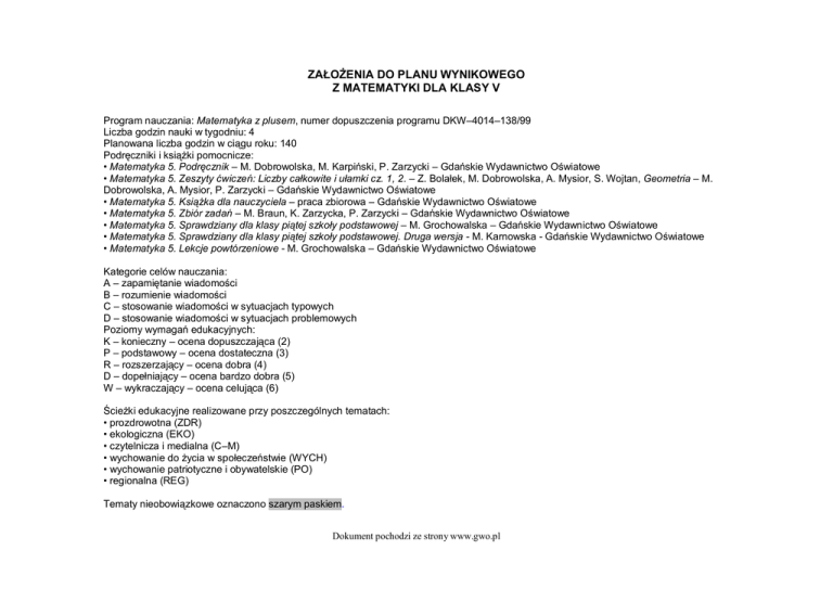 ZAŁOŻENIA DO PLANU WYNIKOWEGO Z MATEMATYKI DLA KLASY V Program nauczania: Matematyka z plusem, numer dopuszczenia programu DKW–4014–138/99 Liczba godzin nauki w tygodniu: 4 Planowana liczba godzin w ciągu roku: 140 Podręczniki i książki pomocnicze: • Matematyka 5. Podręcznik – M. Dobrowolska, M. Karpiński, P. Zarzycki – Gdańskie Wydawnictwo Oświatowe • Matematyka 5. Zeszyty ćwiczeń: Liczby całkowite i ułamki cz. 1, 2. – Z. Bolałek, M. Dobrowolska, A. Mysior, S. Wojtan, Geometria – M. Dobrowolska, A. Mysior, P. Zarzycki – Gdańskie Wydawnictwo Oświatowe • Matematyka 5. Książka dla nauczyciela – praca zbiorowa – Gdańskie Wydawnictwo Oświatowe • Matematyka 5. Zbiór zadań – M. Braun, K. Zarzycka, P. Zarzycki – Gdańskie Wydawnictwo Oświatowe • Matematyka 5. Sprawdziany dla klasy piątej szkoły podstawowej – M. Grochowalska – Gdańskie Wydawnictwo Oświatowe • Matematyka 5. Sprawdziany dla klasy piątej szkoły podstawowej. Druga wersja - M. Karnowska - Gdańskie Wydawnictwo Oświatowe • Matematyka 5. Lekcje powtórzeniowe - M. Grochowalska – Gdańskie Wydawnictwo Oświatowe Kategorie celów nauczania: A – zapamiętanie wiadomości B – rozumienie wiadomości C – stosowanie wiadomości w sytuacjach typowych D – stosowanie wiadomości w sytuacjach problemowych Poziomy wymagań edukacyjnych: K – konieczny – ocena dopuszczająca (2) P – podstawowy – ocena dostateczna (3) R – rozszerzający – ocena dobra (4) D – dopełniający – ocena bardzo dobra (5) W – wykraczający – ocena celująca (6) Ścieżki edukacyjne realizowane przy poszczególnych tematach: • prozdrowotna (ZDR) • ekologiczna (EKO) • czytelnicza i medialna (C–M) • wychowanie do życia w społeczeństwie (WYCH) • wychowanie patriotyczne i obywatelskie (PO) • regionalna (REG) Tematy nieobowiązkowe oznaczono szarym paskiem. Dokument pochodzi ze strony www.gwo.pl PLAN WYNIKOWY Z MATEMATYKI DLA KLASY V DZIAŁ PROGRAMOWY LICZBY NATURALNE (17 h) JEDNOSTKA LEKCYJNA JEDNOSTKA TEMATYCZNA CELE KSZTAŁCENIA W UJĘCIU OPERACYJNYM WRAZ Z OKREŚLENIEM WYMAGAŃ KATEGORIA A KATEGORIA B KATEGORIA C KATEGORIA D UCZEŃ ZNA: UCZEŃ ROZUMIE: UCZEŃ UMIE: UCZEŃ UMIE: 1 O czym będziemy się uczyli na lekcjach matematyki w klasie piątej? (ZDR) 2–3 Zapisywanie i porównywanie liczb. • pojęcie cyfry (K) Rachunki pamięciowe. (C–M, EKO, PO) 4–5 • dziesiątkowy system • zapisywać liczby za • podać liczbę największą pozycyjny (K) • różnicę między cyfrą a liczbą (K) • pojęcie osi liczbowej (K) • zależność wartości liczby od położenia jej cyfr (K) pomocą cyfr (K) • odczytywać liczby zapisane cyframi (K) • zapisywać liczby słowami (K-P) • porównywać liczby (K) • porządkować liczby w kolejności od najmniejszej do największej lub odwrotnie (K-P) • przedstawiać liczby naturalne na osi liczbowej (K) • odczytywać współrzędne punktów na osi liczbowej (K-R) • przedstawiać na osi liczby naturalne spełniające określone warunki (P-R) • ustalać jednostki na osiach liczbowych na podstawie współrzędnych danych punktów (P-R) i najmniejszą w zbiorze skończonym (P-R) • zapisywać liczby, których cyfry spełniają podane warunki (R-W) • tworzyć liczby przez dopisywanie do danej liczby cyfr na początku i na końcu oraz porównywać utworzoną liczbę z daną (D-W) • nazwy elementów • rolę liczb 0 i 1 w • pamięciowo dodawać i • rozwiązywać nietypowe działań (K) • kolejność wykonywania działań, gdy nie wystepują nawiasy (K) • kolejność wykonywania działań, gdy występują nawiasy (P) • kolejność wykonywania działań, gdy występują mnożeniu i dzieleniu (K) • rolę liczb 0 i 1 w dodawaniu i odejmowaniu (K) • porównywanie ilorazowe (P) • porównywanie różnicowe (P) odejmować liczby w zakresie 100 (K) • pamięciowo mnożyć liczby dwucyfrowe przez jednocyfrowe w zakresie 100 (K) • pamięciowo dzielić liczby dwucyfrowe przez jednocyfrowe lub zadania tekstowe wielodziałaniowe (D-W) • uzupełniać brakujące liczby w wyrażeniu arytmetycznym, tak by otrzymać ustalony wynik (R-W) • wstawiać nawiasy, tak by otrzymać żądany wynik Dokument pochodzi ze strony www.gwo.pl nawiasy i potęgi (R) • pojęcie kwadratu i sześcianu liczby (P) 6–7 Rachunki pisemne. (C–M, REG) dwucyfrowe w zakresie 100 (K) • posługiwać się liczbą 0 w dodawaniu i odejmowaniu (K) • posługiwać się liczbą 0 w mnożeniu i dzieleniu (K) • mnożyć przez 0 (K) • dopełniać składniki do określonej sumy (P) • obliczać odjemną (odjemnik), gdy dane są różnica i odjemnik (odjemna) (P) • obliczać dzielną (dzielnik), gdy dane są iloraz i dzielnik (dzielna) (P) • stosować prawo przemienności i łączności dodawania (R) • wykonywać dzielenie z resztą (K) • obliczać kwadraty i sześciany liczb (P) • zamieniać jednostki (PR) • rozwiązywać zadania tekstowe: – jednodziałaniowe (P) – wielodziałaniowe (R) (D-W) • algorytmy czterech • potrzebę stosowania • dodawać i odejmować • odtwarzać brakujące działań pisemnych (K) działań pisemnych (K) pisemnie liczby bez przekraczania progu dziesiątkowego i z przekraczaniem jednego progu dziesiątkowego (K) • dodawać i odejmować pisemnie liczby z przekraczaniem kolejnych progów dziesiątkowych (P) • mnożyć i dzielić pisemnie liczby wielocyfrowe przez jednocyfrowe (K) • mnożyć pisemnie liczby wielocyfrowe (P) cyfry w działaniach pisemnych (D-W) • rozwiązywać zadania tekstowe z zastosowaniem działań pisemnych (D) Dokument pochodzi ze strony www.gwo.pl • dzielić pisemnie liczby wielocyfrowe przez wielocyfrowe (P) • mnożyć pisemnie liczby wielocyfrowe przez liczby zakończone zerami (P) • dzielić liczby zakończone zerami (P) • powiększać lub pomniejszać liczby o n lub n razy (K-R) • odtwarzać brakujące cyfry w działaniach pisemnych (P-