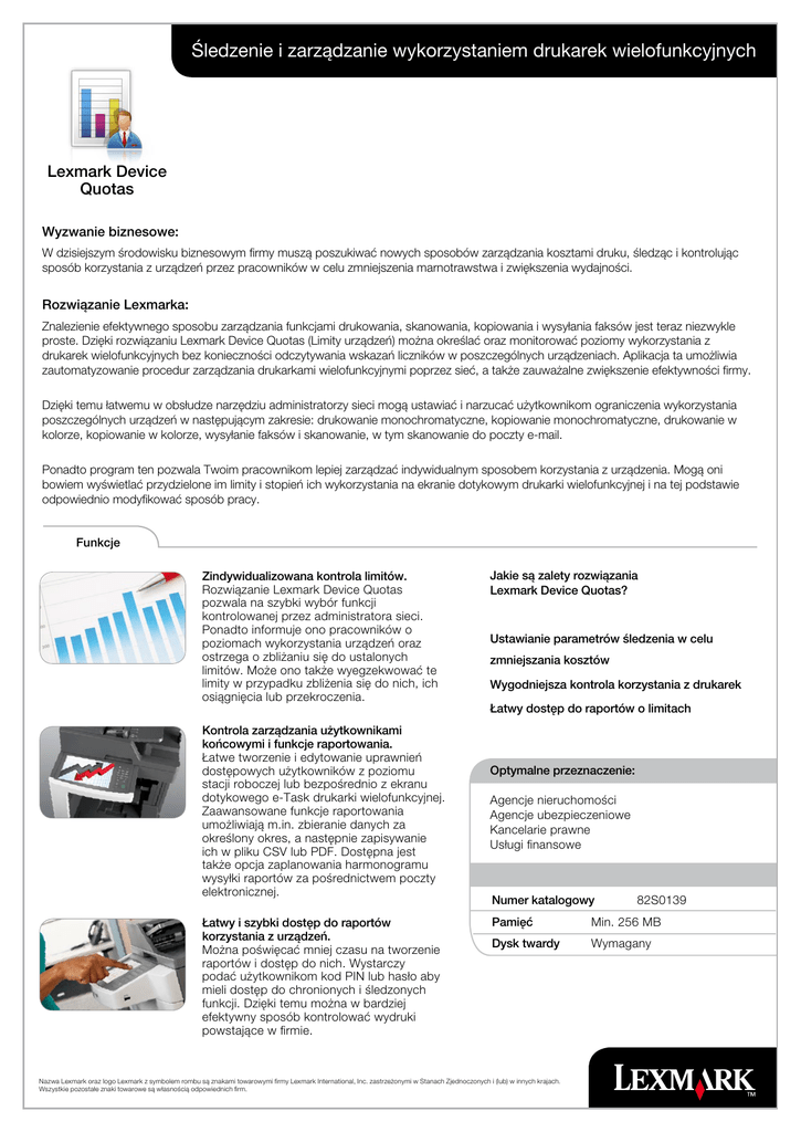 Śledzenie i zarządzanie wykorzystaniem drukarek wielofunkcyjnych Lexmark Device Quotas Wyzwanie biznesowe: W dzisiejszym środowisku biznesowym firmy muszą poszukiwać nowych sposobów zarządzania kosztami druku, śledząc i kontrolując sposób korzystania z urządzeń przez pracowników w celu zmniejszenia marnotrawstwa i zwiększenia wydajności. Rozwiązanie Lexmarka: Znalezienie efektywnego sposobu zarządzania funkcjami drukowania, skanowania, kopiowania i wysyłania faksów jest teraz niezwykle proste. Dzięki rozwiązaniu Lexmark Device Quotas (Limity urządzeń) można określać oraz monitorować poziomy wykorzystania z drukarek wielofunkcyjnych bez konieczności odczytywania wskazań liczników w poszczególnych urządzeniach. Aplikacja ta umożliwia zautomatyzowanie procedur zarządzania drukarkami wielofunkcyjnymi poprzez sieć, a także zauważalne zwiększenie efektywności firmy. Dzięki temu łatwemu w obsłudze narzędziu administratorzy sieci mogą ustawiać i narzucać użytkownikom ograniczenia wykorzystania poszczególnych urządzeń w następującym zakresie: drukowanie monochromatyczne, kopiowanie monochromatyczne, drukowanie w kolorze, kopiowanie w kolorze, wysyłanie faksów i skanowanie, w tym skanowanie do poczty e-mail. Ponadto program ten pozwala Twoim pracownikom lepiej zarządzać indywidualnym sposobem korzystania z urządzenia. Mogą oni bowiem wyświetlać przydzielone im limity i stopień ich wykorzystania na ekranie dotykowym drukarki wielofunkcyjnej i na tej podstawie odpowiednio modyfikować sposób pracy. Funkcje Zindywidualizowana kontrola limitów. Rozwiązanie Lexmark Device Quotas pozwala na szybki wybór funkcji kontrolowanej przez administratora sieci. Ponadto informuje ono pracowników o poziomach wykorzystania urządzeń oraz ostrzega o zbliżaniu się do ustalonych limitów. Może ono także wyegzekwować te limity w przypadku zbliżenia się do nich, ich osiągnięcia lub przekroczenia. Kontrola zarządzania użytkownikami końcowymi i funkcje raportowania. Łatwe tworzenie i edytowanie uprawnień dostępowych użytkowników z poziomu stacji roboczej lub bezpośrednio z ekranu dotykowego e-Task drukarki wielofunkcyjnej. Zaawansowane funkcje raportowania umożliwiają m.in. zbieranie danych za określony okres, a następnie zapisywanie ich w pliku CSV lub PDF. Dostępna jest także opcja zaplanowania harmonogramu wysyłki raportów za pośrednictwem poczty elektronicznej. Łatwy i szybki dostęp do raportów korzystania z urządzeń. Można poświęcać mniej czasu na tworzenie raportów i dostęp do nich. Wystarczy podać użytkownikom kod PIN lub hasło aby mieli dostęp do chronionych i śledzonych funkcji. Dzięki temu można w bardziej efektywny sposób kontrolować wydruki powstające w firmie. Jakie są zalety rozwiązania Lexmark Device Quotas? Ustawianie parametrów śledzenia w celu zmniejszania kosztów Wygodniejsza kontrola korzystania z drukarek Łatwy dostęp do raportów o limitach Optymalne przeznaczenie: Agencje nieruchomości Agencje ubezpieczeniowe Kancelarie prawne Usługi finansowe Numer katalogowy 82S0139 Pamięć Min. 256 MB Dysk twardy Wymagany Nazwa Lexmark oraz logo Lexmark z symbolem rombu są znakami towarowymi firmy Lexmark International, Inc. zastrzeżonymi w Stanach Zjednoczonych i (lub) w innych krajach. Wszystkie pozostałe znaki towarowe są własnością odpowiednich firm.
