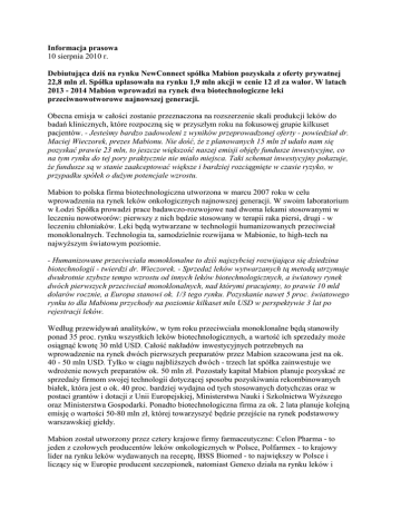 Informacja prasowa 10 sierpnia 2010 r. Debiutująca dziś na rynku NewConnect spółka Mabion pozyskała z oferty prywatnej 22,8 mln zł. Spółka uplasowała na rynku 1,9 mln akcji w cenie 12 zł za walor. W latach 2013 - 2014 Mabion wprowadzi na rynek dwa biotechnologiczne leki przeciwnowotworowe najnowszej generacji. Obecna emisja w całości zostanie przeznaczona na rozszerzenie skali produkcji leków do badań klinicznych, które rozpoczną się w przyszłym roku na fokusowej grupie kilkuset pacjentów. - Jesteśmy bardzo zadowoleni z wyników przeprowadzonej oferty - powiedział dr. Maciej Wieczorek, prezes Mabionu. Nie dość, że z planowanych 15 mln zł udało nam się pozyskać prawie 23 mln, to jeszcze większość naszej emisji objęły fundusze inwestycyjne, co na tym rynku do tej pory praktycznie nie miało miejsca. Taki schemat inwestycyjny pokazuje, że fundusze są w stanie zaakceptować większe i bardziej rozciągnięte w czasie ryzyko, w przypadku spółek o dużym potencjale wzrostu. Mabion to polska firma biotechnologiczna utworzona w marcu 2007 roku w celu wprowadzenia na rynek leków onkologicznych najnowszej generacji. W swoim laboratorium w Łodzi Spółka prowadzi prace badawczo-rozwojowe nad dwoma lekami stosowanymi w leczeniu nowotworów: pierwszy z nich będzie stosowany w terapii raka piersi, drugi - w leczeniu chłoniaków. Leki będą wytwarzane w technologii humanizowanych przeciwciał monoklonalnych. Technologia ta, samodzielnie rozwijana w Mabionie, to high-tech na najwyższym światowym poziomie. - Humanizowane przeciwciała monoklonalne to dziś najszybciej rozwijająca się dziedzina biotechnologii - twierdzi dr. Wieczorek. - Sprzedaż leków wytwarzanych tą metodą utrzymuje dwukrotnie szybsze tempo wzrostu od innych leków biotechnologicznych, a światowy rynek dwóch pierwszych przeciwciał monoklonalnych, nad którymi pracujemy, to prawie 10 mld dolarów rocznie, a Europa stanowi ok. 1/3 tego rynku. Pozyskanie nawet 5 proc. światowego rynku to dla Mabionu przychody na poziomie kilkaset mln USD w perspektywie 3 lat po rejestracji leków. Według przewidywań analityków, w tym roku przeciwciała monoklonalne będą stanowiły ponad 35 proc. rynku wszystkich leków biotechnologicznych, a wartość ich sprzedaży może osiągnąć kwotę 30 mld USD. Całość nakładów inwestycyjnych potrzebnych na wprowadzenie na rynek dwóch pierwszych preparatów przez Mabion szacowana jest na ok. 40 - 50 mln USD. Tylko w ciągu najbliższych dwóch - trzech lat spółka zainwestuje we wdrożenie nowych preparatów ok. 50 mln zł. Pozostały kapitał Mabion planuje pozyskać ze sprzedaży firmom swojej technologii dotyczącej sposobu pozyskiwania rekombinowanych białek, która jest o ok. 40 proc. bardziej wydajna od tych stosowanych dotychczas oraz w postaci grantów i dotacji z Unii Europejskiej, Ministerstwa Nauki i Szkolnictwa Wyższego oraz Ministerstwa Gospodarki. Ponadto biotechnologiczna firma za ok. 2 lata planuje kolejną emisję o wartości 50-80 mln zł, której towarzyszyć będzie przejście na rynek podstawowy warszawskiej giełdy. Mabion został utworzony przez cztery krajowe firmy farmaceutyczne: Celon Pharma - to jeden z czołowych producentów leków onkologicznych w Polsce, Polfarmex - to krajowy lider na rynku leków wydawanych na receptę, IBSS Biomed - to największy w Polsce i liczący się w Europie producent szczepionek, natomiast Genexo działa na rynku leków i wyrobów medycznych, głównie w dziedzinie diabetologii. W skład Mabionu wchodzą także dwa podmioty prowadzące badania naukowe z zakresu biotechnologii: BioCentrum i Biotech Consulting. Więcej informacji: Mariusz Lewandowski 607 199 772 oraz na www.mabion.eu