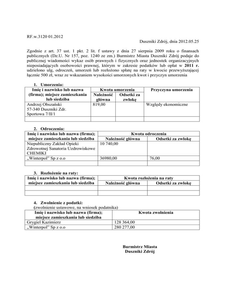 RF.w.3120 01.2012 Duszniki Zdrój, dnia 2012.05.25 Zgodnie z art. 37 ust. 1 pkt. 2 lit. f ustawy z dnia 27 sierpnia 2009 roku o finansach publicznych (Dz.U. Nr 157, poz. 1240 ze zm.) Burmistrz Miasta Duszniki Zdrój podaje do publicznej wiadomości wykaz osób prawnych i fizycznych oraz jednostek organizacyjnych nieposiadających osobowości prawnej, którym w zakresie podatków lub opłat w 2011 r. udzielono ulg, odroczeń, umorzeń lub rozłożono spłatę na raty w kwocie przewyższającej łącznie 500 zł, wraz ze wskazaniem wysokości umorzonych kwot i przyczyn umorzenia 1. Umorzenia: Imię i nazwisko lub nazwa (firma); miejsce zamieszkania lub siedziba Andrzej Obszański 57-340 Duszniki Zdr. Sportowa 7/II/1 Kwota umorzenia Należność Odsetki za główna zwłokę 819,00 2. Odroczenia: Imię i nazwisko lub nazwa (firma); miejsce zamieszkania lub siedziba Niepubliczny Zakład Opieki Zdrowotnej Sanatoria Uzdrowiskowe CHEMIKI „Winterpol” Sp z o.o 3. Rozłożenie na raty: Imię i nazwisko lub nazwa (firma); miejsce zamieszkania lub siedziba Przyczyna umorzenia Względy ekonomiczne Kwota odroczenia Należność główna Odsetki za zwłokę 10 740,00 36980,00 76,00 Kwota rozłożenia na raty Należność główna Odsetki za zwłokę 4. Zwolnienie z podatki: (zwolnienie ustawowe, na wniosek podatnika) Imię i nazwisko lub nazwa (firma); Kwota zwolnienia miejsce zamieszkania lub siedziba Grygiel Kazimierz 128 364,00 „Winterpol” Sp z o.o 280 277,00 Burmistrz Miasta Duszniki Zdrój BURMISTRZ MIASTA DUSZNIKI ZDRÓJ Duszniki Zdrój, dnia 2012.05.25 RF.w.3120 01.2012.01 Na podstawie art.6 ust.1 pkt 5 lit.g ustawy z dnia 6 września 2001 roku o dostępie do informacji publicznych (Dz.U.Nr 112, poz.1198 ze zmianami), podaję informację w zakresie pomocy publicznej udzielonej w okresie do 01.01.2011 r. do 31.12.2011 r. Lp Nazwisko i imię / nazwa 1 1. 2. 3. 4. 5. 2 Grygiel Kazimierz „Winterpol” Sp z o.o Niepubliczny Zakład Opieki Zdrowotnej Sanatoria Uzdrowiskowe CHEMIK „Winterpol” Sp z o.o Andrzej Obszański 57-340 Duszniki Zdr. Sportowa 7/II/1 Kwota udzielonej pomocy Forma udzielonej pomocy publiczne (w zł) publicznej 3 4 128 364,00 Zwolnienie 280 277,00 Zwolnienie 10 740,00 Względy ekonomiczne 36980,00 819,00 Względy ekonomiczne Względy ekonomiczne Burmistrz Miasta Duszniki Zdrój RF.w.3120 01.2013 Duszniki Zdrój, dnia 2013.01.25 Zgodnie z art. 37 ust. 1 pkt. 2 lit. f ustawy z dnia 27 sierpnia 2009 roku o finansach publicznych (Dz.U. Nr 157, poz. 1240 ze zm.) Burmistrz Miasta Duszniki Zdrój podaje do publicznej wiadomości wykaz osób prawnych i fizycznych oraz jednostek organizacyjnych nieposiadających osobowości prawnej, którym w zakresie podatków lub opłat w 2012 r. udzielono ulg, odroczeń, umorzeń lub rozłożono spłatę na raty w kwocie przewyższającej łącznie 500 zł, wraz ze wskazaniem wysokości umorzonych kwot i przyczyn umorzenia 5. Umorzenia: Imię i nazwisko lub nazwa (firma); miejsce zamieszkania lub siedziba Kwota umorzenia Należność Odsetki za główna zwłokę 6. Odroczenia: Imię i nazwisko lub nazwa (firma); miejsce zamieszkania lub siedziba Niepubliczny Zakład Opieki Zdrowotnej Sanatoria Uzdrowiskowe CHEMIK Zyzik Cecylia 7. Rozłożenie na raty: Imię i nazwisko lub nazwa (firma); miejsce zamieszkania lub siedziba Dorota i Mariusz Pieńkos Przyczyna umorzenia Kwota odroczenia Należność główna Odsetki za zwłokę 6 726,00 0,00 2 016,00 63,00 Kwota rozłożenia na raty Należność główna Odsetki za zwłokę 12 037,00 1 234,00 8. Zwolnienie z podatki: (zwolnienie ustawowe, na wniosek podatnika) Imię i nazwisko lub nazwa (firma); Kwota zwolnienia miejsce zamieszkania lub siedziba Grygiel Kazimierz 128 364,00 Burmistrz Miasta Duszniki Zdrój BURMISTRZ MIASTA DUSZNIKI ZDRÓJ Duszniki Zdrój, dnia 2013.01.25 RF.w.3120 01.2013.01 Na podstawie art.6 ust.1 pkt 5 lit.g ustawy z dnia 6 września 2001 roku o dostępie do informacji publicznych (Dz.U.Nr 112, poz.1198 ze zmianami), podaję informację w zakresie pomocy publicznej udzielonej w okresie do 01.01.2012 r. do 31.12.2012 r. Lp Nazwisko i imię / nazwa 1 1. 2. 2 Grygiel Kazimierz Niepubliczny Zakład Opieki Zdrowotnej Sanatoria Uzdrowiskowe CHEMIK Kwota udzielonej pomocy Forma udzielonej pomocy publiczne (w zł) publicznej 3 4 128 364,00 Zwolnienie 6 726,00 Względy ekonomiczne Burmistrz Miasta Duszniki Zdrój RF.w.3120 01.2014 Duszniki Zdrój, dnia 2014.01.10 Zgodnie z art. 37 ust. 1 pkt. 2 lit. f ustawy z dnia 27 sierpnia 2009 roku o finansach publicznych (Dz.U. Nr 157, poz. 1240 ze zm.) Burmistrz Miasta Duszniki Zdrój podaje do publicznej wiadomości wykaz osób prawnych i fizycznych oraz jednostek organizacyjnych nieposiadających osobowości prawnej, którym w zakresie podatków lub opłat w 2013 r. udzielono ulg, odroczeń, umorzeń lub rozłożono spłatę na raty w kwocie przewyższającej łącznie 500 zł, wraz ze wskazaniem wysokości umorzonych kwot i przyczyn umorzenia 1. Umorzenia: Imię i nazwisko lub nazwa (firma); miejsce zamieszkania lub siedziba Kwota umorzenia Należność Odsetki za główna zwłokę Przyczyna umorzenia 2. Odroczenia: Imię i nazwisko lub nazwa (firma); miejsce zamieszkania lub siedziba Kwota odroczenia Należność główna Odsetki za zwłokę 3. Rozłożenie na raty: Imię i nazwisko lub nazwa (firma); miejsce zamieszkania lub siedziba Lipiec Wanda KEYPOL Sp z o.o. Kwota rozłożenia na raty Należność główna Odsetki za zwłokę 5 373,00 118,00 44 718,60 4 158,00 4. Zwolnienie z podatku: (zwolnienie ustawowe, na wniosek podatnika) Imię i nazwisko lub nazwa (firma); Kwota zwolnienia miejsce zamieszkania lub siedziba Grygiel Kazimierz 128 364,00 „Winterpol” Sp. z o.o. 242 956,00 Burmistrz Miasta Duszniki Zdrój BURMISTRZ MIASTA DUSZNIKI ZDRÓJ Duszniki Zdrój, dnia 2014.01.10 RF.w.3120 01.2014.01 Na podstawie art.6 ust.1 pkt 5 lit.g ustawy z dnia 6 września 2001 roku o dostępie do informacji publicznych (Dz.U.Nr 112, poz.1198 ze zmia