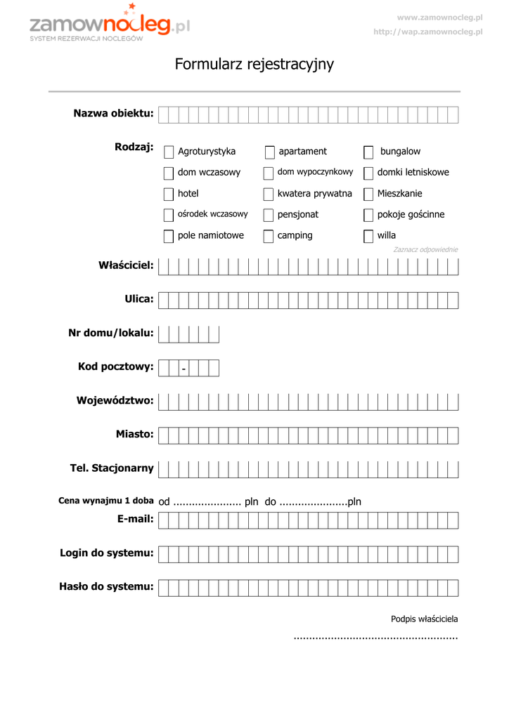 www.zamownocleg.pl http://wap.zamownocleg.pl Formularz rejestracyjny Nazwa obiektu: Rodzaj: Agroturystyka apartament bungalow dom wczasowy dom wypoczynkowy domki letniskowe hotel kwatera prywatna Mieszkanie ośrodek wczasowy pensjonat pokoje gościnne pole namiotowe camping willa Zaznacz odpowiednie Właściciel: Ulica: Nr domu/lokalu: Kod pocztowy: - Województwo: Miasto: Tel. Stacjonarny Cena wynajmu 1 doba od ...................... pln do ......................pln E-mail: Login do systemu: Hasło do systemu: Podpis właściciela .....................................................