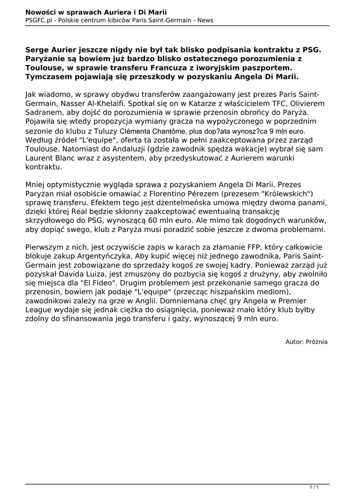 Nowości w sprawach Auriera i Di Marii PSGFC.pl - Polskie centrum kibiców Paris Saint-Germain - News Serge Aurier jeszcze nigdy nie był tak blisko podpisania kontraktu z PSG. Paryżanie są bowiem już bardzo blisko ostatecznego porozumienia z Toulouse, w sprawie transferu Francuza z iworyjskim paszportem. Tymczasem pojawiają się przeszkody w pozyskaniu Angela Di Marii. Jak wiadomo, w sprawy obydwu transferów zaangażowany jest prezes Paris SaintGermain, Nasser Al-Khelaifi. Spotkał się on w Katarze z właścicielem TFC, Olivierem Sadranem, aby dojść do porozumienia w sprawie przenosin obrońcy do Paryża. Pojawiła się wtedy propozycja wymiany gracza na wypożyczonego w poprzednim sezonie do klubu z Tuluzy Clémenta Chantôme, plus dop?ata wynosz?ca 9 mln euro. Według źródeł "L'equipe", oferta ta została w pełni zaakceptowana przez zarząd Toulouse. Natomiast do Andaluzji (gdzie zawodnik spędza wakacje) wybrał się sam Laurent Blanc wraz z asystentem, aby przedyskutować z Aurierem warunki kontraktu. Mniej optymistycznie wygląda sprawa z pozyskaniem Angela Di Marii. Prezes Paryżan miał osobiście omawiać z Florentino Pérezem (prezesem "Królewskich") sprawę transferu. Efektem tego jest dżentelmeńska umowa między dwoma panami, dzięki której Real będzie skłonny zaakceptować ewentualną transakcję skrzydłowego do PSG, wynoszącą 60 mln euro. Ale mimo tak dogodnych warunków, aby dopiąć swego, klub z Paryża musi poradzić sobie jeszcze z dwoma problemami. Pierwszym z nich, jest oczywiście zapis w karach za złamanie FFP, który całkowicie blokuje zakup Argentyńczyka. Aby kupić więcej niż jednego zawodnika, Paris SaintGermain jest zobowiązane do sprzedaży kogoś ze swojej kadry. Ponieważ zarząd już pozyskał Davida Luiza, jest zmuszony do pozbycia się kogoś z drużyny, aby zwolniło się miejsca dla "El Fideo". Drugim problemem jest przekonanie samego gracza do przenosin, bowiem jak podaje "L'equipe" (przecząc hiszpańskim mediom), zawodnikowi zależy na grze w Anglii. Domniemana chęć gry Angela w Premier League wydaje się jednak ciężka do osiągnięcia, ponieważ mało który klub byłby zdolny do sfinansowania jego transferu i gaży, wynoszącej 9 mln euro. Autor: Próżnia 1/1 Powered by TCPDF (www.tcpdf.org)