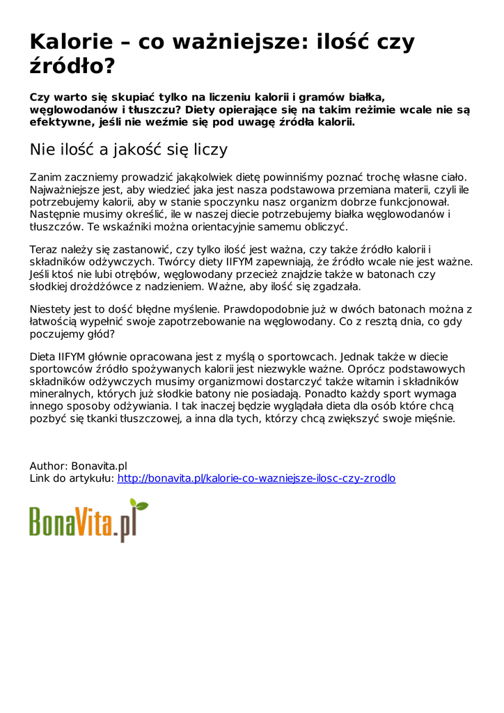 Kalorie – co ważniejsze: ilość czy źródło? Czy warto się skupiać tylko na liczeniu kalorii i gramów białka, węglowodanów i tłuszczu? Diety opierające się na takim reżimie wcale nie są efektywne, jeśli nie weźmie się pod uwagę źródła kalorii. Nie ilość a jakość się liczy Zanim zaczniemy prowadzić jakąkolwiek dietę powinniśmy poznać trochę własne ciało. Najważniejsze jest, aby wiedzieć jaka jest nasza podstawowa przemiana materii, czyli ile potrzebujemy kalorii, aby w stanie spoczynku nasz organizm dobrze funkcjonował. Następnie musimy określić, ile w naszej diecie potrzebujemy białka węglowodanów i tłuszczów. Te wskaźniki można orientacyjnie samemu obliczyć. Teraz należy się zastanowić, czy tylko ilość jest ważna, czy także źródło kalorii i składników odżywczych. Twórcy diety IIFYM zapewniają, że źródło wcale nie jest ważne. Jeśli ktoś nie lubi otrębów, węglowodany przecież znajdzie także w batonach czy słodkiej drożdżówce z nadzieniem. Ważne, aby ilość się zgadzała. Niestety jest to dość błędne myślenie. Prawdopodobnie już w dwóch batonach można z łatwością wypełnić swoje zapotrzebowanie na węglowodany. Co z resztą dnia, co gdy poczujemy głód? Dieta IIFYM głównie opracowana jest z myślą o sportowcach. Jednak także w diecie sportowców źródło spożywanych kalorii jest niezwykle ważne. Oprócz podstawowych składników odżywczych musimy organizmowi dostarczyć także witamin i składników mineralnych, których już słodkie batony nie posiadają. Ponadto każdy sport wymaga innego sposoby odżywiania. I tak inaczej będzie wyglądała dieta dla osób które chcą pozbyć się tkanki tłuszczowej, a inna dla tych, którzy chcą zwiększyć swoje mięśnie. Author: Bonavita.pl Link do artykułu: http://bonavita.pl/kalorie-co-wazniejsze-ilosc-czy-zrodlo
