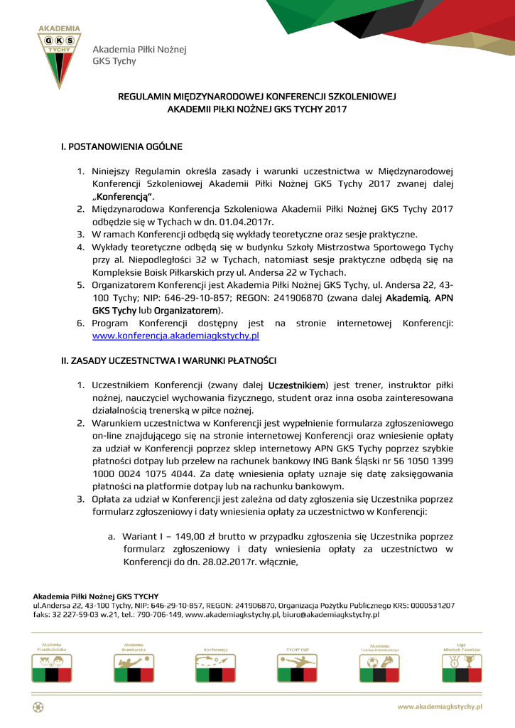 REGULAMIN MIĘDZYNARODOWEJ KONFERENCJI SZKOLENIOWEJ AKADEMII PIŁKI NOŻNEJ GKS TYCHY 2017 I. POSTANOWIENIA OGÓLNE 1. Niniejszy Regulamin określa zasady i warunki uczestnictwa w Międzynarodowej Konferencji Szkoleniowej Akademii Piłki Nożnej GKS Tychy 2017 zwanej dalej „Konferencją”. 2. Międzynarodowa Konferencja Szkoleniowa Akademii Piłki Nożnej GKS Tychy 2017 odbędzie się w Tychach w dn. 01.04.2017r. 3. W ramach Konferencji odbędą się wykłady teoretyczne oraz sesje praktyczne. 4. Wykłady teoretyczne odbędą się w budynku Szkoły Mistrzostwa Sportowego Tychy przy al. Niepodległości 32 w Tychach, natomiast sesje praktyczne odbędą się na Kompleksie Boisk Piłkarskich przy ul. Andersa 22 w Tychach. 5. Organizatorem Konferencji jest Akademia Piłki Nożnej GKS Tychy, ul. Andersa 22, 43100 Tychy; NIP: 646-29-10-857; REGON: 241906870 (zwana dalej Akademią, APN GKS Tychy lub Organizatorem). 6. Program Konferencji dostępny jest na stronie internetowej Konferencji: www.konferencja.akademiagkstychy.pl II. ZASADY UCZESTNCTWA I WARUNKI PŁATNOŚCI 1. Uczestnikiem Konferencji (zwany dalej Uczestnikiem) jest trener, instruktor piłki nożnej, nauczyciel wychowania fizycznego, student oraz inna osoba zainteresowana działalnością trenerską w piłce nożnej. 2. Warunkiem uczestnictwa w Konferencji jest wypełnienie formularza zgłoszeniowego on-line znajdującego się na stronie internetowej Konferencji oraz wniesienie opłaty za udział w Konferencji poprzez sklep internetowy APN GKS Tychy poprzez szybkie płatności dotpay lub przelew na rachunek bankowy ING Bank Śląski nr 56 1050 1399 1000 0024 1075 4044. Za datę wniesienia opłaty uznaje się datę zaksięgowania płatności na platformie dotpay lub na rachunku bankowym. 3. Opłata za udział w Konferencji jest zależna od daty zgłoszenia się Uczestnika poprzez formularz zgłoszeniowy i daty wniesienia opłaty za uczestnictwo w Konferencji: a. Wariant I – 149,00 zł brutto w przypadku zgłoszenia się Uczestnika poprzez formularz zgłoszeniowy i daty wniesienia opłaty za uczestnictwo w Konferencji do dn. 28.02.2017r. włącznie, b. Wariant II – 169,00 zł brutto w przypadku zgłoszenia się Uczestnika poprzez formularz zgłoszeniowy i daty wniesienia opłaty za uczestnictwo w Konferencji do dn. 19.03.2017r. włącznie, c. Wariant III – 199,00 zł brutto w przypadku zgłoszenia się Uczestnika poprzez formularz zgłoszeniowy i daty wniesienia opłaty za uczestnictwo w Konferencji do dn. 30.03.2017r. włącznie. 4. Każdy Uczestnik otrzyma certyfikat uczestnictwa w Konferencji. 5. Każdy Uczestnik otrzyma obiad w trakcie trwania Konferencji. 6. Wszelkie koszty i wydatki związane z pobytem lub zakwaterowaniem Uczestników Konferencji pokrywane są przez Uczestników we własnym zakresie. 7. W przypadku nie uiszczenia przez Uczestnika opłaty za udział w Konferencji Uczestnik nie ma prawa uczestnictwa w Konferencji. 8. W przypadku nieobecności Uczestnika na Konferencji, uiszczona przez Uczestnika opłata za udział w Konferencji nie podlega zwrotowi. 9. Organizator może wystawić fakturę za udział w Konferencji, wyłącznie w przypadku prośby Uczestnika złożonej podczas wypełniania formularza zgłoszeniowego. III. PRAWA ORGANIZATORA 1. Organizator zastrzega sobie prawo do zmiany prelegentów z przyczyn od Niego niezależnych. Uczestnikowi nie przysługuje w takim przypadku prawo do żądania jakiegokolwiek odszkodowania ze strony Organizatora. 2. Organizator zastrzega sobie prawo do zmiany terminu Konferencji z przyczyn od Niego niezależnych. 3. Organizator nie pokrywa żadnych dodatkowych kosztów lub wydatków, poniesionych przez Uczestnika w związku z uczestnictwem w Konferencji. IV. POSTANOWIENIA KOŃCOWE 1. W przypadku, gdy Konferencja nie odbędzie się z przyczyn całkowicie i wyłącznie zależnych od Organizatora, Organizator zwróci Uczestnikom opłatę za udział w Konferencji na wskazane przez nich numery rachunków bankowych. 2. W przypadku, gdy Konferencja nie odbędzie się z jakichkolwiek przyczyn niezależnych od Organizatora, Uczestnikowi nie przysługuje prawo do żądania zwrotu opłaty za udział w Konferencji, odszkodowania lub do zwrotu jakichkolwiek opłat związanych z uczestnictwem w Konferencji, bądź jakichkolwiek innych kosztów lub wydatków. 3. We wszelkich sprawach nieuregulowanych niniejszym Regulaminem zastosowanie mają przepisy Kodeksu cywilnego. 4. Wszelkie spory mogące wyniknąć z tytułu uczestnictwa w Konferencji będą rozstrzygane przez sąd właściwy dla siedziby Akademii Piłki Nożnej GKS Tychy. 5. Organizator konferencji zobowiązuje się, zgodnie z przepisami Ustawy o ochronie danych osobowych z dnia 29.081997 roku, nie udostępniać danych osobowych Uczestników nieuprawnionym osobom trzecim. 6. Wszelkie dane osobowe podane przez Uczestnika w procesie rejestracji mają charakter informacji poufnych i będą służyć APN GKS Tychy wyłącznie do realizacji celów związanych z organizacją Konferencji, jak również do ewentualnej komunikacji pomiędzy APN GKS Tychy a Uczestnikami Konferencji. 7. Organizator nie ponosi odpowiedzialności za jakiekolwiek rzeczy Uczestników, które mogą zostać zgubione, zniszczone lub skradzione podczas Konferencji. WIĘCEJ INFORMACJI NA STRONIE: www.konferencja.akademiagkstychy.pl