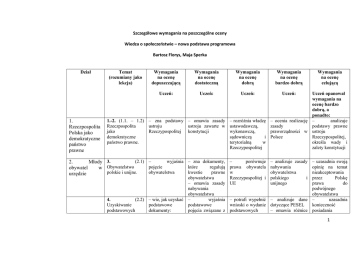 Szczegółowe wymagania na poszczególne oceny Wiedza o społeczeostwie – nowa podstawa programowa Bartosz Florys, Maja Sperka Dział 1. Rzeczpospolita Polska jako demokratyczne państwo prawne Temat (rozumiany jako lekcja) Wymagania na ocenę dopuszczającą Wymagania na ocenę dostateczną Wymagania na ocenę dobrą Wymagania na ocenę bardzo dobrą Uczeń: Uczeń: Uczeń: Uczeń: Wymagania na ocenę celującą Uczeń opanował wymagania na ocenę bardzo dobrą, a ponadto: 1.-2. (1.1. – 1.2) – zna podstawy – omawia zasady – rozróżnia władzę – ocenia realizację – analizuje Rzeczpospolita ustroju ustroju zawarte w ustawodawczą, zasady podstawy prawne jako Rzeczypospolitej konstytucji wykonawczą, praworządności w ustroju demokratyczne sądowniczą i Polsce Rzeczypospolitej, państwo prawne. terytorialną w określa wady i Rzeczypospolitej zalety konstytucji (2.1) – wyjaśnia – zna dokumenty, – porównuje – analizuje zasady – uzasadnia swoją 2. Młody 3. Obywatelstwo pojęcie które regulują prawa obywatela nabywania opinię na temat obywatel w polskie i unijne. obywatelstwa kwestie prawne w obywatelstwa nieakceptowania urzędzie obywatelstwa – omawia zasady nabywania obywatelstwa 4. (2.2) – wie, jak uzyskać – wyjaśnia Uzyskiwanie podstawowe podstawowe podstawowych dokumenty: pojęcia związane z i przez Polskę prawa do podwójnego obywatelstwa – potrafi wypełnić – analizuje dane – uzasadnia wnioski o wydanie dotyczące PESEL konieczność podstawowych – omawia różnice posiadania Rzeczypospolitej i polskiego UE unijnego 1 dokumentów. dowód osobisty, tematem: paszport, prawo obowiązek jazdy meldunkowy, dowód rejestracyjny, paszport, faktura VAT 5. (2.3) Udział – zna formy – omawia czynne i obywatela w udziału obywateli bierne prawo wyborach i w życiu wyborcze referendach. publicznym dokumentów przy rejestracji świadectwa różnych pojazdów homologacji dla danego typu samochodu – porównuje wybory na Prezydenta RP, do Parlamentu, samorządów terytorialnych i Parlamentu Europejskiego – potrafi przedstawić system wyborczy w Rzeczypospolitej 6. (2.4) – wie, co to jest – omawia prawo – rozróżnia Konstytucyjne informacja obywatela do sposoby prawo obywatela publiczna informacji udostępniania do informacji. publicznej informacji publicznej 7. (2.5) Procedury – zna dokumenty, – potrafi wypełnić – rozróżnia formy odwoławcze od które regulują podanie i złożyć odwoławcze od decyzji urzędów. procedury zażalenie na postępowania odwoławcze decyzję publiczną administracyjnego; postępowania omawia proces administracyjnego odwoławczy w Rzeczypospolitej 3. Prawo i sądy – analizuje przyczyny niskiej frekwencji obywateli w wyborach i referendach – analizuje powody – ocenia problem odmowy podania jawności życia informacji publicznego publicznej – potrafi uzasadnić potrzeby zastosowania postępowania odwoławczego – dokonuje oceny problemów występujących w środowisku, w sprawie których można by skierować petycje do władz lokalnych 8. (3.1) Pojęcie – zna podstawowe – rozróżnia rodzaje – wskazuje – ocenia kondycję – potrafi prawa i norm pojęcia związane norm prawnych; poszczególne naszego prawa; interpretować prawnych. z prawem omawia funkcje elementy normy wyjaśnia, jakie zapisy prawa prawnej: hipotezę, prawo jest „dobre” przykładów norm 2 dyspozycję i sankcję 9. (3.2) – wymienia – wyjaśnia – omawia Podstawowe konstytucyjne znaczenie zasady najważniejsze zasady prawa i zasady domniemania zasady procesowe funkcjonowania funkcjonowania niewinności gwarantowane w sądów. sądów konstytucji prawnych – potrafi wyjaśnić znaczenie udziału obywateli w sprawowaniu wymiaru sprawiedliwości – analizuje pracę i funkcjonowanie polskiego wymiaru sprawiedliwości; sądownictwo polskie porównuje z sądownictwem w prawie anglosaskim – uzasadnia, jakie znaczenie dla funkcjonowania państwa ma hierarchia aktów prawnych – potrafi interpretować wybrane przepisy kodeksu karnego 10. (3.3) Źródła i – zna źródła – omawia – rozróżnia gałęzie gałęzie prawa. prawa hierarchię aktów i dziedziny prawa obowiązującego prawnych w Polsce w Polsce – analizuje poszczególne działy prawa międzynarodowego i europejskiego 11. (3.4) Wybrane – wyjaśnia zagadnienia prawa podstawowe polskiego. pojęcia: przestępstwo, prawo karne, prawo cywilne, pozew itp. – omawia poszczególne dziedziny prawa; wie, czym się zajmują – potrafi sformułować dowolny pozew do sądu i uzasadnić go – potrafi napisać akt oskarżenia dotyczący naruszenia dowolnego artykułu prawa karnego 12. (3.5) – wymienia Uczestnicy procesu uczestników sądowego. procesu karnego i cywilnego – wyjaśnia poszczególne pojęcia związane z procesem karnym i cywilnym – rozróżnia kolory żabotu, lamówek i mankietów sędziów, prokuratorów, obrońcy i radcy – uzasadnia rolę – analizuje czynnika osobowe źródła społecznego w dowodowe i sądzie instytucję świadka koronnego 13. (3.6) Przebieg – zna etapy – omawia główne – sporządza – ocenia problem – uzasadnia 3 postępowania sądowego. procesu karnego; wyjaśnia podstawowe pojęcia prawa, jakie zawiadomienie przysługują popełnieniu ofierze, sprawcy i przestępstwa świadkowi przestępstwa o obowiązku powiadomienia o popełnieniu przestępstwa ściganego z urzędu znaczenie mediacji w procesie karnym i cywilnym 14. Prawo i sądy − lekcja powtórzeniowa. 15. Prawo regulatorem życia społecznego – lekcja sprawdzająca. 16. (4.1) Organy – wymienia – omawia zadania – określa – przedstawia – ocenia 4. podstawowe przykłady działalność Bezpieczeństwo odpowiedzialne za instytucje, które instytucji porządek bezpieczeństwo wewnętrzne państwa. i realizują zadania w zakresie bezpieczeństwa wewnętrznego w Rzeczypospolitej odpowiedzialnych za porządek i bezpieczeństwo wewn
