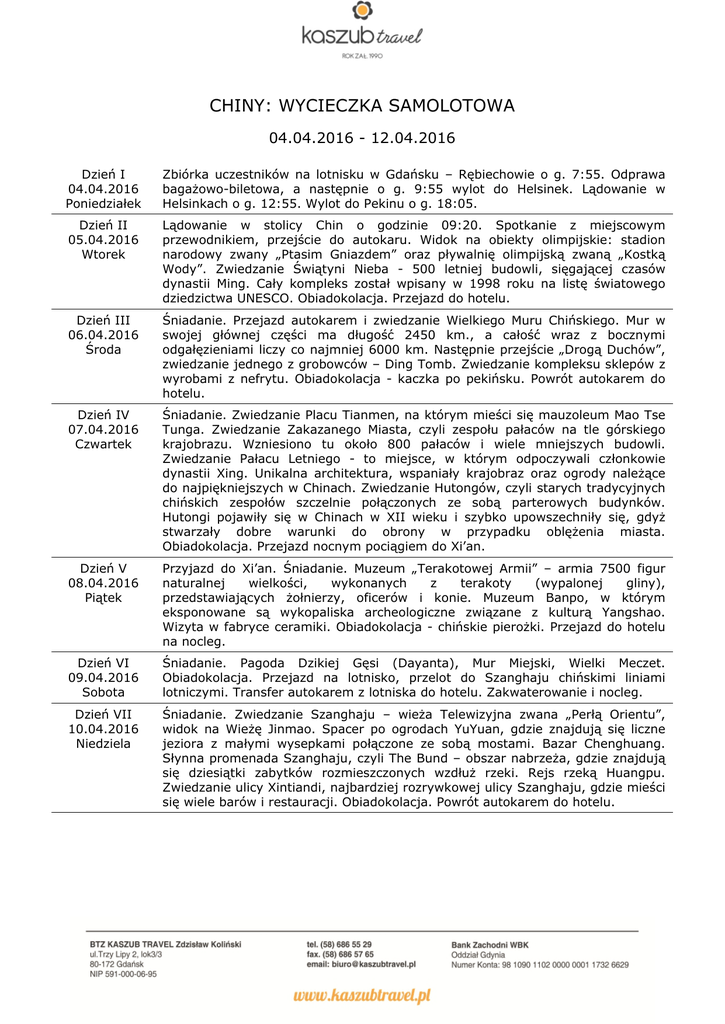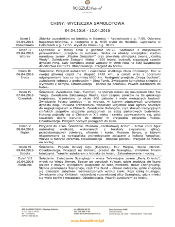 CHINY: WYCIECZKA SAMOLOTOWA 04.04.2016 - 12.04.2016 Dzień I 04.04.2016 Poniedziałek Zbiórka uczestników na lotnisku w Gdańsku – Rębiechowie o g. 7:55. Odprawa bagażowo-biletowa, a następnie o g. 9:55 wylot do Helsinek. Lądowanie w Helsinkach o g. 12:55. Wylot do Pekinu o g. 18:05. Dzień II 05.04.2016 Wtorek Lądowanie w stolicy Chin o godzinie 09:20. Spotkanie z miejscowym przewodnikiem, przejście do autokaru. Widok na obiekty olimpijskie: stadion narodowy zwany „Ptasim Gniazdem” oraz pływalnię olimpijską zwaną „Kostką Wody”. Zwiedzanie Świątyni Nieba - 500 letniej budowli, sięgającej czasów dynastii Ming. Cały kompleks został wpisany w 1998 roku na listę światowego dziedzictwa UNESCO. Obiadokolacja. Przejazd do hotelu. Dzień III 06.04.2016 Środa Śniadanie. Przejazd autokarem i zwiedzanie Wielkiego Muru Chińskiego. Mur w swojej głównej części ma długość 2450 km., a całość wraz z bocznymi odgałęzieniami liczy co najmniej 6000 km. Następnie przejście „Drogą Duchów”, zwiedzanie jednego z grobowców – Ding Tomb. Zwiedzanie kompleksu sklepów z wyrobami z nefrytu. Obiadokolacja - kaczka po pekińsku. Powrót autokarem do hotelu. Dzień IV 07.04.2016 Czwartek Śniadanie. Zwiedzanie Placu Tianmen, na którym mieści się mauzoleum Mao Tse Tunga. Zwiedzanie Zakazanego Miasta, czyli zespołu pałaców na tle górskiego krajobrazu. Wzniesiono tu około 800 pałaców i wiele mniejszych budowli. Zwiedzanie Pałacu Letniego - to miejsce, w którym odpoczywali członkowie dynastii Xing. Unikalna architektura, wspaniały krajobraz oraz ogrody należące do najpiękniejszych w Chinach. Zwiedzanie Hutongów, czyli starych tradycyjnych chińskich zespołów szczelnie połączonych ze sobą parterowych budynków. Hutongi pojawiły się w Chinach w XII wieku i szybko upowszechniły się, gdyż stwarzały dobre warunki do obrony w przypadku oblężenia miasta. Obiadokolacja. Przejazd nocnym pociągiem do Xi’an. Dzień V 08.04.2016 Piątek Przyjazd do Xi’an. Śniadanie. Muzeum „Terakotowej Armii” – armia 7500 figur naturalnej wielkości, wykonanych z terakoty (wypalonej gliny), przedstawiających żołnierzy, oficerów i konie. Muzeum Banpo, w którym eksponowane są wykopaliska archeologiczne związane z kulturą Yangshao. Wizyta w fabryce ceramiki. Obiadokolacja - chińskie pierożki. Przejazd do hotelu na nocleg. Dzień VI 09.04.2016 Sobota Śniadanie. Pagoda Dzikiej Gęsi (Dayanta), Mur Miejski, Wielki Meczet. Obiadokolacja. Przejazd na lotnisko, przelot do Szanghaju chińskimi liniami lotniczymi. Transfer autokarem z lotniska do hotelu. Zakwaterowanie i nocleg. Dzień VII 10.04.2016 Niedziela Śniadanie. Zwiedzanie Szanghaju – wieża Telewizyjna zwana „Perłą Orientu”, widok na Wieżę Jinmao. Spacer po ogrodach YuYuan, gdzie znajdują się liczne jeziora z małymi wysepkami połączone ze sobą mostami. Bazar Chenghuang. Słynna promenada Szanghaju, czyli The Bund – obszar nabrzeża, gdzie znajdują się dziesiątki zabytków rozmieszczonych wzdłuż rzeki. Rejs rzeką Huangpu. Zwiedzanie ulicy Xintiandi, najbardziej rozrywkowej ulicy Szanghaju, gdzie mieści się wiele barów i restauracji. Obiadokolacja. Powrót autokarem do hotelu. Dzień VIII 11.04.2016 Poniedziałek Śniadanie. Zwiedzanie Muzeum Szanghajskiego oraz Świątyni Nefrytowego Buddy. Jest to jedna z niewielu buddyjskich świątyń w Szanghaju. W świątyni znajduje się wysoki na 2 metry posąg Buddy bogato zdobiony złotem i klejnotami. Wizyta w sklepie z wyrobami z jedwabiu – Jiangnan. Tianzifang – ośrodek, gdzie można zobaczyć, jak Szanghaj wyglądał kiedyś: wąskie urokliwe uliczki, sklepy, restauracje, herbaciarnie a wszystko mieszczące się w niesamowitych, starych chińskich budynkach. Zwiedzanie i zakupy na słynnej ulicy Nankińskiej. Powrót do hotelu. Obiadokolacja w stylu mongolskim. Dzień IX 12.04.2016 Wtorek Śniadanie. Transfer autokarowy na lotnisko. Odprawa bagażowo-biletowa. Wylot do Helsinek o g. 9:20.Lądowanie w Helsinkach o g. 14:35. Wylot do Gdańska o g. 16:45. Lądowanie w Gdańsku o g. 17:45. Zakończenie wyjazdu. CENA: 7.900,00 zł + wiza chińska ŚWIADCZENIA: • przelot samolotem na trasie: Gdańsk-Helsinki-Pekin, Szanghaj – Helsinki - Gdańsk • transport autokarem klimatyzowanym • bilety wstępów do zwiedzanych obiektów • noclegi w hotelach **** wg norm lokalnych, pokoje 2 - osobowe z WC i łazienką • śniadania (szwedzki stół) • obiadokolacje (poza hotelem, serwowane) • opieka pilota i przewodnika • ubezpieczenie NW i Kl i bagażu w Signal Iduna - wariant podstawowy (nie obejmuje chorób przewlekłych • bilety na pociąg na trasie: Pekin-Xi’an • przelot samolotem na trasie: Xi’an-Szanghaj CENA NIE ZAWIERA: • cena nie zawiera kosztu wizy chińskiej UWAGI: • zastrzega się możliwość zmiany kolejności zwiedzanych obiektów • organizator nie odpowiada za nieprzewidziane zmiany niezależne od niego • cena nie obejmuje wizy, napiwków dla kierowcy i przewodników lokalnych (standardy lokalne - 4 $/dzień • należy posiadać ważny paszport – minimum 6 miesięcy od daty powrotu! • cena uzależniona od kursu dolara