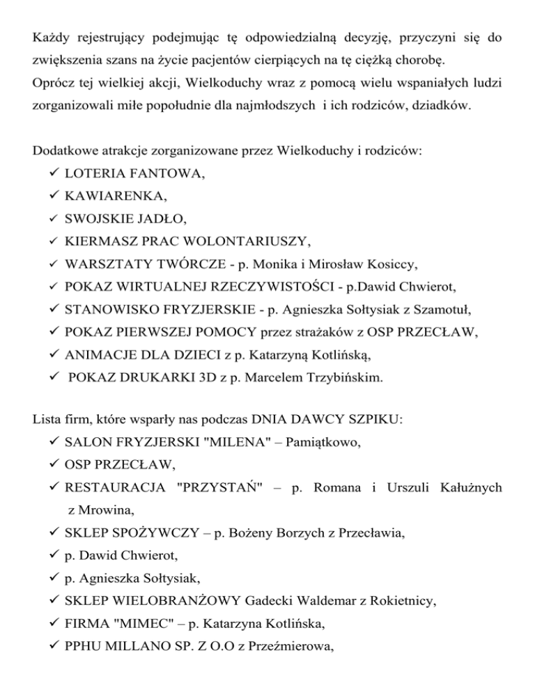 Każdy rejestrujący podejmując tę odpowiedzialną decyzję, przyczyni się do zwiększenia szans na życie pacjentów cierpiących na tę ciężką chorobę. Oprócz tej wielkiej akcji, Wielkoduchy wraz z pomocą wielu wspaniałych ludzi zorganizowali miłe popołudnie dla najmłodszych i ich rodziców, dziadków. Dodatkowe atrakcje zorganizowane przez Wielkoduchy i rodziców: LOTERIA FANTOWA, KAWIARENKA, SWOJSKIE JADŁO, KIERMASZ PRAC WOLONTARIUSZY, WARSZTATY TWÓRCZE - p. Monika i Mirosław Kosiccy, POKAZ WIRTUALNEJ RZECZYWISTOŚCI - p.Dawid Chwierot, STANOWISKO FRYZJERSKIE - p. Agnieszka Sołtysiak z Szamotuł, POKAZ PIERWSZEJ POMOCY przez strażaków z OSP PRZECŁAW, ANIMACJE DLA DZIECI z p. Katarzyną Kotlińską, POKAZ DRUKARKI 3D z p. Marcelem Trzybińskim. Lista firm, które wsparły nas podczas DNIA DAWCY SZPIKU: SALON FRYZJERSKI "MILENA" – Pamiątkowo, OSP PRZECŁAW, RESTAURACJA "PRZYSTAŃ" – p. Romana i Urszuli Kałużnych z Mrowina, SKLEP SPOŻYWCZY – p. Bożeny Borzych z Przecławia, p. Dawid Chwierot, p. Agnieszka Sołtysiak, SKLEP WIELOBRANŻOWY Gadecki Waldemar z Rokietnicy, FIRMA "MIMEC" – p. Katarzyna Kotlińska, PPHU MILLANO SP. Z O.O z Przeźmierowa, „RADOSNA TWÓRCZOŚĆ” – p. Monika i Mirosław Kosiccy, "ELL-STUDIO" GABINET KOSMETYCZNY – p. Elżbieta Piszczyńska z Pamiątkowa, p. Marcel Trzybiński z Mrowina, SKLEP SPOŻYWCZO-PRZEMYSŁOWY p. Kozłowskich z Pamiątkowa, p. Walkowiak z Przecławia. Podsumowując akcję "ODDAJ Z KOŚCI GARŚĆ MIŁOŚCI" informujemy, że udało się nam zarejestrować aż 37 potencjalnych dawców szpiku. Wszystkim, którzy zdecydowali się być dawcami serdecznie dziękujemy w imieniu ludzi chorych, którzy codziennie mają nadzieję na odnalezienie swojego "bliźniaka genetycznego". Jako opiekunki Szkolnego Koła Wolontariatu serdecznie dziękujemy wszystkim wolontariuszom – Wielkoduchom za zaangazowanie i gotowość do niesienia pomocy. Jesteście wielcy! Kochanym mamom, tatusiom, którzy wspierali nas w realizacji planu akcji, że zawsze możemy na Was liczyć! Wszystkim sponsorom i przyjaciołom, którzy uatrakcyjnili swoją pomocą ten dzień. KAŻDEMU KTO WSPIERAŁ NAS RÓWNIEŻ - DUCHOWO!