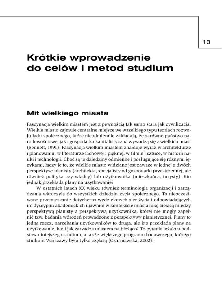 13 Krótkie wprowadzenie do celów i metod studium Mit wielkiego miasta Fascynacja wielkim miastem jest z pewnością tak samo stara jak cywilizacja. Wielkie miasto zajmuje centralne miejsce we wszelkiego typu teoriach rozwoju ładu społecznego, które nieodmiennie zakładają, że zarówno państwo narodowościowe, jak i gospodarka kapitalistyczna wywodzą się z wielkich miast (Sennett, 1991). Fascynacja wielkim miastem znajduje wyraz w architekturze i planowaniu, w literaturze fachowej i pięknej, w filmie i sztuce, w historii nauki i technologii. Choć są to dziedziny odmienne i posługujące się różnymi językami, łączy je to, że wielkie miasto widziane jest zawsze w jednej z dwóch perspektyw: planisty (architekta, specjalisty od gospodarki przestrzennej, ale również polityka czy władcy) lub użytkownika (mieszkańca, turysty). Kto jednak przekłada plany na użytkowanie? W ostatnich latach XX wieku również terminologia organizacji i zarządzania wkroczyła do wszystkich dziedzin życia społecznego. To nieoczekiwane przemieszanie dotychczas wydzielonych sfer życia i odpowiadających im dyscyplin akademickich ujawniło w kontekście miasta lukę ziejącą między perspektywą planisty a perspektywą użytkownika, której nie mogły zapełnić tzw. badania wdrożeń prowadzone z perspektywy planistycznej. Plany to jedna rzecz, narzekania użytkowników to druga, ale kto przekłada plany na użytkowanie, kto i jak zarządza miastem na bieżąco? To pytanie leżało u podstaw niniejszego studium, a także większego programu badawczego, którego studium Warszawy było tylko częścią (Czarniawska, 2002). Zmiana kadru Teoria na miarê czasów 14 Istnieją co najmniej dwa powody, aby starać się zrozumieć i opisać, jak w praktyce przebiega zarządzanie wielkim miastem. Pierwszy związany jest z niezadowalającą sytuacją w samej dyscyplinie teorii zarządzania, w której stało się oczywiste, że tradycyjna, modernistyczna teoria zarządzania z lat 60., opierająca się na uproszczeniach i mechanistycznych metaforach (Morgan, 1986), jest bezużyteczna jako narzędzie ułatwiające zrozumienie złożoności współczesnych organizacji gospodarczych. Obszarem działania współczesnych korporacji jest gospodarka globalna; rynek pieniądza co chwilę wstrząsany jest wydarzeniami, których nikt nie umie ani przewidzieć, ani wytłumaczyć. Jak stwierdził Robert Solow, laureat Nagrody Banku Szwecji im. Alfreda Nobla w dziedzinie ekonomii, jedynym prawem ekonomicznym jest to, że liczba sprzedaży musi równać się liczbie zakupów (Lewontin, 1995). Teoria chaosu (Prigogine i Stengers, 1983) znajduje więcej zastosowań w wyjaśnianiu zjawisk społecznych i gospodarczych niż teoria systemów. Nowe formy organizacyjne mnożą się i komplikują, a wiele z nich wypróbowywanych jest w tym najstarszym laboratorium naszej cywilizacji, jakim jest wielkie miasto. Chociaż przemysł wyniósł się z nich, zarówno centralne zarządy wielkich korporacji, jak i wielkie banki mają swoje siedziby w wielkich aglomeracjach. Tam się głównie rozwija produkcja usług – we współczesnym społeczeństwie dużo ważniejsza niż produkcja przemysłowa. I jeśli nawet jakaś nowa forma organizacji społecznej zrodzi się gdzie indziej, wielkie miasto przechwyci ją i sprawdzi w większej skali. W tej sytuacji badanie zarządzania wielkim miastem jest niezwykle obiecujące. W czasach, kiedy podział na sfery administracji publicznej i produkcji prywatnej rozmywa się na naszych oczach, specjaliści od zarządzania wielkim miastem, nawet jeśli sami nie wytworzą nowych twórczych rozwiązań w dziedzinie organizacji i zarządzania, będą zmuszeni się na nie natknąć. Drugi powód zainteresowania zarządzaniem wielkim miastem związany jest z samym tego zjawiskiem. Pomijając chwilowe fluktuacje demograficzne, wielkie miasta wykazują stałą tendencję wzrostu. Może to znaczyć, że znikną one, rozpłyną się w „obszarach metropolitalnych”, jak ma to częściowo miejsce w Stanach Zjednoczonych. Inna możliwość to miasta-potwory jak te pokazane w futurystycznych utworach, takich jak w filmach Metropolis Fritza Langa i Blade Runners Ridleya Scotta, powieści Virtual Light Williama Gibsona i eseju The City of Glass Mike’a Davisa. Opinie na temat przyszłości wielkiego miasta różnią się, istnieje jednak zgoda co do tego, że obecna wielkość i stopień ich złożoności przekracza możliwość nadzoru i kontroli. W 2013 roku Londyn liczył sobie 8 174 tys. mieszkańców, a to przecież nic w porównaniu z Sa ~o Paulo czy New Delhi. Niemniej jednak w każdym mieście istnieje cała armia ludzi, która zajmuje Krótkie wprowadzenie... się ni mniej, ni więcej tylko zarządzaniem wielkim miastem. Co robią, kiedy tak zarządzają? Jak już wspomniałam, wiedza na ten temat jest wysoce niezadowalająca, co nie znaczy, że jej nie ma. Z jednej strony istnieje teoria zarządzania jako sterowania, oparta na modernistycznym założeniu o uniwersalizmie, w której nie znajduje się powodu, aby różnicować odmienne obiekty zarządcze. Z drugiej strony mamy specjalistyczną wiedzę fachową dotyczącą takich dziedzin jak transport miejski, kierowanie ruchem, gospodarka wodno-ściekowa czy oczyszczanie miast. Oprócz wiedzy technicznej istnieje też bardziej złożona, ale i bardziej rozproszona wiedza dotycząca zjawisk społecznych uwikłanych w działalność wielkiego miasta. Trzeba zatem szukać możliwości budowania połączeń i skojarzeń między tymi różnymi źródłami wiedzy. Czy jest to w ogóle możliwe? Rosnąca specjalizacja i zróżnicowanie dziedzin wiedzy doprowadziły do sytuacji paradoksalnej. Przez pewien czas wydawało się nieuniknione, że renesansowa koncepcja człowieka uniwersalnego musi być posypana naftaliną i odłożona do kufra historii nauki. Modernistyczny intelektualista nie był w stanie ogarnąć całości życia intelektualnego i z re