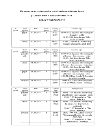 Harmonogram szczegółowy godzin pracy Lokalnego Animatora Sportu p. Łukasza Baran w miesiącu kwietniu 2016 r. ORLIK W SKRZYSZOWIE I tydzień II tydzień III tydzień Dzień tygodnia Data liczba godzin Godziny zajęć Tematyka zajęć piątek 01.04.2016 5 16:0021:00 sobota 02.04.2016 7 09:0016:00 16:00-18:00 Zajęcia z piłki nożnej dla chłopców - orliki 18:00-21:00 Koszykówka/ Piłka ręczna rekreacja WYJAZD/TURNIEJ Piłki nożnej chłopców dla rocznika 2005-2006 Dzień tygodnia Data liczba godzin Godziny zajęć Tematyka zajęć poniedzi ałek 04.04.2016 3 16:0019:00 środa 06.04.2016 3 16:0019:00 piątek 08.04.2016 5 16:0021:00 niedziela 10.04.2016 6 14:0020:00 16:00-18:00 Zajęcia z piłki nożnej dla chłopców i dziewczynek – orliki 18:00-19:00 Koszykówka/ Piłka ręczna - Rekreacja 16:00-18:00 Zajęcia z piłki nożnej dla chłopców i dziewczynek – orliki/żaki 18:00-19:00 Koszykówka/ Piłka ręczna - Rekreacja 16:00-18:00 Zajęcia z piłki nożnej dla chłopców i dziewczynek - orliki 18:00-21:00 Koszykówka/ Piłka nożna dorośli - Rekreacja 14:00-16:00 Gry i zabawy rodzinne 16:00-20:00 Piłka nożna - Rekreacja Dzień tygodnia Data liczba godzin Godziny zajęć Tematyka zajęć poniedzi ałek 11.04.2016 3 16:0019:00 środa 13.04.2016 3 16:0019:00 czwartek 14.04.2016 5 16:0021:00 16:00-18:00 Zajęcia z piłki nożnej dla chłopców i dziewczynek – orliki 18:00-19:00 Koszykówka/ Piłka ręczna - Rekreacja 16:00-18:00 Zajęcia z piłki nożnej dla chłopców i dziewczynek – orliki/żaki 18:00-19:00 Koszykówka/ Piłka ręczna - Rekreacja 16:00-19:00 WYJAZD/TURNIEJ Piłki nożnej chłopców dla rocznika 2005-2006 19:00-21:00 Koszykówka/ Piłka nożna dorośli - Rekreacja