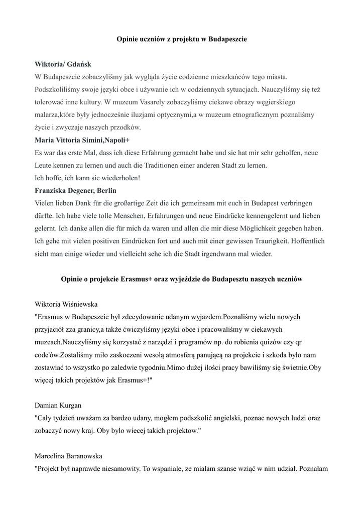 Opinie uczniów z projektu w Budapeszcie Wiktoria/ Gdańsk W Budapeszcie zobaczyliśmy jak wygląda życie codzienne mieszkańców tego miasta. Podszkoliliśmy swoje języki obce i używanie ich w codziennych sytuacjach. Nauczyliśmy się też tolerować inne kultury. W muzeum Vasarely zobaczyliśmy ciekawe obrazy węgierskiego malarza,które były jednocześnie iluzjami optycznymi,a w muzeum etnograficznym poznaliśmy życie i zwyczaje naszych przodków. Maria Vittoria Simini,Napoli+ Es war das erste Mal, dass ich diese Erfahrung gemacht habe und sie hat mir sehr geholfen, neue Leute kennen zu lernen und auch die Traditionen einer anderen Stadt zu lernen. Ich hoffe, ich kann sie wiederholen! Franziska Degener, Berlin Vielen lieben Dank für die großartige Zeit die ich gemeinsam mit euch in Budapest verbringen dürfte. Ich habe viele tolle Menschen, Erfahrungen und neue Eindrücke kennengelernt und lieben gelernt. Ich danke allen die für mich da waren und allen die mir diese Möglichkeit gegeben haben. Ich gehe mit vielen positiven Eindrücken fort und auch mit einer gewissen Traurigkeit. Hoffentlich sieht man einige wieder und vielleicht sehe ich die Stadt irgendwann mal wieder. Opinie o projekcie Erasmus+ oraz wyjeździe do Budapesztu naszych uczniów Wiktoria Wiśniewska "Erasmus w Budapeszcie był zdecydowanie udanym wyjazdem.Poznaliśmy wielu nowych przyjaciół zza granicy,a także ćwiczyliśmy języki obce i pracowaliśmy w ciekawych muzeach.Nauczyliśmy się korzystać z narzędzi i programów np. do robienia quizów czy qr code'ów.Zostaliśmy miło zaskoczeni wesołą atmosferą panującą na projekcie i szkoda było nam zostawiać to wszystko po zaledwie tygodniu.Mimo dużej ilości pracy bawiliśmy się świetnie.Oby więcej takich projektów jak Erasmus+!" Damian Kurgan "Cały tydzień uważam za bardzo udany, mogłem podszkolić angielski, poznac nowych ludzi oraz zobaczyć nowy kraj. Oby bylo wiecej takich projektow." Marcelina Baranowska "Projekt był naprawde niesamowity. To wspaniale, ze mialam szanse wziąć w nim udział. Poznałam wielu nowych ludzi i podszkolilam swoj angielski. Zobaczylam jak wyglada zycie w obcej kulturze. Gdybym mogla z chęcia pojechałabym jeszcze raz, był to naprawde udany wyjazd." Adrianna Andryszak "Zawsze będę miło wspominać ten wyjazd. Mam również nadzieję, że kiedyś jeszcze będziemy mogli się spotkać w tej samej grupie.A sam projekt był fantastycznie zorganizowany. Wyjścia do muzeum, zwiedzanie miasta...wszystko to było super zaplanowane. Węgierscy chłopcy zorganizowali nam nawet dzień kobiet! To była dopiero niespodzianka. Na wyjeździe również udało mi się poznać nasze panie nauczycielki z innej strony. Nigdy nie podejrzewałam, że tak wymagający nauczyciele mogą być tak fantastycznymi osobami poza szkołą." Aleksandra Kaftan "Cały wyjazd do Budapesztu był niesamowity. Sam projekt Erasmus+ bardzo dobrze zorganizowany. Tydzień z uczniami i nauczycielami naszej szkoły, za granicą, spędziłam w bardzo przyjaznej atmosferze. Dzięki projektowi poznałam wielu nowych przyjaciół, przełamałam barierę językową oraz nauczyłąm się posługiwać wieloma narzędziami interaktywnymi do pracy w grupach. Bardzo podobały mi się prace w muzeach, jak i w szkole, nie mieliśmy czasu na nudę. Byl to bardzo pracowity tydzień, ale będę go bardzo miło wspominać. Więzi, pomiędzy uczniami i nauczycielami naszego gimnazjum, umocniły się. Zachęcam wszystkich do brania udziału w takich projektach jak Erasmus+, wynosi się z nich same dobre rzeczy."