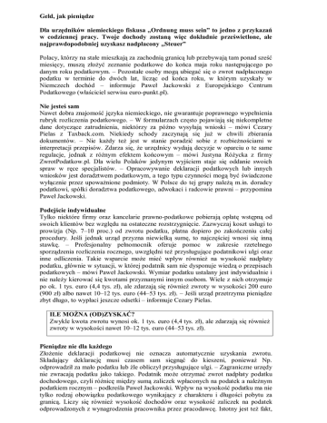 Geld, jak pieniądze Dla urzędników niemieckiego fiskusa „Ordnung muss sein” to jedno z przykazań w codziennej pracy. Twoje dochody zostaną więc dokładnie prześwietlone, ale najprawdopodobniej uzyskasz nadpłacony „Steuer” Polacy, którzy na stałe mieszkają za zachodnią granicą lub przebywają tam ponad sześć miesięcy, muszą złożyć zeznanie podatkowe do końca maja roku następującego po danym roku podatkowym. – Pozostałe osoby mogą ubiegać się o zwrot nadpłaconego podatku w terminie do dwóch lat, licząc od końca roku, w którym uzyskały w Niemczech dochód – informuje Paweł Jackowski z Europejskiego Centrum Podatkowego (właściciel serwisu euro-punkt.pl). Nie jesteś sam Nawet dobra znajomość języka niemieckiego, nie gwarantuje poprawnego wypełnienia rubryk rozliczenia podatkowego. – W formularzach często pojawiają się niekompletne dane dotyczące zatrudnienia, niektórzy za późno wysyłają wnioski – mówi Cezary Pielas z Taxback.com. Niekiedy schody zaczynają się już w chwili zbierania dokumentów. – Nie każdy też jest w stanie poradzić sobie z rozbieżnościami w interpretacji przepisów. Zdarza się, że urzędnicy wydają decyzje w oparciu o te same regulacje, jednak z różnym efektem końcowym – mówi Justyna Różycka z firmy ZwrotPodatkow.pl. Dla wielu Polaków jedynym wyjściem staje się oddanie swoich spraw w ręce specjalistów. – Opracowywanie deklaracji podatkowych lub innych wniosków jest doradztwem podatkowym, a tego typu czynności mogą być świadczone wyłącznie przez upoważnione podmioty. W Polsce do tej grupy należą m.in. doradcy podatkowi, spółki doradztwa podatkowego, adwokaci i radcowie prawni – przypomina Paweł Jackowski. Podejście indywidualne Tylko niektóre firmy oraz kancelarie prawno-podatkowe pobierają opłatę wstępną od swoich klientów bez względu na ostateczne rozstrzygnięcie. Zazwyczaj koszt usługi to prowizja (Np. 7–10 proc.) od zwrotu podatku, płatna dopiero po zakończeniu całej procedury. Jeśli jednak urząd przyzna niewielką sumę, to najczęściej wnosi się inną stawkę. – Profesjonalny pełnomocnik oferuje pomoc w zakresie rzetelnego sporządzenia rozliczenia rocznego, uwzględni też przysługujące podatnikowi ulgi oraz inne odliczenia. Takie wsparcie może mieć wpływ również na wysokość nadpłaty podatku, głównie w sytuacji, w której podatnik sam nie dysponuje wiedzą o przepisach podatkowych – mówi Paweł Jackowski. Wymiar podatku ustalany jest indywidualnie i nie należy kierować się kwotami przyznanymi innym osobom. Wiele z nich otrzymuje po ok. 1 tys. euro (4,4 tys. zł), ale zdarzają się również zwroty w wysokości 200 euro (900 zł) albo nawet 10–12 tys. euro (44–53 tys. zł). – Jeśli urząd przetrzyma pieniądze zbyt długo, to wypłaci jeszcze odsetki – informuje Cezary Pielas. ILE MOŻNA (OD)ZYSKAĆ? Zwykle kwota zwrotu wynosi ok. 1 tys. euro (4,4 tys. zł), ale zdarzają się również zwroty w wysokości nawet 10–12 tys. euro (44–53 tys. zł). Pieniądze nie dla każdego Złożenie deklaracji podatkowej nie oznacza automatycznie uzyskania zwrotu. Składający deklarację musi czasem sam sięgnąć do kieszeni, ponieważ Np. odprowadził za mało podatku lub źle obliczył przysługujące ulgi. – Zagraniczne urzędy nie zwracają podatku jako takiego. Podatnik może otrzymać zwrot nadpłaty podatku dochodowego, czyli różnicę między sumą zaliczek wpłaconych na podatek a należnym podatkiem rocznym – podkreśla Paweł Jackowski. Wpływ na wysokość podatku ma nie tylko rodzaj obowiązku podatkowego wynikający z charakteru i długości pobytu za granicą. Liczy się również wysokość dochodów oraz wysokość zaliczek na podatek odprowadzonych z wynagrodzenia pracownika przez pracodawcę. Istotny jest też fakt, czy dana osoba składa dokumenty wspólnie z żoną/mężem. – Rozliczenie małżeńskie, ulga na dziecko (tzw. Kinderfreibetrag) oraz odliczenie kosztów dojazdów z Polski do Niemiec to obecnie najpopularniejsze zapisy umożliwiające uzyskanie maksymalnej wysokości zwrotu podatku – mówi Justyna Różycka. Droga do mety Standardowo do przygotowania rozliczenia podatkowego potrzebne są druki Lohnsteuerkarte (karta podatkowa) lub Lohnsteuerbescheinigung (zaświadczenie podatkowe) od każdego z pracodawców. Niekiedy przełożeni „zapominają” o swoich obowiązkach na koniec roku podatkowego. Wówczas należy im o sobie przypomnieć albo skorzystać ze wsparcia kancelarii prawno-podatkowej, która wystąpi o wymagany dokument. Gdy dana osoba nie była zatrudniona przez cały rok podatkowy w Niemczech, powinna przygotować zaświadczenie o dochodach uzyskanych w Polsce. – Jeśli w zeznaniu podatkowym zabraknie jakichś załączników, niemiecki urząd poinformuje o tym podatnika. Nie dojdzie do takiej sytuacji, jeśli wybierzemy pomoc agenta podatkowego, który dopilnuje, by aplikacja była kompletna – mówi Cezary Pielas. Oddając sprawę w ręce specjalistów, nie należy spodziewać się zwrotu w ciągu kilku dni. – Czas oczekiwania na wydanie decyzji we wszystkich urzędach oprócz tych dla obcokrajowców (Cottbus i Oranienburg) wynosi ok. trzech miesięcy. W przypadku zatrudnienia w branży budowlanej procedura może trwać od trzech do sześciu miesięcy – mówi Justyna Różycka. Andrzej W. Skowronek Źródło: „Praca i życie za granicą”, wyd. nr 20 (6-19 października 2011), s. 12- 13 Źródło: „Praca i życie za granicą”, wyd. nr 20 (6-19 października 2011), s. 19