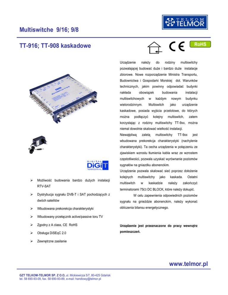 Multiswitche 9/16; 9/8 RoHS TT-916; TT-908 kaskadowe Urządzenie należy do rodziny multiswitchy pozwalającej budować duże i bardzo duże instalacje zbiorowe. Nowe rozporządzenie Ministra Transportu, Budownictwa i Gospodarki Morskiej dot. Warunków technicznych, jakim powinny odpowiadać budynki nakłada obowiązek budowania multiswitchowych w każdym wielorodzinnym. Multiswitch instalacji nowym jako budynku urządzenie kaskadowe, posiada wyjścia przelotowe, do których można podłączyć kolejny multiswitch, zatem korzystając z rodziny multiswitchy TT-9xx, można niemal dowolnie skalować wielkość instalacji. Niewątpliwą zaletą multiswitchy TT-9xx jest wbudowana prekorekcja charakterystyki (nachylenie charakterystyki). Ta cecha urządzenia w połączeniu ze zjawiskiem wzrostu tłumienia kabla wraz ze wzrostem częstotliwości, pozwala uzyskać wyrównanie poziomów sygnałów na gniazdku abonenckim. Urządzenie pozwala skalować sieć poprzez dołożenie Możliwość budowania bardzo dużych instalacji RTV-SAT Dystrybucja sygnału DVB-T i SAT pochodzących z kolejnych multiswitchy multiswitch w jako kaskadzie kaskada. należy Ostatni zakończyć terminatorami 75DC BLOCK, które należy dokupić. W celu zapewnienia odpowiednich poziomów dwóch satelitów sygnału na gnieździe abonenckim, należy wykonać Wbudowana prekorekcja charakterystyki obliczenia bilansu energetycznego. Wbudowany przełącznik active/passive toru TV Zgodny z A class, CE RoHS Urządzenie jest przeznaczone do pracy wewnątrz Obsługa DiSEqC 2.0 pomieszczeń. Zewnętrzne zasilanie www.telmor.pl GZT TELKOM-TELMOR SP. Z O.O, ul. Mickiewicza 5/7, 80-425 Gdańsk tel. 58 690-93-09, fax. 58 690-93-89, e-mail: [email protected] PARAMETRY TECHNICZNE Typ Zakres częstotliwości MHz pracy toru SAT Zakres częstotliwości toru MHz TV Ilość wejść SAT Ilość wejść TV Ilość wyjść Tłumienie toru TV dB odgałęzienie (tor aktywny) Tłumienie toru TV odgałęzienie (tor pasywny) Tłumienie toru TV dB Przelot Tłumienie toru SAT dB odgałęzienie Tłumienie toru SAT dB przelot Tłumienie odbić dB (dopasowanie) toru TV Tłumienie odbić dB (dopasowanie) toru SAT Maksymalny poziom dBuV wyjściowy toru TV Mksymalny poziom dBuV wyjściowy toru SAT Separacja TVdB do SAT Separacja SAT do TV dB Separacja pomiędzy dB polaryzacjami H/V Zasilanie VDC/mA Pobór prądu z odbiornika mA Komendy przełączające Wymiary mm Multiswitch 9/8 Multiswitch 9/16 950-2150MHz 5-862 8 1 8 16 4…0 5…1 24…20 25…21 3…4 4…5 0…4 1…3 1…2 2…3 >10 >8 95 92 >24 >60 >30 16/1500 40 DiSEqC 2.0 (13V/18V, 0/22kHz Tonowo) 110x190x4 170x190x40 Parametry techniczne mogą ulec zmianie bez wcześniejszego powiadomienia GZT TELKOM-TELMOR SP. Z O.O, ul. Mickiewicza 5/7, 80-425 Gdańsk tel. 58 690-93-09, fax. 58 690-93-89, e-mail: [email protected] www.telmor.pl
