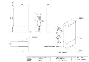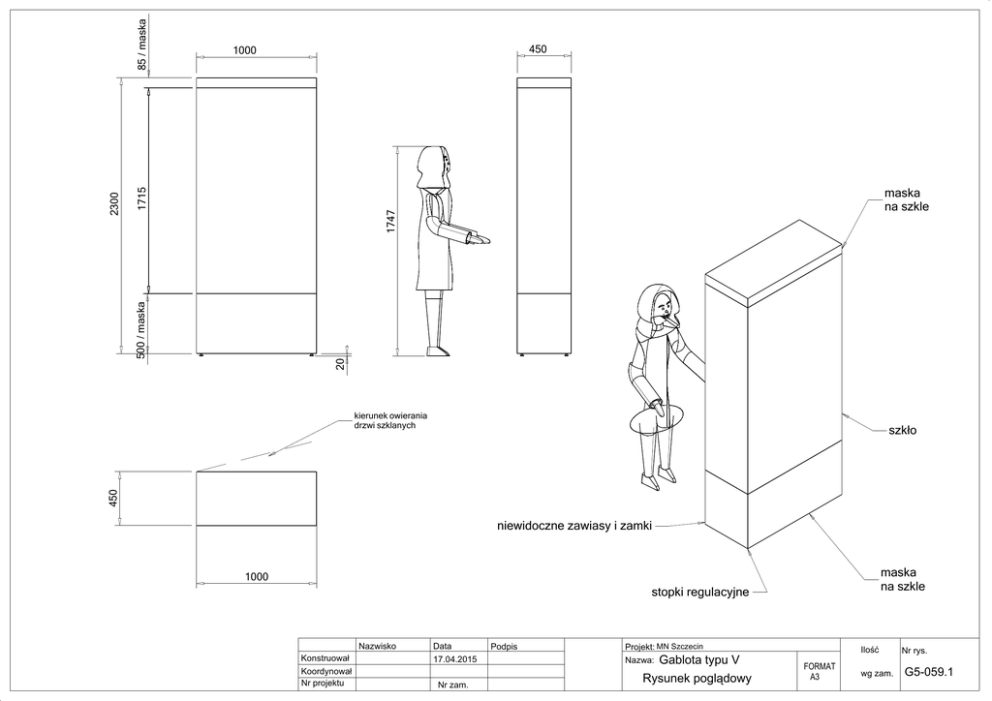 85 / maska maska na szkle 1747 1715 20 500 / maska 2300 450 1000 kierunek owierania drzwi szklanych 450 szkło niewidoczne zawiasy i zamki maska na szkle 1000 stopki regulacyjne Konstruował Koordynował Nr projektu Nazwisko Data 17.04.2015 Nr zam. Podpis Projekt: MN Szczecin Nazwa: Gablota typu V Rysunek poglądowy Ilość FORMAT A3 wg zam. Nr rys. G5-059.1