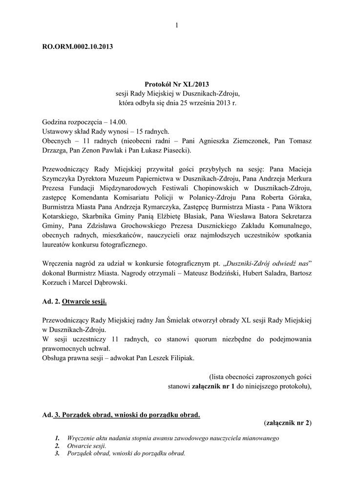 1 RO.ORM.0002.10.2013 Protokół Nr XL/2013 sesji Rady Miejskiej w Dusznikach-Zdroju, która odbyła się dnia 25 września 2013 r. Godzina rozpoczęcia – 14.00. Ustawowy skład Rady wynosi – 15 radnych. Obecnych – 11 radnych (nieobecni radni – Pani Agnieszka Ziemczonek, Pan Tomasz Drzazga, Pan Zenon Pawlak i Pan Łukasz Piasecki). Przewodniczący Rady Miejskiej przywitał gości przybyłych na sesję: Pana Macieja Szymczyka Dyrektora Muzeum Papiernictwa w Dusznikach-Zdroju, Pana Andrzeja Merkura Prezesa Fundacji Międzynarodowych Festiwali Chopinowskich w Dusznikach-Zdroju, zastępcę Komendanta Komisariatu Policji w Polanicy-Zdroju Pana Roberta Góraka, Burmistrza Miasta Pana Andrzeja Rymarczyka, Zastępcę Burmistrza Miasta - Pana Wiktora Kotarskiego, Skarbnika Gminy Panią Elżbietę Błasiak, Pana Wiesława Batora Sekretarza Gminy, Pana Zdzisława Grochowskiego Prezesa Dusznickiego Zakładu Komunalnego, obecnych radnych, mieszkańców, nauczycieli oraz najmłodszych uczestników spotkania laureatów konkursu fotograficznego. Wręczenia nagród za udział w konkursie fotograficznym pt. „Duszniki-Zdrój odwiedź nas” dokonał Burmistrz Miasta. Nagrody otrzymali – Mateusz Bodziński, Hubert Saladra, Bartosz Korzuch i Marcel Dąbrowski. Ad. 2. Otwarcie sesji. Przewodniczący Rady Miejskiej radny Jan Śmielak otworzył obrady XL sesji Rady Miejskiej w Dusznikach-Zdroju. W sesji uczestniczy 11 radnych, co stanowi quorum niezbędne do podejmowania prawomocnych uchwał. Obsługa prawna sesji – adwokat Pan Leszek Filipiak. (lista obecności zaproszonych gości stanowi załącznik nr 1 do niniejszego protokołu), Ad. 3. Porządek obrad, wnioski do porządku obrad. (załącznik nr 2) 1. 2. 3. Wręczenie aktu nadania stopnia awansu zawodowego nauczyciela mianowanego Otwarcie sesji. Porządek obrad, wnioski do porządku obrad. 2 4. Informacja dot. XIII Święta Papieru oraz wystaw organizowanych w Muzeum Papiernictwa. 5. Informacja o przebiegu 68 Międzynarodowego Festiwalu Chopinowskiego w DusznikachZdroju. 6. Sprawozdanie z działalności Straży Miejskiej. 7. Sprawozdanie z nadzoru pedagogicznego i realizacji zadań oświatowych w roku szkolnym 2012/2013. 8. Rozpatrzenie projektów uchwał oraz podjęcie uchwał w sprawach: a) Zmiany wieloletniej prognozy finansowej gminy Duszniki-Zdrój na lata 2013-2020, b) Wprowadzenia zmian w budżecie gminy Duszniki-Zdrój na rok 2013., c) Ustalenia odpłatności za pobyt w grupie żłobkowej prowadzonej przez Gminę Duszniki-Zdrój, d) Opłaty za świadczenia udzielane w przedszkolu publicznym prowadzonym przez Gminę Duszniki-Zdrój, e) Wyrażenia zgody na oddanie nieruchomości w dzierżawę oraz odstąpienia od obowiązku przetargowego trybu zawarcia umowy dzierżawy, f) Zawarcia umowy najmu zaadaptowanego lokalu mieszkalnego, g) Zlecenia kontroli Komisji Rewizyjnej. 9. Sprawozdanie z prac Burmistrza Miasta Duszniki-Zdrój w okresie międzysesyjnym. 10. Przyjęcie protokołu z XXXIX sesji Rady Miejskiej w Dusznikach-Zdroju. 11. Interpelacje, wnioski i sprawy różne. 12. Zamknięcie obrad XL sesji Rady Miejskiej w Dusznikach-Zdroju. Radny R Kowal wnioskował o wykreślenie z porządku obrad punktu 8 „e” dotyczącego projektu uchwały w sprawie wyrażenia zgody na oddanie nieruchomości w dzierżawę oraz odstąpienia od obowiązku przetargowego trybu zawarcia umowy dzierżawy. Radny zapytał ile złożono ofert na dzierżawę terenu pod wyciągiem. Ile wpłynęło pisemnych ofert? Pan Burmistrz wyjaśnił, że oferta dotycząca konkretnych działek wymienionych w projekcie uchwały była jedna. Jest jeszcze jedna oferta, która jednak nie obejmuje podstawowych parametrów, jakie powinna zawierać oferta. Jest to ewentualne stwierdzenie chęci. Odnośnie projektu uchwały Komisja Uzdrowiskowo-Wczasowa zajmuje się tematem, od co najmniej dwóch miesięcy. Radny R. Kowal powiedział, że przy dwóch ofertach powinien zostać ogłoszony przetarg na dzierżawę. Przystąpiliśmy do planu zagospodarowania przestrzennego na obszarze całego miasta i w momencie przystąpienia do planu nie możemy wydawać żadnych decyzji o warunkach zabudowy W trakcie rozstrzygania jest przetarg na plan zagospodarowania. Burmistrz wyjaśnił, że jest to strefa specjalna, w której można wydawać decyzje. Radni przystąpili do przegłosowania wniosku zgłoszonego przez radnego R. Kowala. W głosowaniu brało udział 11 radnych: za – 3 radnych, przeciw – 8 radnych, 3 wstrzymało się – 0 radnych. Głosami radnych projekt uchwały nie został wycofany z porządku obrad. Brak innych uwag do porządku obrad. Przewodniczący Rady Miejskiej stwierdził, że Rada Miejska przyjęła zaproponowany porządek obrad. Ad. 1. Wręczenie aktu nadania stopnia awansu zawodowego nauczyciela mianowanego. Pan Burmistrz uroczyście wręczył akty nadania stopnia zawodowego nauczyciela mianowanego następującym nauczycielom: Pani Aleksandrze Rola, Pani Dorocie Czajkowskiej, nieobecnej podczas sesji Pani Małgorzacie Gorzkowskiej i Panu Damianowi Baczmańskiemu. O godz. 14.20 przyszła radna P. Agnieszka Ziemczonek. Obecnych – 12 radnych. Ad. 4. Informacja dot. XIII Święta Papieru oraz wystaw organizowanych w Muzeum Papiernictwa. Temat przybliżył obecnym Pan Maciej Szymczyk Dyrektor Muzeum Papiernictwa w Dusznikach-Zdroju. Pan Dyrektor podziękował radnym za podjęcie uchwały w sprawie wsparcia starań o wpisanie Młyna Papierniczego w Dusznikach-Zdroju na Listę Światowego Dziedzictwa Kulturalnego i Naturalnego UNESCO. Koszt organizacji tegorocznego Święta Papieru to kwota około 80 000 zł. W imprezie uczestniczyło około 60 wystawców zewnętrznych, stoiska artystów sztuki papieru oraz stoiska z wyrobami rękodzielniczymi i produktami regionalnymi niezwiązanymi z papierem. Założeniem festynu jest zapewnienie odwiedzającym czynnego uczestnictwa w przygotowanych warsztatach i możliwość zabrania ze sobą efektów swojej pracy. Podczas święta otwi