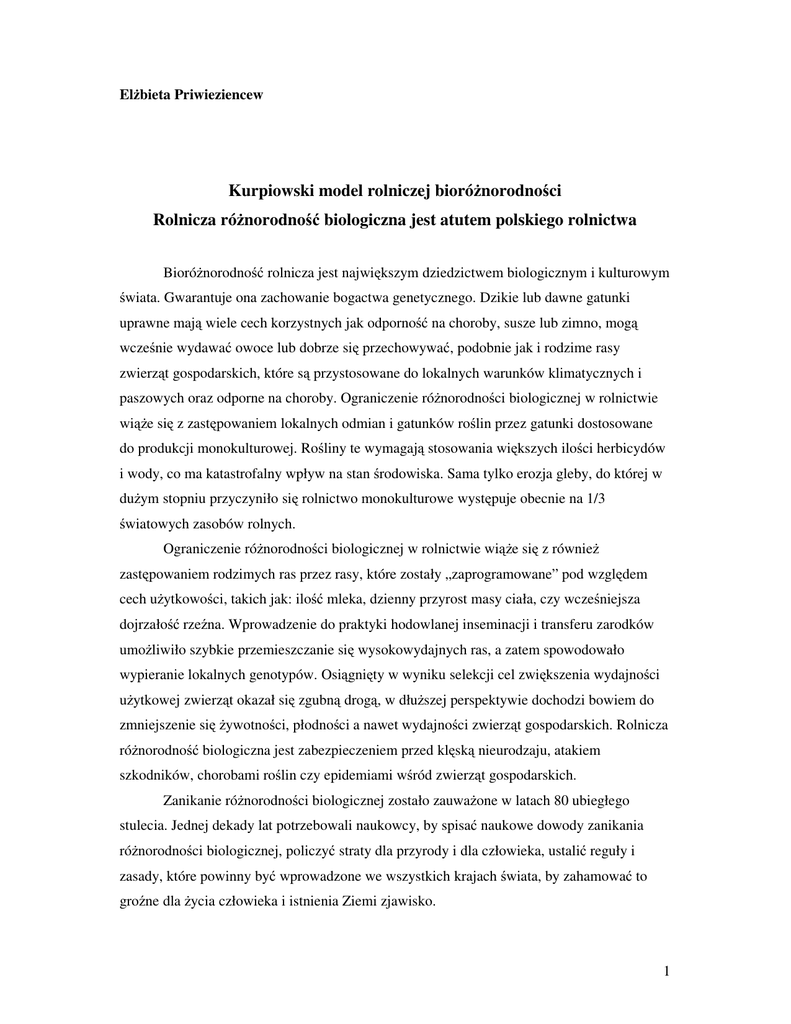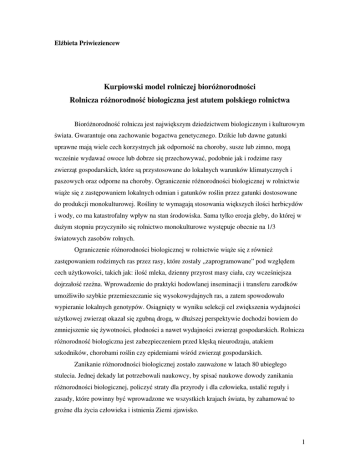 ElŜbieta Priwieziencew Kurpiowski model rolniczej bioróŜnorodności Rolnicza róŜnorodność biologiczna jest atutem polskiego rolnictwa BioróŜnorodność rolnicza jest największym dziedzictwem biologicznym i kulturowym świata. Gwarantuje ona zachowanie bogactwa genetycznego. Dzikie lub dawne gatunki uprawne mają wiele cech korzystnych jak odporność na choroby, susze lub zimno, mogą wcześnie wydawać owoce lub dobrze się przechowywać, podobnie jak i rodzime rasy zwierząt gospodarskich, które są przystosowane do lokalnych warunków klimatycznych i paszowych oraz odporne na choroby. Ograniczenie róŜnorodności biologicznej w rolnictwie wiąŜe się z zastępowaniem lokalnych odmian i gatunków roślin przez gatunki dostosowane do produkcji monokulturowej. Rośliny te wymagają stosowania większych ilości herbicydów i wody, co ma katastrofalny wpływ na stan środowiska. Sama tylko erozja gleby, do której w duŜym stopniu przyczyniło się rolnictwo monokulturowe występuje obecnie na 1/3 światowych zasobów rolnych. Ograniczenie róŜnorodności biologicznej w rolnictwie wiąŜe się z równieŜ zastępowaniem rodzimych ras przez rasy, które zostały „zaprogramowane” pod względem cech uŜytkowości, takich jak: ilość mleka, dzienny przyrost masy ciała, czy wcześniejsza dojrzałość rzeźna. Wprowadzenie do praktyki hodowlanej inseminacji i transferu zarodków umoŜliwiło szybkie przemieszczanie się wysokowydajnych ras, a zatem spowodowało wypieranie lokalnych genotypów. Osiągnięty w wyniku selekcji cel zwiększenia wydajności uŜytkowej zwierząt okazał się zgubną drogą, w dłuŜszej perspektywie dochodzi bowiem do zmniejszenie się Ŝywotności, płodności a nawet wydajności zwierząt gospodarskich. Rolnicza róŜnorodność biologiczna jest zabezpieczeniem przed klęską nieurodzaju, atakiem szkodników, chorobami roślin czy epidemiami wśród zwierząt gospodarskich. Zanikanie róŜnorodności biologicznej zostało zauwaŜone w latach 80 ubiegłego stulecia. Jednej dekady lat potrzebowali naukowcy, by spisać naukowe dowody zanikania róŜnorodności biologicznej, policzyć straty dla przyrody i dla człowieka, ustalić reguły i zasady, które powinny być wprowadzone we wszystkich krajach świata, by zahamować to groźne dla Ŝycia człowieka i istnienia Ziemi zjawisko. 1 W 1992 roku na szczycie Ziemi w Rio de Janeiro uchwalono wreszcie Konwencję o RóŜnorodności Biologicznej. Według definicji przyjętej oficjalnie przez Konwencję róŜnorodność gatunkowa oznacza „zróŜnicowanie wszystkich organizmów Ŝywych występujących na Ziemi w ekosystemach lądowych, morskich i innych wodnych, jak teŜ w zespołach ekologicznych, których częścią są te organizmy. Dotyczy to róŜnorodności wewnątrz gatunkowej i róŜnorodności na poziomie ekosystemów. O ile nie ma Ŝadnej zasługi człowieka w tworzeniu róŜnorodności biologicznej (przeciwnie człowiek jest jej największym niszczycielem), to rolnicza róŜnorodność biologiczna jest „dziełem” hodowców i uŜytkowników. Bez nich nie byłoby tysięcy ras zwierząt ani odmian roślin. BioróŜnorodność w rolnictwie to zarówno róŜnorodność gatunków roślin i zwierząt dziko Ŝyjących na terenach rolniczych, jak i róŜnorodność gatunków, odmian i ras udomowionych oraz dzikich będących ich przodkami. Dzięki tej rozmaitości ras i odmian lokalnych populacji przez setki lat zagwarantowana była produkcja poŜywienia. To rolnicza róŜnorodność biologiczna dała gwarancje przeŜycia ludzi w najróŜniejszych warunkach klimatycznych, geograficznych, środowiskowych i kulturowych. W ciągu ostatnich 150 lat produkcja rolnicza zmieniła się zasadniczo. Początkowo ściśle związana z warunkami lokalnymi stała się zaleŜna od przemysłu agrochemicznego. Naukowo „udoskonalone” odmiany roślin i rasy zwierząt wymagały odpowiednich nawozów, pestycydów, herbicydów, insektycydów, wysokobiałkowej paszy, hormonów, antybiotyków, itp. Dodatkowo polityka rolna, której celem była wysoko wydaja produkcję rolna, bez względu na rzeczywiste koszty, jakie muszą być poniesione, doprowadziła do nadprodukcji Ŝywności, często niŜszej jakości. We współczesnym przemysłowym rolnictwie liczy się wyłącznie zysk ekonomiczny. Rolnictwo stało się agrobiznesem – obowiązuje w nim standaryzacja produktów i produkcji, koncentracja przetwórstwa i handlu. To koncerny decydują o produktach rolniczych i o cenach produktów rolniczych. Nowoczesne rolnictwo zaczęło kumulować efekty negatywne: erozja gleb, eutrofizacja, emisja CO2. Nowoczesne rolnictwo doprowadziło równieŜ do kurczenia się podstawy istnienia rolnictwa – rolniczej róŜnorodności biologicznej. Od 1900 roku zginęło na świecie ponad 75% odmian roślin uŜytkowych. We Włoszech w ciągu ostatnich 40 lat wyginęły prawie wszystkie stare gatunki pszenicy, cebuli, pomidorów, sałaty, grochu. W Południowej Korei w ciągu ośmiu lat (1985-1993) przestało istnieć ponad 3/4 gatunków roślin uprawnych. W Chinach jeszcze w 1949 roku istniało 8000 gatunków ryŜu, dziś uprawia się tam zaledwie 50. W Meksyku od 1930 roku wyginęło 80% gatunków kukurydzy. Między rokiem 1903 a 1983 ponad 7300 odmian warzyw zostało 2 wykreślonych narodowej listy nasion USA. Świat Ŝywi się dziś w zasadzie 10 odmianami roślin uprawnych, nie wykorzystując 99, 6% istniejących ciągle roślin uŜytkowych. Dwanaście odmian roślin i 5 ras zwierząt gospodarskich w 70 % zaspokaja nasze potrzeby Ŝywieniowe. Blisko połowę roślinnych produktów Ŝywnościowych dostarczają tylko 4 gatunki roślin; ryŜ, kukurydza, pszenica i ziemniak. Czarno-biała rasa bydła rasy holsztyńskofryzyjskiej jest dziś w 128 krajach, rasa świń wielka biała w 117, a kozy rasy Saanen w 81 krajach. Wprowadzenie do rolnictwa Genetycznie Zmodyfikowanych Organizmów zwiększyło zagroŜenie utraty rolniczej róŜnorod