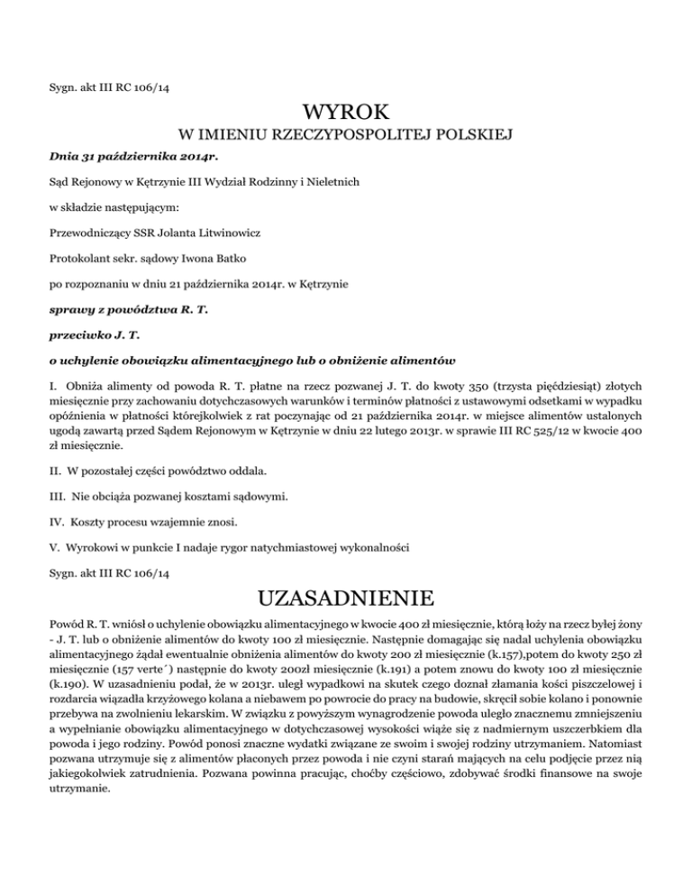 Sygn. akt III RC 106/14 WYROK W IMIENIU RZECZYPOSPOLITEJ POLSKIEJ Dnia 31 października 2014r. Sąd Rejonowy w Kętrzynie III Wydział Rodzinny i Nieletnich w składzie następującym: Przewodniczący SSR Jolanta Litwinowicz Protokolant sekr. sądowy Iwona Batko po rozpoznaniu w dniu 21 października 2014r. w Kętrzynie sprawy z powództwa R. T. przeciwko J. T. o uchylenie obowiązku alimentacyjnego lub o obniżenie alimentów I. Obniża alimenty od powoda R. T. płatne na rzecz pozwanej J. T. do kwoty 350 (trzysta pięćdziesiąt) złotych miesięcznie przy zachowaniu dotychczasowych warunków i terminów płatności z ustawowymi odsetkami w wypadku opóźnienia w płatności którejkolwiek z rat poczynając od 21 października 2014r. w miejsce alimentów ustalonych ugodą zawartą przed Sądem Rejonowym w Kętrzynie w dniu 22 lutego 2013r. w sprawie III RC 525/12 w kwocie 400 zł miesięcznie. II. W pozostałej części powództwo oddala. III. Nie obciąża pozwanej kosztami sądowymi. IV. Koszty procesu wzajemnie znosi. V. Wyrokowi w punkcie I nadaje rygor natychmiastowej wykonalności Sygn. akt III RC 106/14 UZASADNIENIE Powód R. T. wniósł o uchylenie obowiązku alimentacyjnego w kwocie 400 zł miesięcznie, którą łoży na rzecz byłej żony - J. T. lub o obniżenie alimentów do kwoty 100 zł miesięcznie. Następnie domagając się nadal uchylenia obowiązku alimentacyjnego żądał ewentualnie obniżenia alimentów do kwoty 200 zł miesięcznie (k.157),potem do kwoty 250 zł miesięcznie (157 verte´) następnie do kwoty 200zł miesięcznie (k.191) a potem znowu do kwoty 100 zł miesięcznie (k.190). W uzasadnieniu podał, że w 2013r. uległ wypadkowi na skutek czego doznał złamania kości piszczelowej i rozdarcia wiązadła krzyżowego kolana a niebawem po powrocie do pracy na budowie, skręcił sobie kolano i ponownie przebywa na zwolnieniu lekarskim. W związku z powyższym wynagrodzenie powoda uległo znacznemu zmniejszeniu a wypełnianie obowiązku alimentacyjnego w dotychczasowej wysokości wiąże się z nadmiernym uszczerbkiem dla powoda i jego rodziny. Powód ponosi znaczne wydatki związane ze swoim i swojej rodziny utrzymaniem. Natomiast pozwana utrzymuje się z alimentów płaconych przez powoda i nie czyni starań mających na celu podjęcie przez nią jakiegokolwiek zatrudnienia. Pozwana powinna pracując, choćby częściowo, zdobywać środki finansowe na swoje utrzymanie. Pozwana J. T. domagała się oddalenia powództwa w całości. Podniosła, że wskutek rozwodu jej sytuacja uległa znacznemu pogorszeniu, popadła w niedostatek, nie stać jej na zaspokojenie podstawowych potrzeb życiowych, niewiele zarabia i ma problemy ze zdrowiem. Sąd ustalił, co następuje: Wyrokiem Sądu Okręgowego w Olsztynie z dnia 27 czerwca 2011r. w sprawie VI RC 2007/10 małżeństwo stron zostało rozwiązane przez rozwód z winy powoda. Wyrokiem tym został określony obowiązek alimentacyjny powoda wobec pozwanej na kwotę 800 zł miesięcznie ( k.69 w sprawie sygn. akt VIRC 2007/10). Następnie w dniu 22 lutego 2013r. przed Sądem Rejonowym w Kętrzynie strony zwarły ugodę, w której ustaliły obniżenie alimentów płatnych na rzecz pozwanej do kwoty 400 zł miesięcznie (k.46 w sprawie sygn. akt III RC 525/12). Z małżeństwa strony miały dwoje dzieci, które są już samodzielne . Strony od dawna nie mieszkają razem. Jeszcze przed rozwodem powód mieszkał i pracował za granicą. Łożył na utrzymanie rodziny. Powódka leczyła się z powodu dyskopatii i rwy kulszowej. W trakcie pobytu za granicą powód związał się z inną kobietą. Z tego związku w dniu (...) urodziła się małoletnia M. T.. W dacie orzekania w poprzedniej sprawie powód był zatrudniony w (...) S.c.w A. jako malarz tapeciarz z zarobkiem 1625 euro miesięcznie oraz pobierał ekwiwalent na dojazdy w kwocie 49 euro (k.21-22 oraz k. 25 w aktach III RC 525/12). Opłacał czynsz z tytułu najmu mieszkania w wysokości 325 euro miesięcznie z przedpłatą za media i koszty dodatkowe w kwocie 150 euro tj. łącznie 475 euro miesięcznie (k.23-24 w aktach III RC525/12). Powód z zawodu jest murarzem, ma 49 lat. Zatrudniony jest jako posadzkarz z tym, że ostatnio przebywał na zasiłku chorobowym w kwocie netto 1446 euro miesięcznie ( pismo (...) Kasy Chorych w B. wraz z tłumaczeniem k.14 i k.15 oraz k.12 i 13). W dniu 11 lipca 2013r. powód uległ wypadkowi ( uraz w kolano wózkiem na zakupy- k.10), na skutek którego doznał bocznego złamania głowy kości piszczelowej oraz przedniego rozdarcia wiązadła krzyżowego kolana prawego. Przebywał na zwolnieniu lekarskim do 11 listopada 2013r. W dniu 25 listopada 2013r. powód podczas pracy na budowie skręcił sobie prawe kolano i od tego czasu ponownie przebywał na zwolnieniu lekarskim. W dniu 3 lutego 2014r. powód przebył zabieg artroskopowej plastyki przedniego wiązadła krzyżowego prawego stawu kolanowego (kserokopia karty informacyjnej leczenia szpitalnego z Kliniki w B. wraz z tłumaczeniem na język polski k.8-11,zaświadczenie lekarskie k. 55,145). Powód ponosi koszty związane z utrzymaniem mieszkania : nadal 475 euro za czynsz i przedpłatę za media ;19,99 euro za internet i telefon; 43,34 euro za ubezpieczenie od wypadku i ubezpieczenie domu; 9,83 euro za ubezpieczenie od pożaru; 56 euro miesięcznie za przedszkole córki, koszty ubezpieczenia samochodu w łącznej kwocie 72,08 euro w tym kwota 36,64 euro tytułem AC oraz ponosi koszt benzyny w wysokości średnio 100 euro miesięcznie a także spłaca kredyt ratalny w wysokości 225 euro miesięcznie, ponadto opłaca ubezpieczenie emerytalne drugiej żony w wysokości 60 euro miesięcznie oraz swoje ubezpieczenie na życie w wysokości 50 euro miesięcznie (wyciąg ,zestawienie obrotów na koncie wraz z tłumaczeniem k.16 -22 oraz k.61-105,k.138-143,151-173,158-188). Ponadto wpłaca do komornika 150 euro miesięcznie (powód nie płacił alimentów wobec czego pozwana wsz