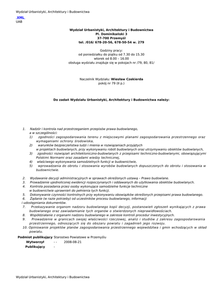 Wydział Urbanistyki, Architektury i Budownictwa XML UAB Wydział Urbanistyki, Architektury i Budownictwa Pl. Dominikański 3 37-700 Przemyśl tel. /016/ 678-20-56, 678-50-54 w. 279 Godziny pracy: od poniedziałku do piątku od 7.30 do 15.30 wtorek od 8.00 – 16.00 obsługa wydziału znajduje się w pokojach nr /79, 80, 81/ Naczelnik Wydziału: Wiesław Czekierda pokój nr 79 (II p.) Do zadań Wydziału Urbanistyki, Architektury i Budownictwa należy: 1. Nadzór i kontrola nad przestrzeganiem przepisów prawa budowlanego, a w szczególności: 1) zgodności zagospodarowania terenu z miejscowymi planami zagospodarowania przestrzennego oraz wymaganiami ochrony środowiska, 2) warunków bezpieczeństwa ludzi i mienia w rozwiązaniach przyjętych w projektach budowlanych, przy wykonywaniu robót budowlanych oraz utrzymywaniu obiektów budowlanych, 3) zgodności rozwiązań architektoniczno-budowlanych z przepisami techniczno-budowlanymi, obowiązującymi Polskimi Normami oraz zasadami wiedzy technicznej, 4) właściwego wykonywania samodzielnych funkcji w budownictwie, 5) wprowadzania do obrotu i stosowania wyrobów budowlanych dopuszczonych do obrotu i stosowania w budownictwie. 2. 3. 4. Wydawanie decyzji administracyjnych w sprawach określonych ustawą – Prawo budowlane. Prowadzenie ujednoliconej ewidencji rozpoczynanych i oddawanych do użytkowania obiektów budowlanych. Kontrola posiadania przez osoby wykonujące samodzielne funkcje techniczne w budownictwie uprawnień do pełnienia tych funkcji. 5. Dokonywanie czynności kontrolnych przy wykonywaniu obowiązków określonych przepisami prawa budowlanego. 6. Żądanie (w razie potrzeby) od uczestników procesu budowlanego, informacji i udostępniania dokumentów. 7. Przekazywanie organom nadzoru budowlanego kopii decyzji, postanowień zgłoszeń wynikających z prawa budowlanego oraz zawiadamianie tych organów o stwierdzonych nieprawidłowościach. 8. Współdziałanie z organami nadzoru budowlanego w zakresie kontroli procedur inwestycyjnych. 9. Prowadzenie w granicach swojej właściwości rzeczowej, analiz i studiów z zakresu zagospodarowania przestrzennego, odnoszących się do obszaru powiatu i zagadnień jego rozwoju. 10. Opiniowanie projektów planów zagospodarowania przestrzennego województwa i gmin wchodzących w skład powiatu. Podmiot publikujący Starostwo Powiatowe w Przemyślu Wytworzył -- Publikujący - 2008-08-21 Wydział Urbanistyki, Architektury i Budownictwa