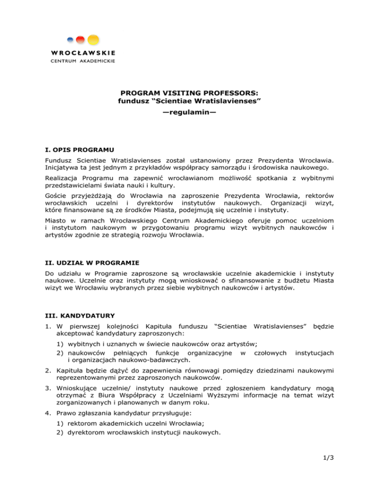 PROGRAM VISITING PROFESSORS: fundusz “Scientiae Wratislavienses” —regulamin— I. OPIS PROGRAMU Fundusz Scientiae Wratislavienses został ustanowiony przez Prezydenta Wrocławia. Inicjatywa ta jest jednym z przykładów współpracy samorządu i środowiska naukowego. Realizacja Programu ma zapewnić wrocławianom możliwość spotkania z wybitnymi przedstawicielami świata nauki i kultury. Goście przyjeżdżają do Wrocławia na zaproszenie Prezydenta Wrocławia, rektorów wrocławskich uczelni i dyrektorów instytutów naukowych. Organizacji wizyt, które finansowane są ze środków Miasta, podejmują się uczelnie i instytuty. Miasto w ramach Wrocławskiego Centrum Akademickiego oferuje pomoc uczelniom i instytutom naukowym w przygotowaniu programu wizyt wybitnych naukowców i artystów zgodnie ze strategią rozwoju Wrocławia. II. UDZIAŁ W PROGRAMIE Do udziału w Programie zaproszone są wrocławskie uczelnie akademickie i instytuty naukowe. Uczelnie oraz instytuty mogą wnioskować o sfinansowanie z budżetu Miasta wizyt we Wrocławiu wybranych przez siebie wybitnych naukowców i artystów. III. KANDYDATURY 1. W pierwszej kolejności Kapituła funduszu akceptować kandydatury zaproszonych: “Scientiae Wratislavienses” będzie 1) wybitnych i uznanych w świecie naukowców oraz artystów; 2) naukowców pełniących funkcje organizacyjne i organizacjach naukowo-badawczych. w czołowych instytucjach 2. Kapituła będzie dążyć do zapewnienia równowagi pomiędzy dziedzinami naukowymi reprezentowanymi przez zaproszonych naukowców. 3. Wnioskujące uczelnie/ instytuty naukowe przed zgłoszeniem kandydatury mogą otrzymać z Biura Współpracy z Uczelniami Wyższymi informacje na temat wizyt zorganizowanych i planowanych w danym roku. 4. Prawo zgłaszania kandydatur przysługuje: 1) rektorom akademickich uczelni Wrocławia; 2) dyrektorom wrocławskich instytucji naukowych. 1/3 IV. PROCEDURA Rektor uczelni lub Dyrektor instytutu naukowego kieruje do Biura Współpracy z Uczelniami Wyższymi wniosek o dofinansowanie wizyty naukowca wraz z załącznikami: programem wizyty i życiorysem gościa. Wzór wniosku stanowi załącznik do regulaminu. Biuro przekazuje dokumenty członkom Kapituły. Wniosek o akceptację powinien uwzględniać uzasadnienie dla wizyty uczonego i artysty we Wrocławiu (odniesienie do strategii rozwoju „Wrocław w perspektywie 2020 plus”, strona internetowa: http://wrosystem.um.wroc.pl/beta_4/webdisk/a1df863b-22e6-415baf6b-8631de710b61/strategia_pl.pdf) oraz kosztorys wizyty. Wnioski dotyczące wizyt zaplanowanych na dany rok kalendarzowy powinny być złożone do 30 listopada w roku poprzedzającym przeprowadzenie wizyt (wnioski dotyczące wizyt zaplanowanych na rok 2017 będą przyjmowane do 30 listopada 2016 r.). V. PROGRAM WIZYTY Składając wniosek uczelnia/ instytut proponuje program wizyty. Program winien uwzględniać aspekt promocji nauki wśród wrocławian. Wytyczne do programu zawarte są we „wniosku o dofinansowanie wizyty”. VI. AKCEPTACJA KANDYDATURY 1. Decyzję o akceptacji bądź odrzuceniu kandydatury przedstawianej przez uczelnie i instytuty naukowe podejmuje Kapituła (Kapituła bierze pod uwagę profil uczonego oraz program pobytu na miejscu). 2. Akceptacja wniosku jest równoznaczna z przyznaniem finansowania w wysokości zaakceptowanej przez Kapitułę. 3. W skład Kapituły wchodzą: 1) rektor desygnowany przez Kolegium Rektorów Uczelni Wrocławia, Opola, Częstochowy i Zielonej Góry (KRUWOCZ); 2) dwóch profesorów wrocławskich uczelni desygnowanych wrocławskich uczelni należących do KRUWOCZ; przez rektorów 3) profesor opolskiej, zielonogórskiej lub częstochowskiej uczelni desygnowany przez rektorów uczelni z Zielonej Góry, Częstochowy i Opola; 4) doradca Prezydenta Wrocławia ds. współpracy który pełni funkcję przewodniczącego Kapituły. z uczelniami wyższymi, 5) VII. ZAPROSZENIE Po akceptacji kandydatury przez Kapitułę zaproszenie dla gościa wystosowują Doradca Prezydenta ds. współpracy z uczelniami wyższymi i Rektor uczelni/ Dyrektor instytucji – organizatora wizyty. Zaproszenie zawiera nazwisko reprezentanta uczelni/ instytutu wnioskujących odpowiedzialnego za kontakt roboczy z gościem. VIII. PRZEPROWADZENIE WIZYTY Na okoliczność organizacji wizyty uczelnia/ instytut zawierają umowę z Gminą Wrocław, na kwotę zatwierdzoną przez Kapitułę z przeznaczeniem na organizację wizyty. Środki zostają przelane na wskazane konto uczelni/ instytutu, po przedłożeniu przez uczelnię/instytut „oferty realizacji zadania” i podpisaniu umowy. 2/3 IX. ZAŁĄCZNIKI: 1) formularz wniosku o dofinansowanie; 2) formularz z przeznaczeniem na informację zbiorczą na temat wizyt proponowanych przez daną uczelnię/ instytut (zgodnie z zaproponowanym wzorem). 3/3