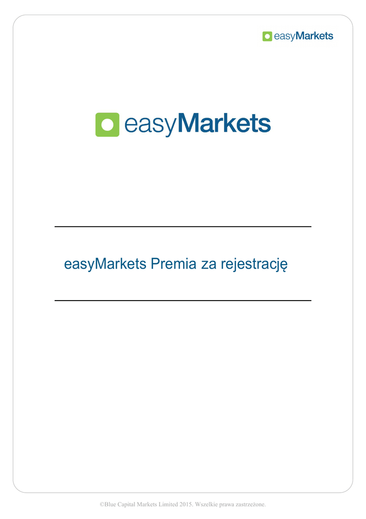 easyMarkets Premia za rejestrację ©Blue Capital Markets Limited 2015. Wszelkie prawa zastrzeżone. easyMarkets Premia za rejestrację Wszyscy nowi klienci korzystający z easyMarkets są uprawnieni do otrzymania premii za rejestrację po weryfikacji numeru ich telefonu oraz bez konieczności wpłacenia depozytu. Klienci powinni nacisnąć przycisk premii za rejestrację w obszarze zarządzania strefą transakcji, a następnie postępując zgodnie z instrukcjami przejść procedurę weryfikacji numeru telefonu oraz zaakceptować Umowę z Użytkownikiem. Premia zostanie automatycznie przekazana na konto klienta w oparciu o wybraną walutę bazową. Wartość premii jest wyraźnie określona w wiadomości zawierającej instrukcje dotyczące potwierdzenia numeru telefonu. Wartość premii za rejestrację może różnić się w zależności od dostępnych w danym czasie kampanii easyMarkets. Klienci muszą zaakceptować tę premię w wiadomości zawierającej instrukcje dotyczące potwierdzenia numeru. Dana promocja jest dostępna dla wszystkich nowych, pełnoletnich klientów, korzystających z dowolnego instrumentu finansowego na platformie easyMarkets lub MT4. Premia może być wykorzystana aż do wygaśnięcia. Wszelkie pozostałe premie po dacie wygaśnięcia najnowszej dodanej premii zostaną usunięte z konta klienta. Premie są przeznaczone wyłącznie na cele inwestycyjne. Nie mogą być przekazywane, nie podlegają wypłacie ani zwrotowi. Inwestor w dowolnym czasie może wypłacić wszelkie zyski wypracowane w wyniku inwestowania kwotą premii. Więcej informacji na temat kredytu transakcyjnego (premii) można znaleźć w witrynie zawierającej Ogólny Regulamin Kredytu Transakcyjnego. Każdy klient może uczestniczyć w danej promocji wyłącznie za pośrednictwem jednego ze swoich kont handlowych. Należące do tego samego klienta konta wielokrotne zostaną zdyskwalifikowane. Zastrzegamy sobie prawo do zdyskwalifikowania uczestnika i odebrania mu premii w pełnej wysokości, jeśli zaistnieją uzasadnione podejrzenia nadużycia lub manipulowania ofertą w jakikolwiek sposób, w tym korzystanie z adresu IP, który nie jest zgodny z dokumentami identyfikacyjnymi tego klienta. Ta promocja może być łączona z innymi promocjami easyMarkets dostępnymi w tym samym czasie. Za opłacenie wszelkich podatków i obciążeń, wynikających z udziału w niniejszej promocji, odpowiada wyłącznie inwestor. Konto handlowe podlega postanowieniom standardowej umowy z użytkownikiem dostępnej w witrynie internetowej https://www.easymarkets.com/pl/legal. Z tej promocji nie mogą ©Blue Capital Markets Limited 2015. Wszelkie prawa zastrzeżone. korzystać pracownicy easyMarkets, najbliżsi członkowie ich rodzin, brokerzy wprowadzający za pośrednictwem swoich kont osobistych, menedżerowie zarządzający kontami MAM ani podmioty trzecie powiązane z daną promocją. Zastrzegamy sobie prawo, aby w dowolnej chwili odmówić założenia konta transakcyjnego lub je zamknąć. Ważna uwaga: Mieszkańcy Algierii, Bangladeszu, Tunezji, Maroku, Indii, Pakistanu, Federacja Rosyjskiej i Ukrainy nie kwalifikują się do otrzymania bonusu od rejestracji. Ostrzeżenie o ryzyku: Kontrakty terminowe na stopę procentową, opcje i kontrakty finansowe na transakcje różnicowe (transakcje pozagiełdowe) to produkty wykorzystujące dźwignię finansową, które są obarczone znacznym ryzykiem straty (do całej wartości zainwestowanego kapitału) i nie są odpowiednie dla każdego. Konieczne jest dokładne poznanie i zrozumienie ryzyka. Nie należy inwestować pieniędzy, na których stratę nie można sobie pozwolić. Nasza grupa spółek jest licencjonowana poprzez swoje podmioty zależne przez Cypryjską Komisję Papierów Wartościowych i Giełd (Easy forex Trading Ltd-CySEC, numer licencji 079/07). Paszportowanie w Unii Europejskiej nastąpiło na mocy dyrektywy w sprawie rynków instrumentów finansowych MiFID oraz w Australii poprzez ASIC (Easy Markets Pty Ltd, numer licencji AFS 246566). ©Blue Capital Markets Limited 2015. Wszelkie prawa zastrzeżone.