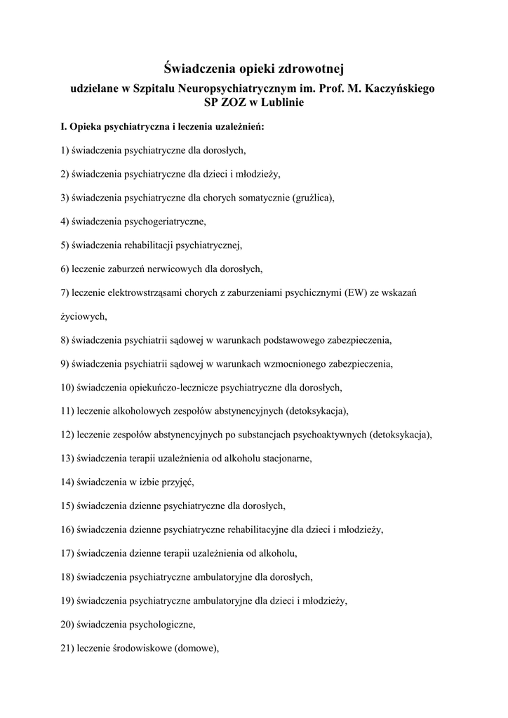 Świadczenia opieki zdrowotnej udzielane w Szpitalu Neuropsychiatrycznym im. Prof. M. Kaczyńskiego SP ZOZ w Lublinie I. Opieka psychiatryczna i leczenia uzależnień: 1) świadczenia psychiatryczne dla dorosłych, 2) świadczenia psychiatryczne dla dzieci i młodzieży, 3) świadczenia psychiatryczne dla chorych somatycznie (gruźlica), 4) świadczenia psychogeriatryczne, 5) świadczenia rehabilitacji psychiatrycznej, 6) leczenie zaburzeń nerwicowych dla dorosłych, 7) leczenie elektrowstrząsami chorych z zaburzeniami psychicznymi (EW) ze wskazań życiowych, 8) świadczenia psychiatrii sądowej w warunkach podstawowego zabezpieczenia, 9) świadczenia psychiatrii sądowej w warunkach wzmocnionego zabezpieczenia, 10) świadczenia opiekuńczo-lecznicze psychiatryczne dla dorosłych, 11) leczenie alkoholowych zespołów abstynencyjnych (detoksykacja), 12) leczenie zespołów abstynencyjnych po substancjach psychoaktywnych (detoksykacja), 13) świadczenia terapii uzależnienia od alkoholu stacjonarne, 14) świadczenia w izbie przyjęć, 15) świadczenia dzienne psychiatryczne dla dorosłych, 16) świadczenia dzienne psychiatryczne rehabilitacyjne dla dzieci i młodzieży, 17) świadczenia dzienne terapii uzależnienia od alkoholu, 18) świadczenia psychiatryczne ambulatoryjne dla dorosłych, 19) świadczenia psychiatryczne ambulatoryjne dla dzieci i młodzieży, 20) świadczenia psychologiczne, 21) leczenie środowiskowe (domowe), 22) świadczenia terapii uzależnienia od alkoholu i współuzależnienia, 23) świadczenia terapii uzależnienia od substancji psychoaktywnych innych niż alkohol. II. Leczenie szpitalne: 1) choroby wewnętrzne – hospitalizacja, 2) neurologia – hospitalizacja, 3) neurologia – hospitalizacja - leczenie udarów, 4) izba przyjęć, III. Rehabilitacja lecznicza: 1) rehabilitacja neurologiczna, 2) rehabilitacja ogólnoustrojowa w warunkach stacjonarnych, 3) rehabilitacja ogólnoustrojowa w ośrodku/oddziale dziennym, 4) fizjoterapia ambulatoryjna, 5) lekarska ambulatoryjna opieka rehabilitacyjna, IV. Ambulatoryjna opieka specjalistyczna: 1) świadczenia w zakresie neurologii, 2) świadczenia w zakresie logopedii, 3) świadczenia w zakresie chirurgii ogólnej, 4) diagnostyczne świadczenia kosztochłonne: badania tomografii komputerowej (TK), badania rezonansu magnetycznego (RM), badania endoskopowe przewodu pokarmowego – gastroskopia,
