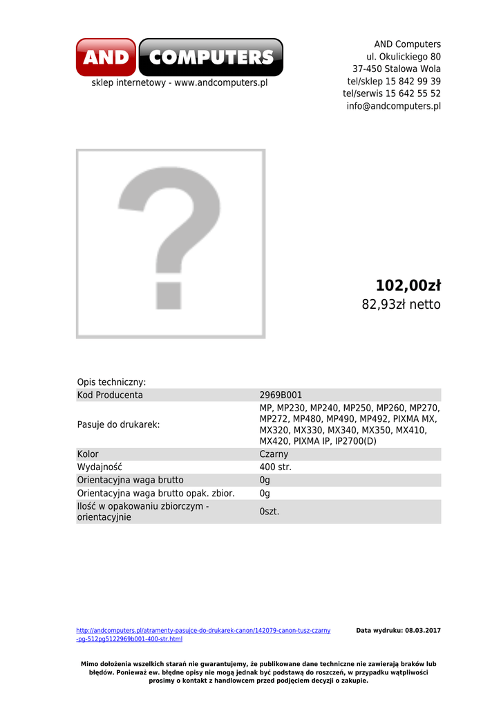 sklep internetowy - www.andcomputers.pl AND Computers ul. Okulickiego 80 37-450 Stalowa Wola tel/sklep 15 842 99 39 tel/serwis 15 642 55 52 [email protected] 102,00zł 82,93zł netto Opis techniczny: Kod Producenta Pasuje do drukarek: Kolor Wydajność Orientacyjna waga brutto Orientacyjna waga brutto opak. zbior. Ilość w opakowaniu zbiorczym orientacyjnie 2969B001 MP, MP230, MP240, MP250, MP260, MP270, MP272, MP480, MP490, MP492, PIXMA MX, MX320, MX330, MX340, MX350, MX410, MX420, PIXMA IP, IP2700(D) Czarny 400 str. 0g 0g 0szt. http://andcomputers.pl/atramenty-pasujce-do-drukarek-canon/142079-canon-tusz-czarny -pg-512pg5122969b001-400-str.html Data wydruku: 08.03.2017 Mimo dołożenia wszelkich starań nie gwarantujemy, że publikowane dane techniczne nie zawierają braków lub błędów. Ponieważ ew. błędne opisy nie mogą jednak być podstawą do roszczeń, w przypadku wątpliwości prosimy o kontakt z handlowcem przed podjęciem decyzji o zakupie.