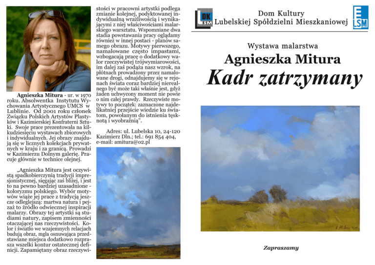 stości w pracowni artystki podlega zmianie kolejnej, podyktowanej in dywidualną wrażliwością i wynika jącymi z niej właściwościami malar skiego warsztatu. Wspomniane dwa stadia powstawania pracy oglądamy również w innej postaci planów sa mego obrazu. Motywy pierwszego, namalowane często impastami, wzbogacają pracę o dodatkowy wa lor rzeczywistej trójwymiarowości, im dalej zaś podąża nasz wzrok, na płótnach prowadzony przez namalo wane drogi, odnajdujemy się w rejo nach świata coraz bardziej niereal nego być może taki właśnie jest, gdyż żaden uchwycony moment nie powie o nim całej prawdy. Rzeczywiste mo tywy to początek: zaznaczone najde likatniej przejście wiedzie ku świa tom, powołanym do istnienia tęsk notą i wyobraźnią”. Dom Kultury Lubelskiej Spółdzielni Mieszkaniowej Wystawa malarstwa Agnieszka Mitura Kadr zatrzymany Agnieszka Mitura ur. w 1970 roku. Absolwentka Instytutu Wy chowania Artystycznego UMCS w Lublinie. Od 2001 roku członek Związku Polskich Artystów Plasty ków i Kazimierskiej Konfraterni Sztu ki. Swoje prace prezentowała na kil Adres: ul. Lubelska 10, 24120 kudziesięciu wystawach zbiorowych Kazimierz Dln.; tel.: 691 854 404, i indywidualnych. Jej obrazy znajdu email: [email protected] ją się w licznych kolekcjach prywat nych w kraju i za granicą. Prowadzi w Kazimierzu Dolnym galerię. Pra cuje głównie w technice olejnej. „Agnieszka Mitura jest oczywi stą spadkobierczynią tradycji impre sjonistycznej, sięgając zaś bliżej, i jest to na pewno bardziej uzasadnione koloryzmu polskiego. Wybór moty wów wiąże jej prace z tradycją jesz cze odleglejszą: martwa natura i pej zaż to źródło odwiecznej inspiracji malarzy. Obrazy tej artystki są stu diami natury, zapisem zmienności otaczającej nas rzeczywistości. Ko lor i światło we wzajemnych relacjach budują obraz, mgła osnuwająca przed stawiane miejsca dodatkowo rozpra sza wszelki kontur ostatecznej defi nicji. Zapamiętany obraz rzeczywi Zapraszamy Na ziemi wszystko jest nierucho me: wczepione, wrośnięte i osadzone. Zmienia się tylko punkt widzenia. Wy starczy jednak wznieść wzrok do gó ry… Przestwór, ale nie pustka, trwa tam nieustanny spektakl – w pozornym bez ruchu chmury wciąż przybierają nowe kształty, jakby wypełnione odrębnym, własnym życiem. Toczą się w ciszy i bez rozumnie, choć to tylko złudzenie, bo ten ciągły ruch, ciągłe formowanie się na nowo ma swój wewnętrzny porzą dek, tyle, że zrozumieć go nie sposób. Nie są atrybutem nieba, nie są atrybu tem ziemi. Zawieszone pomiędzy ni mi, wypełniają ogromną przestrzeń, choć dostrzega się je raczej przypad kiem, częściej cieszy ich brak. Nie przypadkiem jednak chmury maluje Agnieszka Mitura. W malar stwie to nie nowość, chmury malowa no od wieków, niekiedy, jak w obra zach holenderskich malarzy XVII wie ku, były często głównym motywem. Tam były jednak raczej wypełnieniem, istotne było zetknięcie się nieba i zie mi, linia horyzontu, którego wyznacza ła bezkres. Agnieszka Mitura maluje chmury w ich samoistnym bycie, ich milczącą trwałość i znikanie, ich upar ty trud i cierpliwość ciągłego przekształ cania się. Maluje ów porządek świata wciąż stwarzanego i wciąż przeobraża jącego się chmur. W malarstwie nie da przedstawić się ruchu, Agnieszka Mitura daje jego sugestię, światło w jej obrazach nie tyl ko wyodrębnia kształty chmur, ale wy łania ich ukrytą dynamikę, potencjał zmiany. Podobnie jest w przypadku rzeki, która pojawia się często w obrazach Agnieszki Mitury. I tu podobnie, jak dzieje się to z chmurami, rzeka staje się osobnym żywiołem, skupionym na sobie i istniejącym poza czasem, poza tym co dzieje się obok. To nie tylko kwestia obserwacji natury, przyziemność rzeki i podnieb ności chmur w obrazach Mitury two rzą naturę, której wewnętrzna zmien ność niweczy wszystkie zmiany ze wnętrzne. I paradoksalnie w tej zmienności odnaleźć można stałość, trwanie nie podlegające zmianom. I bodaj czy nie to przede wszyst kim pokazują obrazy Agnieszki Mitu ry. Także dzięki temu, że potrafi nadać chmurom w swoich obrazach material ność, choć cóż to za materia unosząca się nad ziemią, a materii rzeczywistej – wodzie, materialność odbiera, roz świetlając ją ukrytym jakby światłem. I w tym też jest paradoks, ale Agniesz ka Mitura nie akcentuje go, przeciw nie, ukrywa pod wspaniale skonstru owaną ze światła i koloru kompozycją swoich obrazów, przy dużej oszczęd ności, zgoła minimalizmie środków. Toteż są to obrazy niekończącego się przemijania, w którym nie ma zmiany. Dom Kultury Lubelskiej Spółdzielni Mieszkaniowej Wystawa malarstwa Agnieszka Mitura Kadr zatrzymany Dr Waldemar Odorowski Wernisaż odbędzie się w czwartek 19 listopada 2015 r. o godz. 17:30 w Galerii Sztuki Domu Kultury LSM w Lublinie, ul. K. Wallenroda 4a, tel. 81 743 48 29 www.domkulturylsm.pl W s t ę p w ol n y
